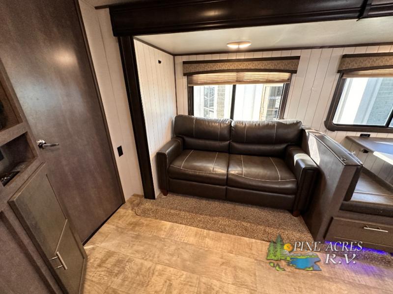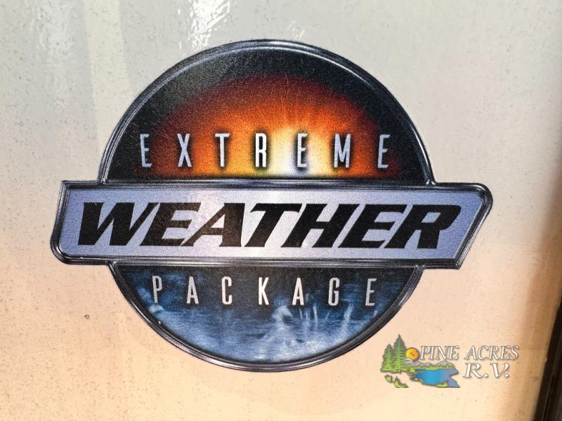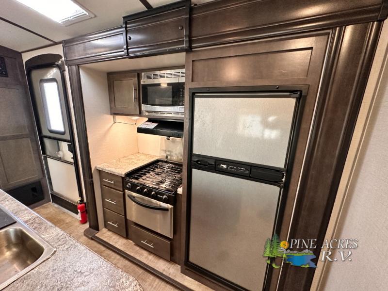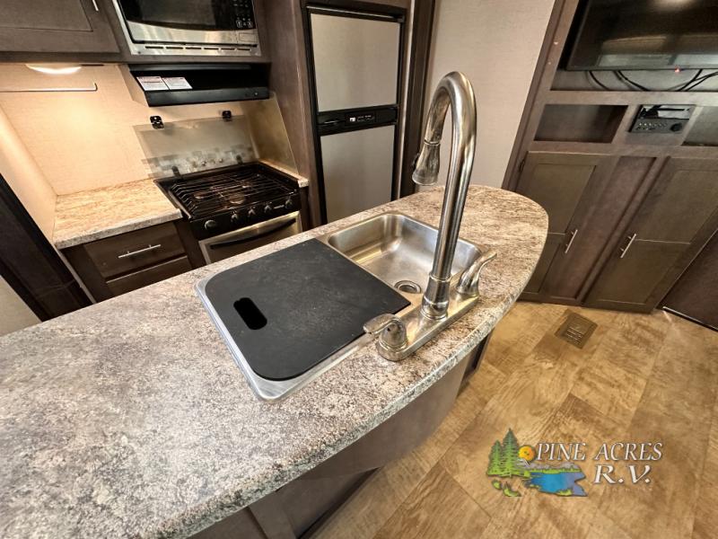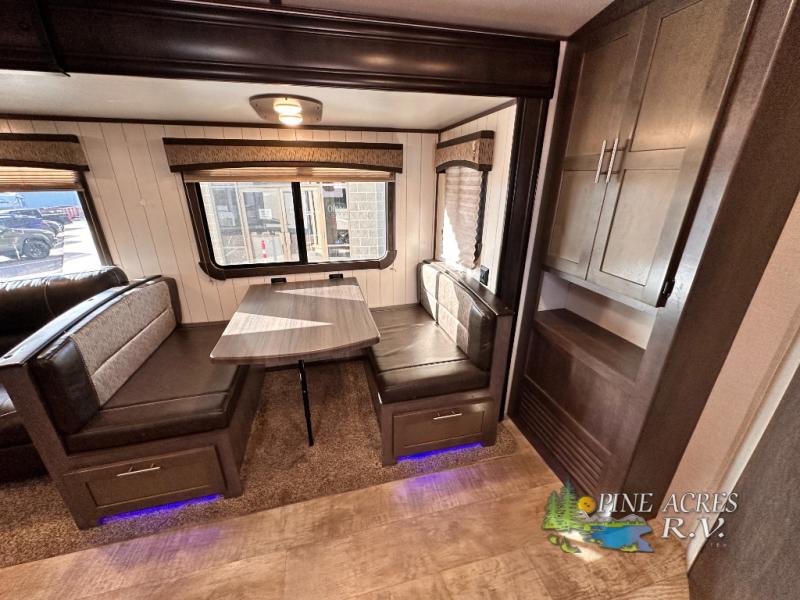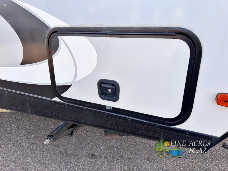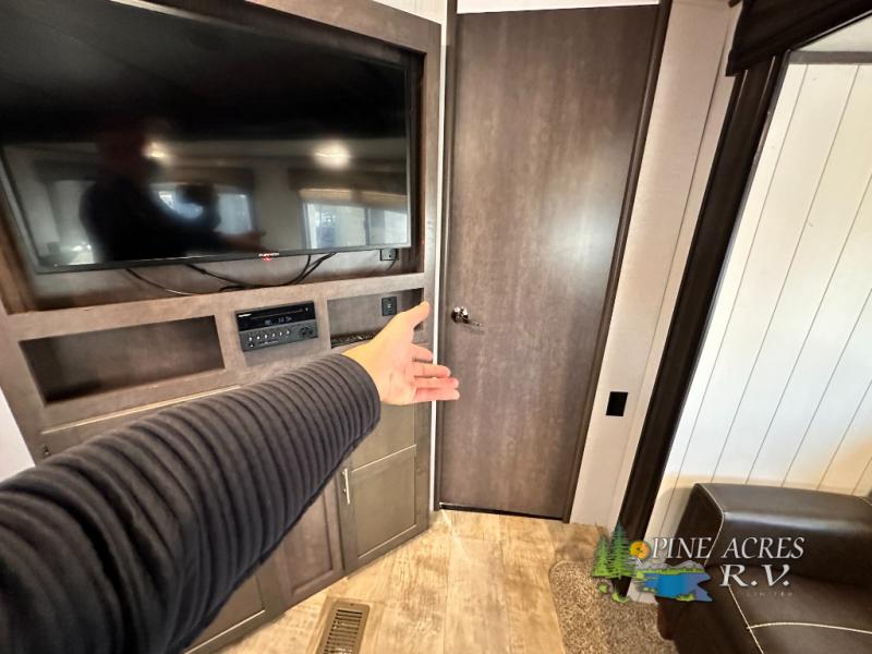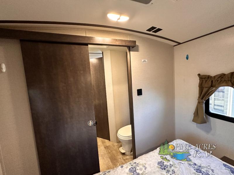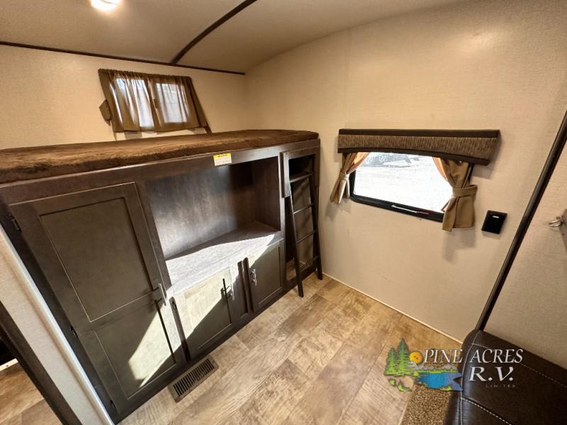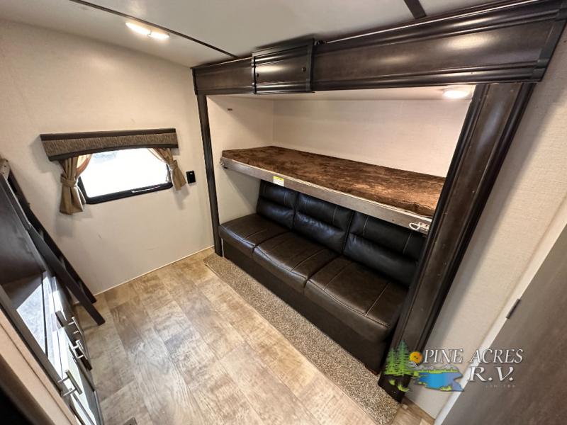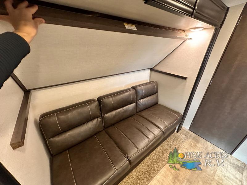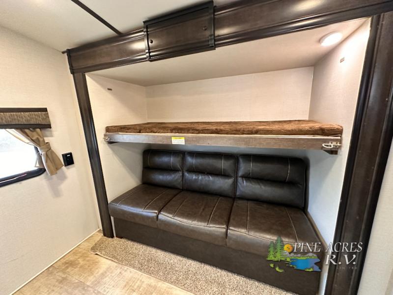 The rear of this Sunset Trail Super Lite provides a place that the kids are sure to appreciate. It is also a great space when spending time with camping guests. The private bunkhouse features a slide out jack-knife sofa with a 28" x 74" flip up bunk above along the road side. Opposite enjoy an entertainment center with storage, and another bunk above. There is a private half bath off the bunk room with its own private entry to the outside. Here you will find a toilet and vanity with sink.