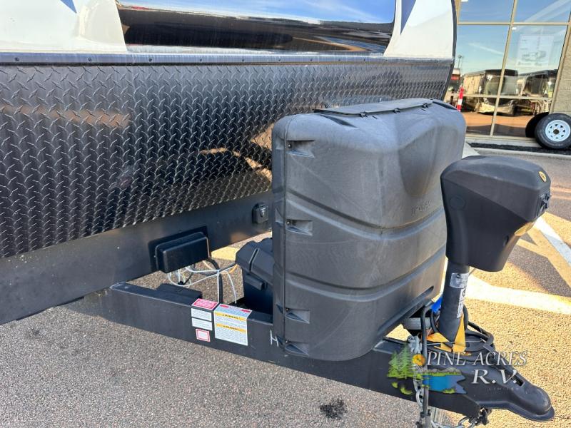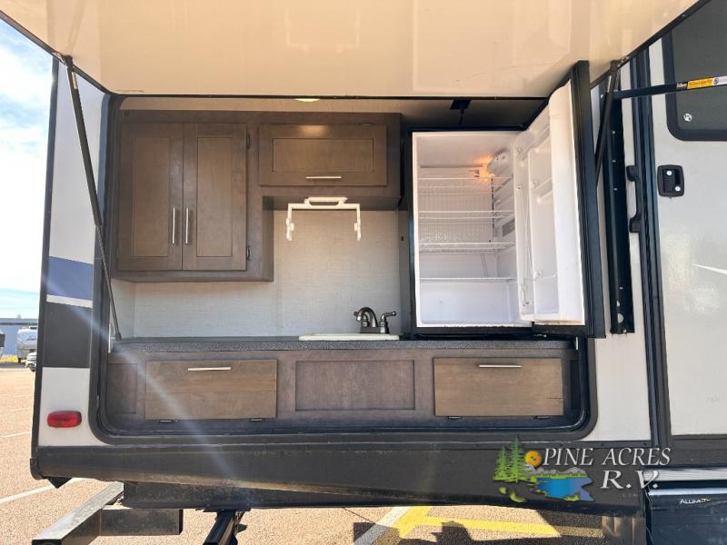 On the outside you will find a kitchen area beneath the curb side bunk. The exterior refrigerator allows you to keep drinks easily accessible, and there is also a single sink, plus so much more!