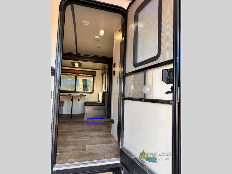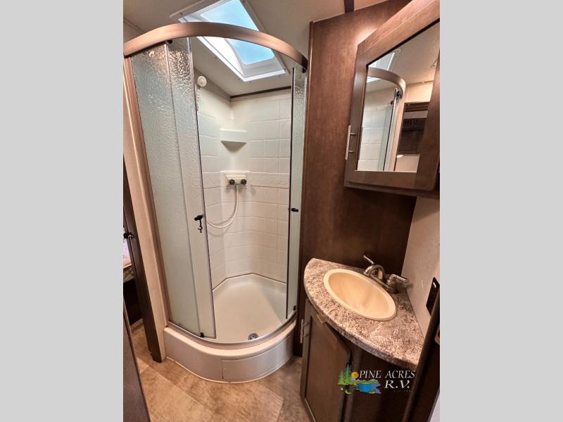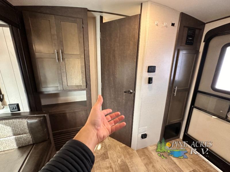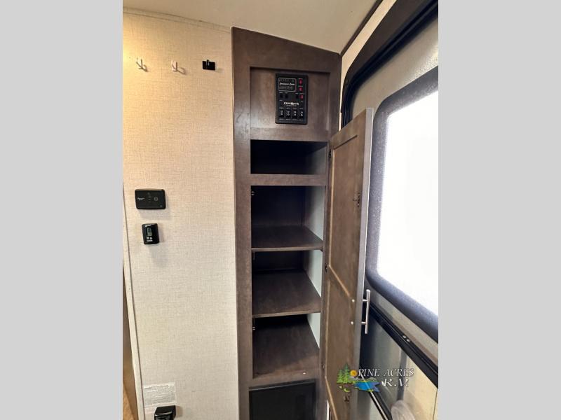 To the right of that same entry door you will find a handy closet for your coats and shoes. Around the corner toward the front there is a pantry just off the dinette slide, and the entrance into the walk-through complete bath which features a sink, corner shower, and toilet with linen/wardrobe storage above.