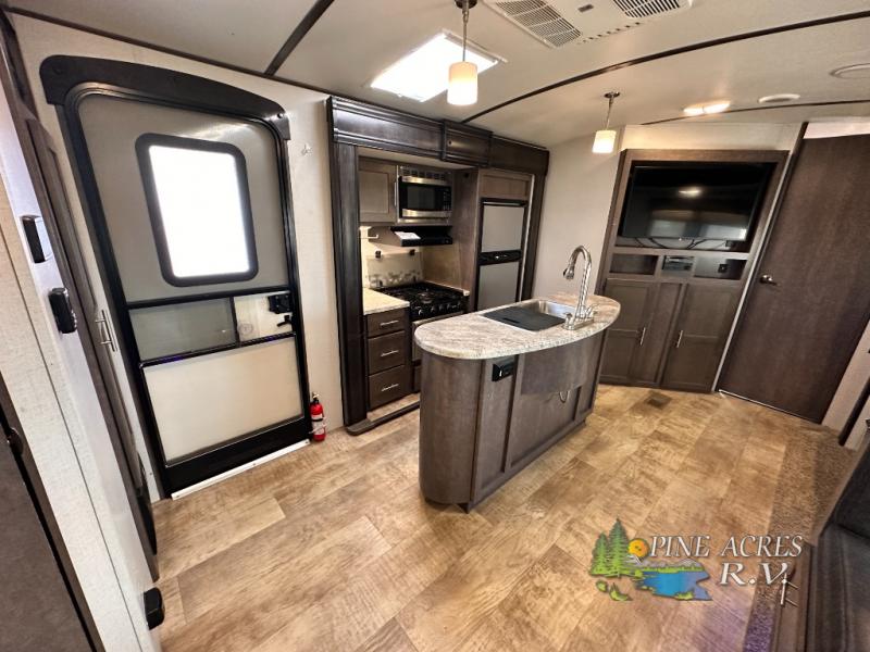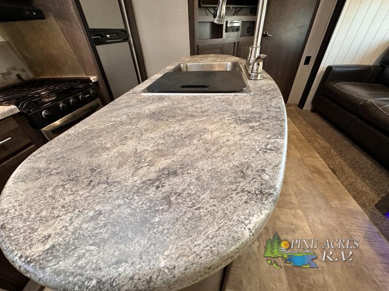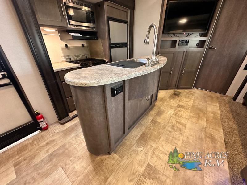 Step inside the entry door mid coach and find yourself in a spacious combined kitchen and living area featuring dual opposing slide outs. The slide to your immediate left offers a three burner range with overhead microwave oven, and a refrigerator, plus storage. There is an off center island featuring storage, plus counter space, and a double sink.