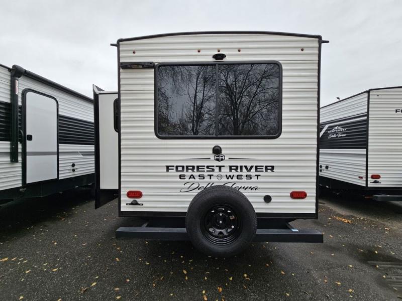 Each Della Terra travel trailer by EAST TO WEST is constructed with an enclosed and heated underbelly and enclosed holding tanks for added protection against the elements. There is also a power tongue jack with an LED light for easy set up and a power awning with LED lights you can rest under after you've unpacked. The Explore Comfort Package comes seamless pressed countertops, kitchen backsplash, window valance package with black night shades, and many more comforts. You will also appreciate the Adventure Outdoor Package with backup camera prep and solar prep, a tankless water heater, an RV grill quick disconnect, and a universal docking station with battery disconnect.
