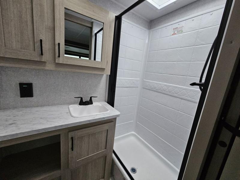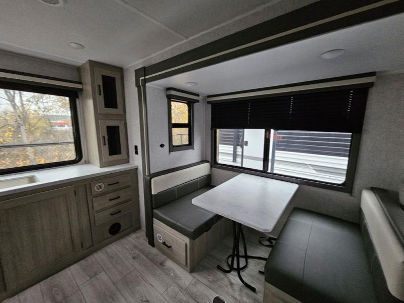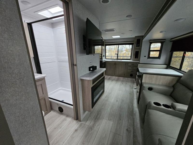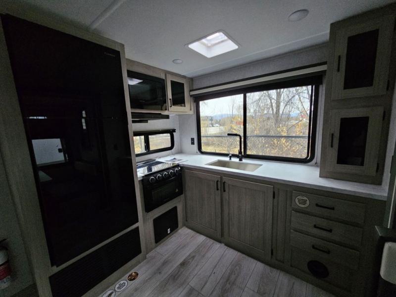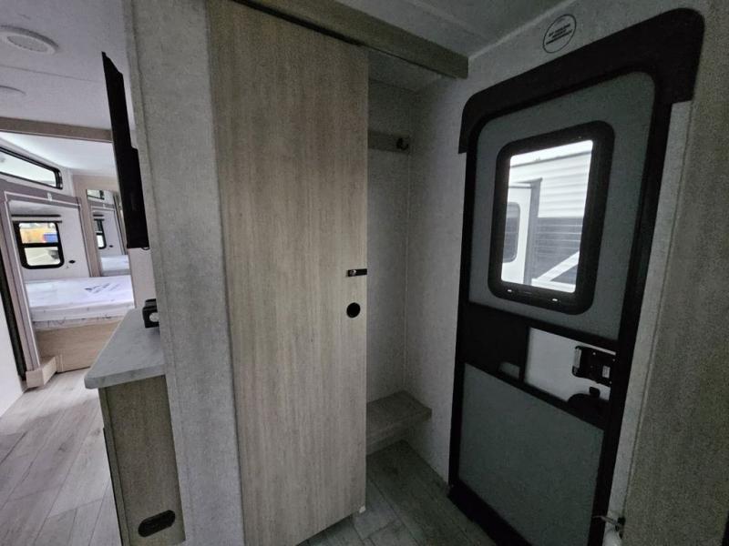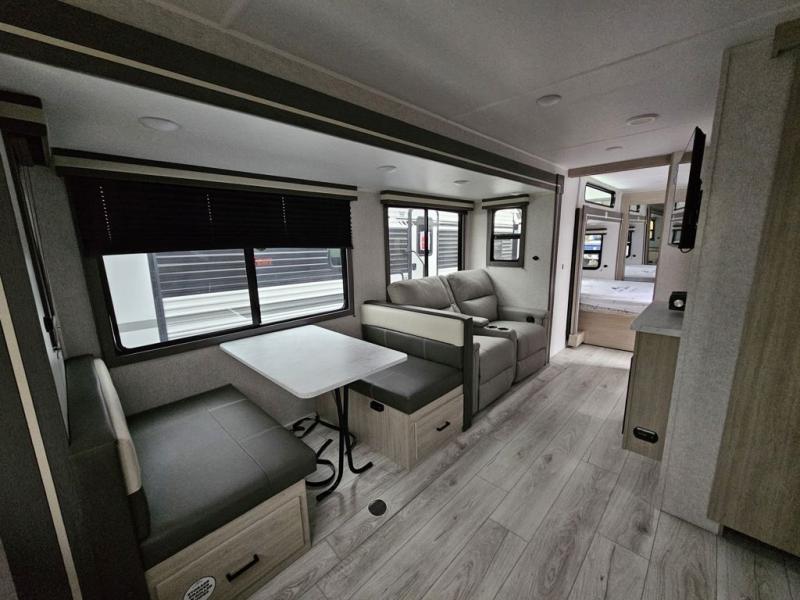 This travel trailer will feel just like home with its spacious interior and at-home comforts. Since there are dual entry doors, you can enter in through the front bedroom or the rear kitchen and living area. A king bed slide in the bedroom is sure to bring comfort, and there is a closet to keep your clothes wrinkle-free, plus washer and dryer prep. The second slide out is found in the living room, and here you can relax on the jiffy sofa or dine at the booth dinette. The chef of your group will love cooking in the rear kitchen, and there is generous counter space here to set out snacks. An entryway pantry and closet will provide additional storage for snacks, jackets, and more!