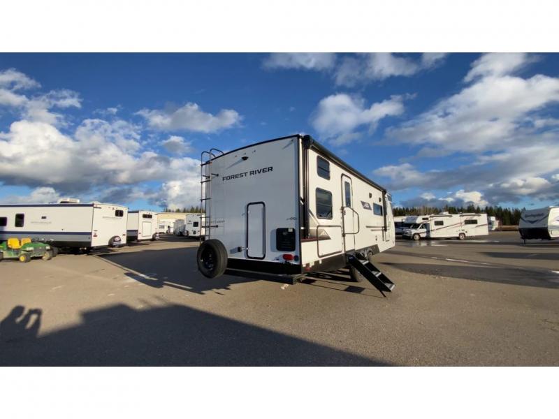 This is the ultimate family-friendly travel trailer thanks to the double-size bunks with bike storage in the back. A king bed in the front bedroom will make you feel right at home, plus there are dual wardrobes and dual nightstands for your things. The large slide out in the main living area won't leave you feeling confined, and the tri-fold sofa and booth dinette will provide comfortable seating space. The chef of your group can start lunch on the outside kitchen while the kids grab their scooters from the pass-through storage. And don't forget there is a universal docking station to quickly access your utilities when needed.