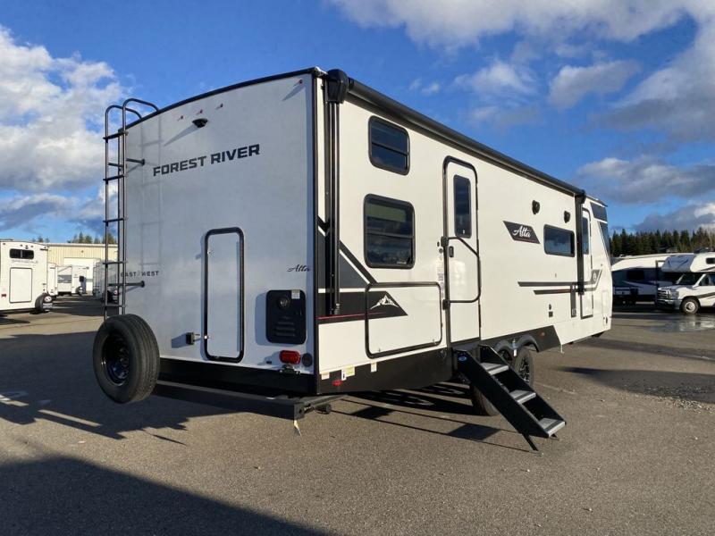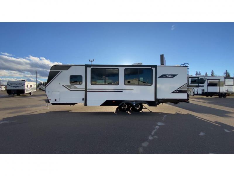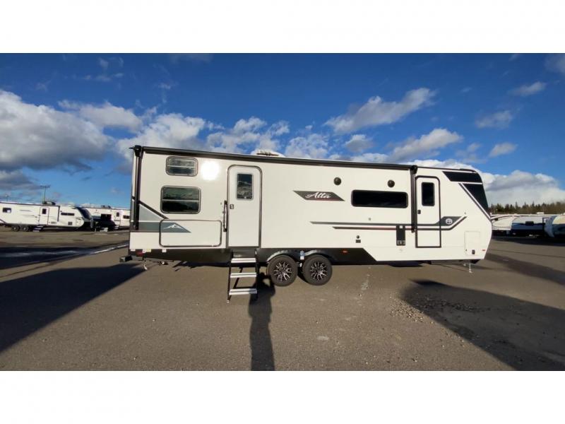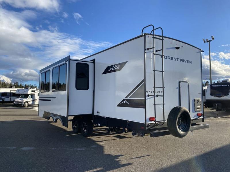 Each Alta travel trailer or toy hauler by EAST TO WEST is constructed with a 5" vacuum bonded roof, an enclosed and heated underbelly, and diamond plate front rock guard for added protection. Outside, you'll find marine-grade exterior speakers, a universal docking station, and back-up camera prep that can be added to make maneuvering in and out of campgrounds easier than ever. Inside, there are 4k interior LED lights, solid pressed membrane countertops, black roller shades, and many more interior comforts you are sure to love.
