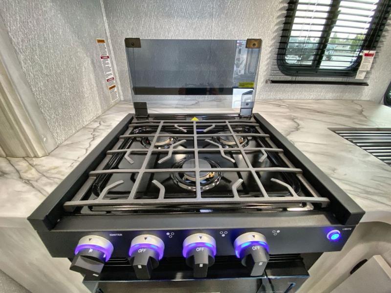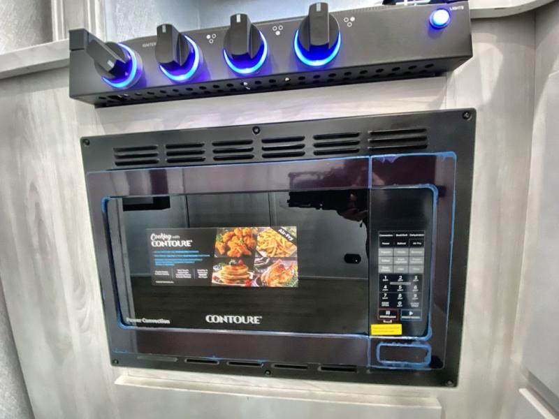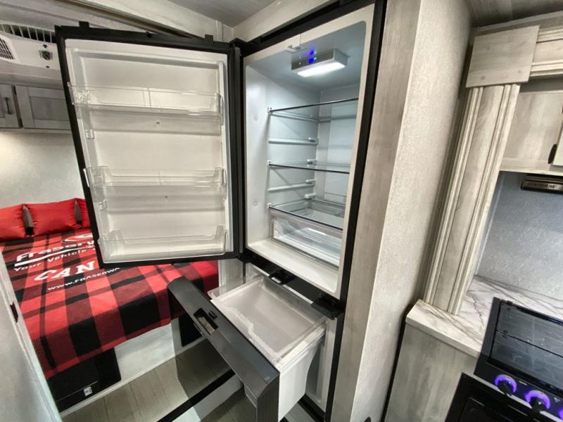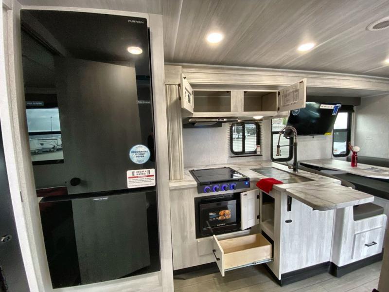 Inside, you’ll find a practical layout featuring a cab-over bunk for extra sleeping space, a dinette that converts into a bed, and a rear queen bed for added comfort. The kitchen area includes essential appliances like a cooktop, refrigerator, and microwave, while the bathroom is equipped with a full shower, toilet, and vanity for convenience.