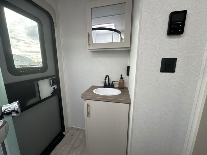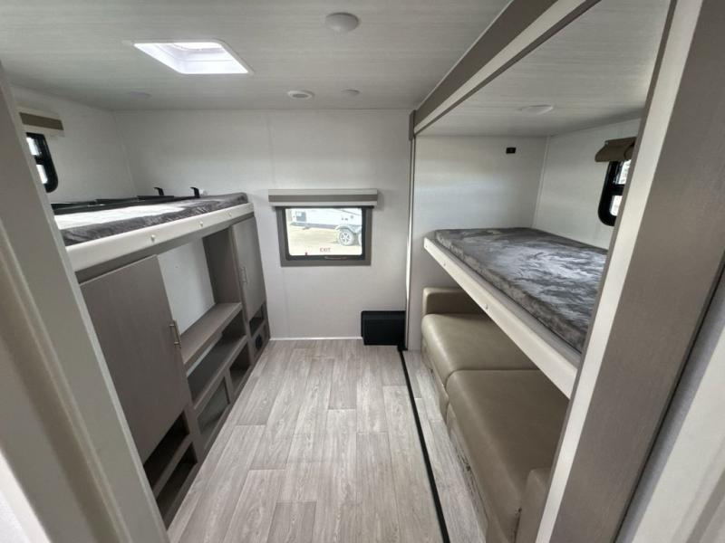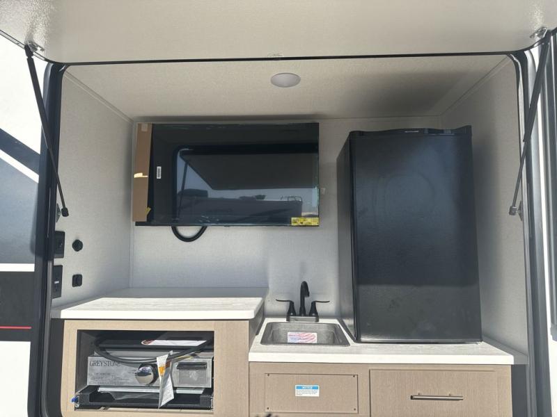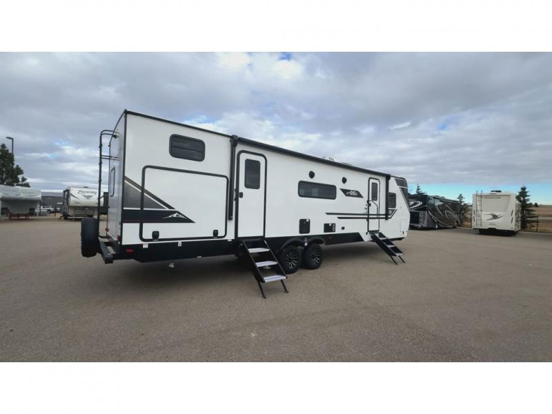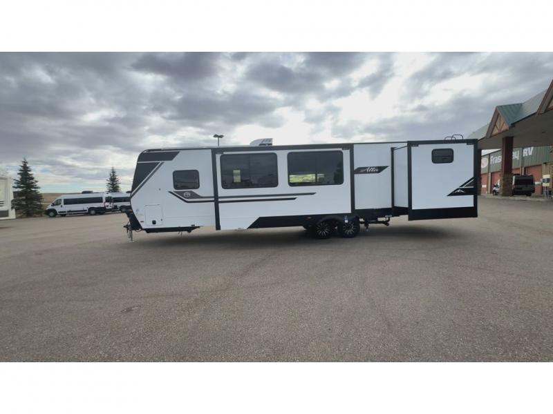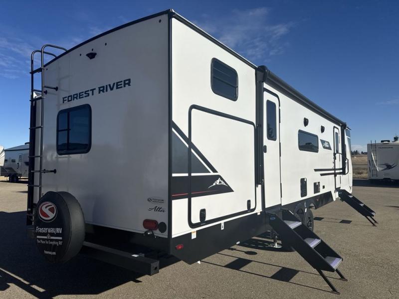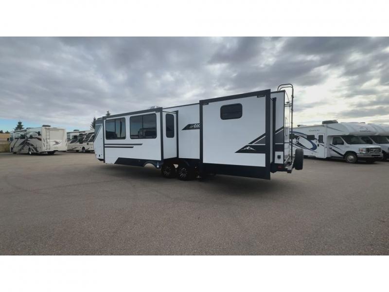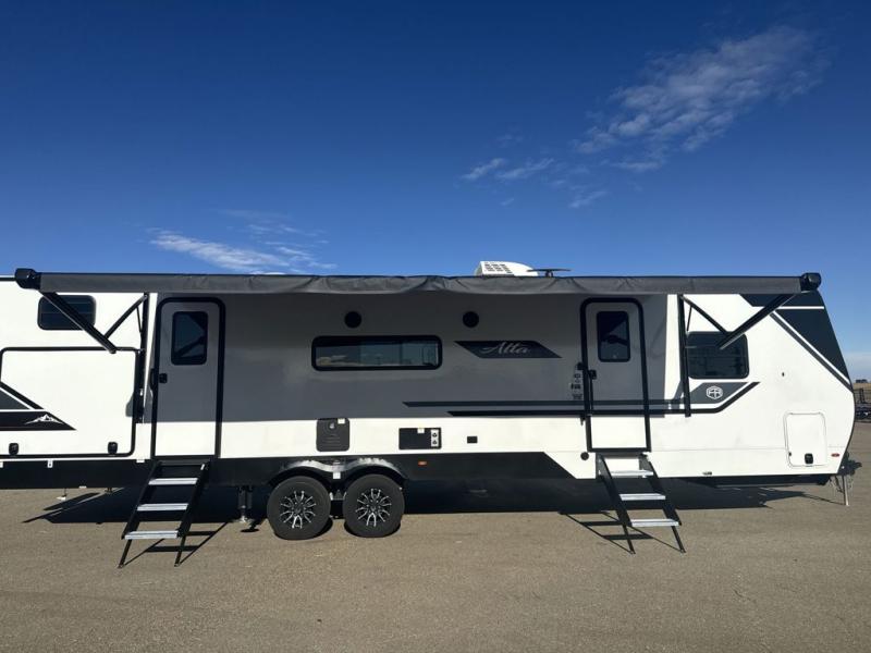 If you're looking for a travel trailer to take tailgating, this Alta model is the one! After you've unloaded the pass-through storage and set up the 21' power awning, start lunch on the outside kitchen! Since there are dual entry doors you can enter in through the main living area, or the full bath for convenience. The little ones are sure to spend most of their time in the rear bunkhouse that includes a flip-up bunk under the sofa, plus a second bunk across the room. The adults can visit at the booth dinette or on the tri-fold sofa, and check out the front private bedroom with sliding doors and a king bed for all-around comfort!