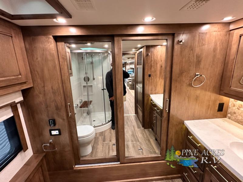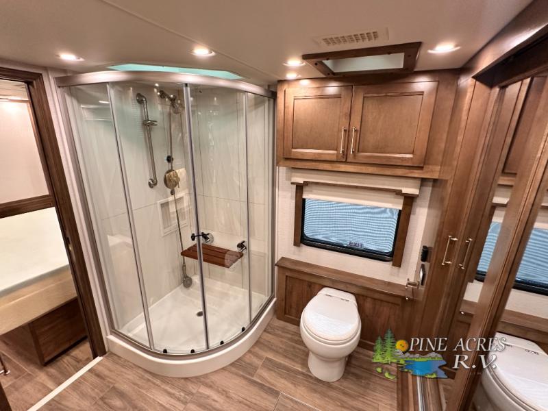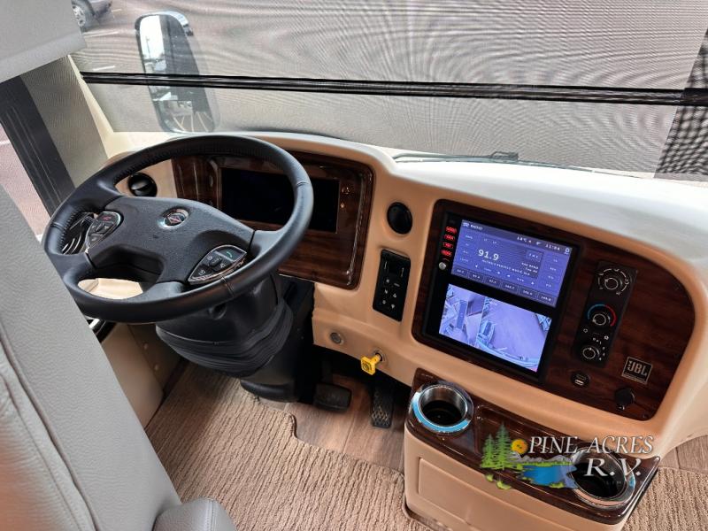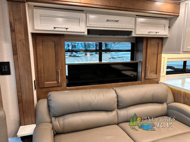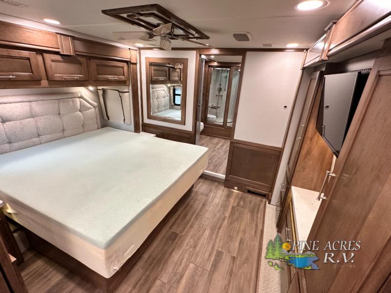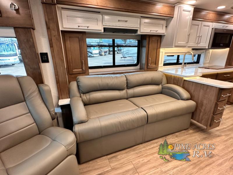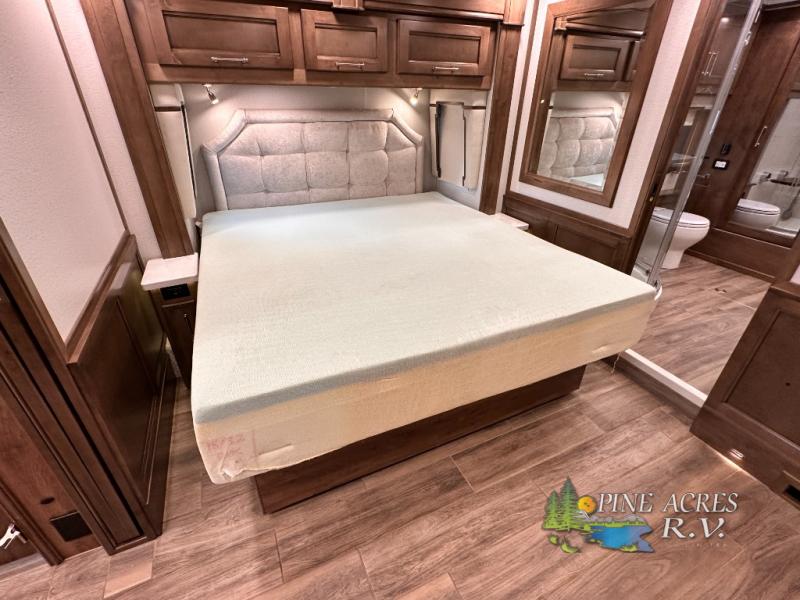 The Aspire Class A diesel motorhome by Entegra Coach starts with a Spartan K2 raised-rail chassis and a Cummins L9 turbocharged 450 HP engine to bring power to your adventures. The cockpit is packed with features to make each trip enjoyable, like the Xite XSG4 infotainment system, the E-Z Steer adjustable power steering assist, and the JBL premium audio 5-speaker sound system to crank up the highway tunes. Each model includes Aqua-Hot heated basement storage, three 15,000 BTU A/C units, an Onan 10,000-watt diesel generator, and many more hassle-free utilities. You will fall in love with the Aspire interior that features premium leather Villa furniture, solar day shades and blackout night shades, a textured porcelain tile shower with a skylight and clear glass door, and a large cedar-lined wardrobe in the bedroom.