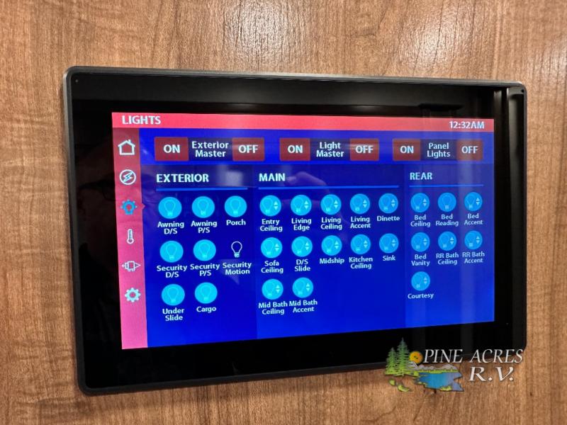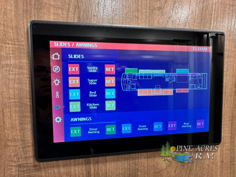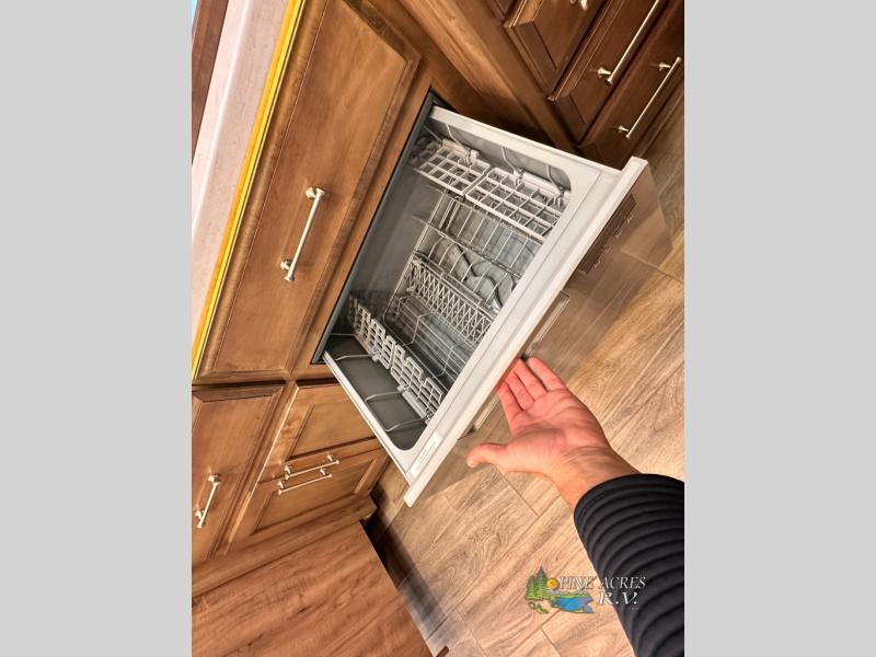 Four slides for tons of space, a full bath plus a half bath, and sleeping space for five make this coach a dream come true. Once you arrive at the campground, set up the power patio awnings while the kids ride their bikes. Everyone will enjoy the exterior 43" TV, plus there are three more TVs inside as well. Prepare lunch on the induction cooktop, or use the Whirlpool convection microwave. The kitchen also includes a Fisher and Paykel dishwasher, a deep drawer for a waste basket with an easy access trash chute, and a residential refrigerator with ice and water in the door. Mom and dad will sleep soundly on the slide out king bed, while the kids take the hide-a-bed sofa or the second sofa. Family vacations just got sweeter in this Aspire motorhome!