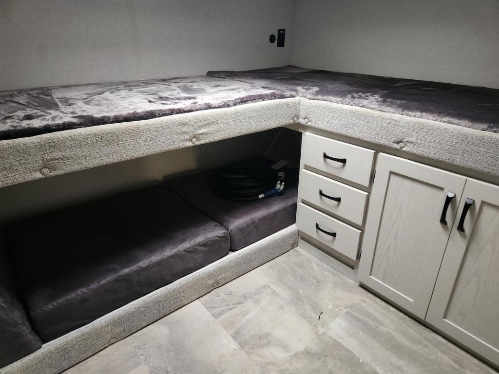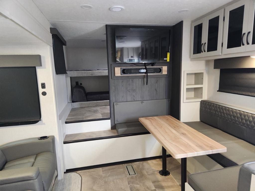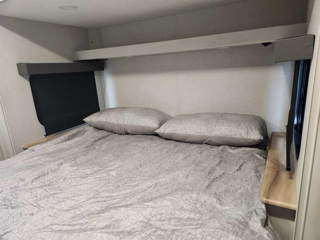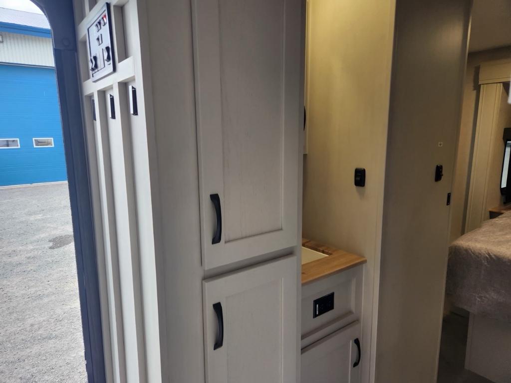 Longueur : 86 m (28 pi) Hauteur extérieure : 34 m (11 pi) PNBV : 3 888 kg (8 500 lb) Poids à sec : 3 288 kg (7 375 - 7 400 lb) Poids à l’attelage : 520 kg (1144 lb) Largeur hors tout : 24 m (96 po) Capacités Réservoir d’eau douce : 173 litres (40 gallons) Réservoir d’eaux grises : 135 litres (33 gallons) Couchages : Jusqu’à 7 personnes Extérieur Coulisses : 2 Auvent : Auvent électrique avec bande lumineuse LED et réglage de l’inclinaison Solaire : Pack Solar Source+ avec panneau solaire de 200 W monté sur le toit régulateur de charge et batterie marine Rangement : Coffre de rangement traversant avec portes à loquet Autres : Suspension Equa-Flex pare-chocs arrière avec attelage pour accessoires pré-équipement pour caméra de recul et de vision latérale Furrion prise de raccordement rapide pour propane Intérieur Aménagement : Chambre avec couchettes à l’avant salon en J Coin repas lit queen coulissant. Cuisine : Réfrigérateur GE 12 V de 38 m³ (10 pi³) four GE en acier inoxydable de qualité supérieure robinetterie de cuisine surélevée et micro-ondes en acier inoxydable. Séjour : Téléviseur LED intelligent 4K de 102 cm (40 po) avec barre de son stores occultants à enroulement progressif et sièges cinéma Thomas Payne en option. Salle de bain : Douche avec siège et grande armoire dans la chambre. Autres : Éclairage intérieur LED HD Clear View amélioré avec détecteurs de mouvement robinetterie de cuisine surélevée moderne et système audio Walnut amélioré.. Chambre enfants .