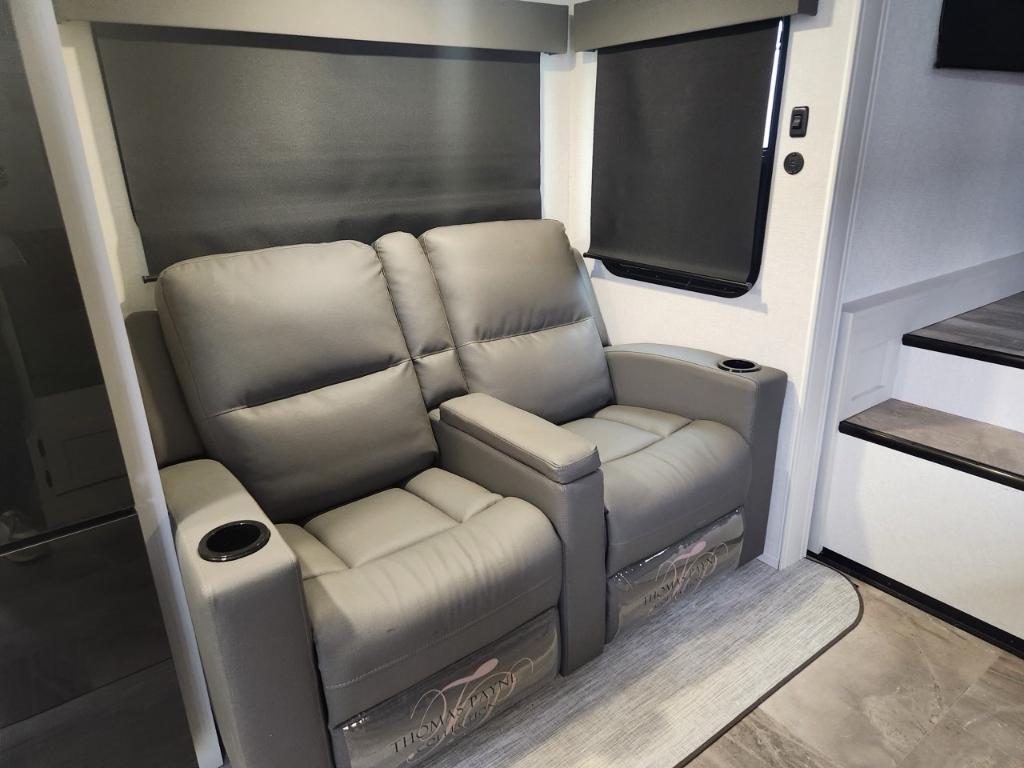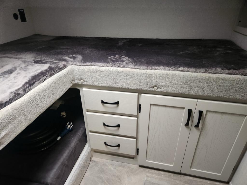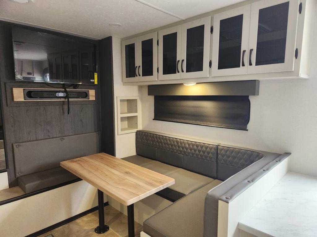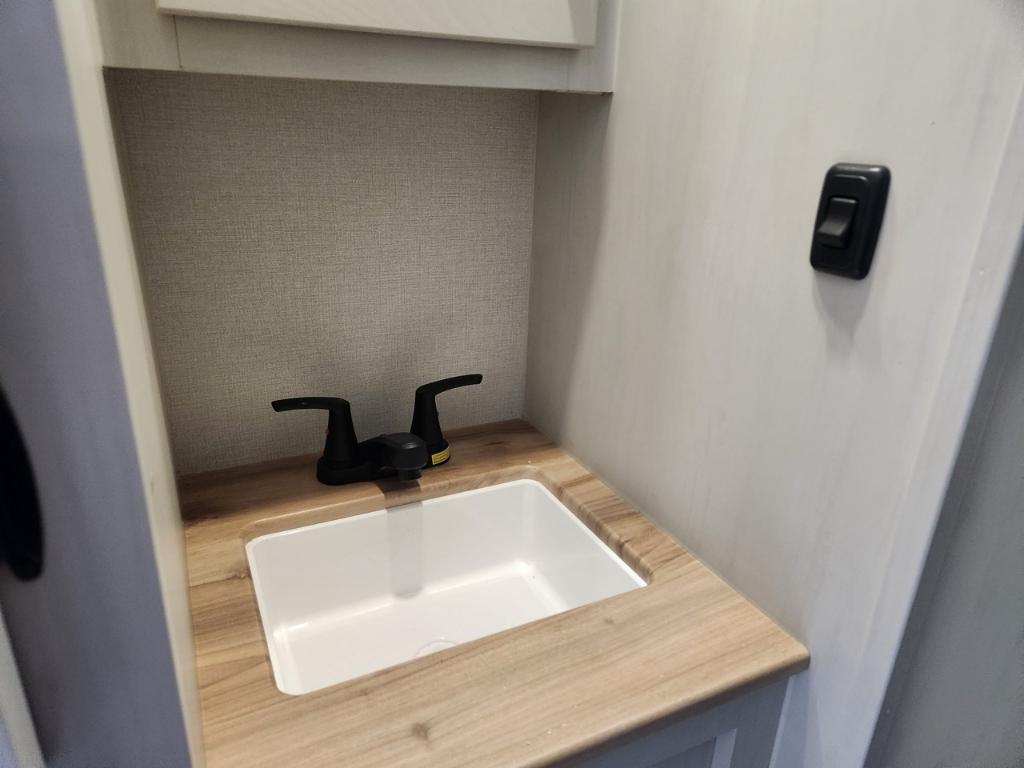 Longueur : 86 m (28 pi) Hauteur extérieure : 34 m (11 pi) PNBV : 3 888 kg (8 500 lb) Poids à sec : 3 288 kg (7 375 - 7 400 lb) Poids à l’attelage : 520 kg (1144 lb) Largeur hors tout : 24 m (96 po) Capacités Réservoir d’eau douce : 173 litres (40 gallons) Réservoir d’eaux grises : 135 litres (33 gallons) Couchages : Jusqu’à 7 personnes Extérieur Coulisses : 2 Auvent : Auvent électrique avec bande lumineuse LED et réglage de l’inclinaison Solaire : Pack Solar Source+ avec panneau solaire de 200 W monté sur le toit régulateur de charge et batterie marine Rangement : Coffre de rangement traversant avec portes à loquet Autres : Suspension Equa-Flex pare-chocs arrière avec attelage pour accessoires pré-équipement pour caméra de recul et de vision latérale Furrion prise de raccordement rapide pour propane Intérieur Aménagement : Chambre avec couchettes à l’avant salon en J Coin repas lit queen coulissant. Cuisine : Réfrigérateur GE 12 V de 38 m³ (10 pi³) four GE en acier inoxydable de qualité supérieure robinetterie de cuisine surélevée et micro-ondes en acier inoxydable. Séjour : Téléviseur LED intelligent 4K de 102 cm (40 po) avec barre de son stores occultants à enroulement progressif et sièges cinéma Thomas Payne en option. Salle de bain : Douche avec siège et grande armoire dans la chambre. Autres : Éclairage intérieur LED HD Clear View amélioré avec détecteurs de mouvement robinetterie de cuisine surélevée moderne et système audio Walnut amélioré.. Chambre enfants .