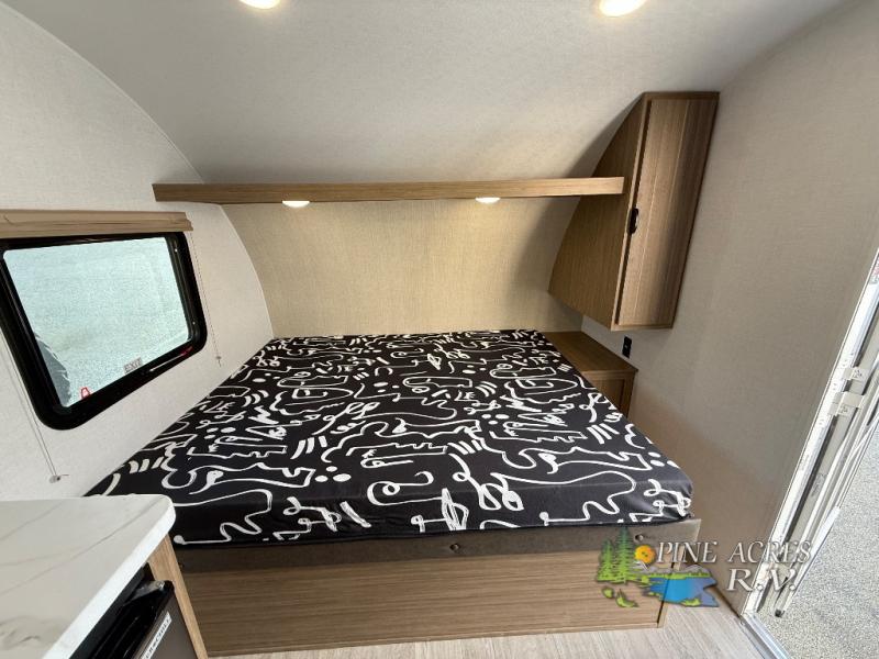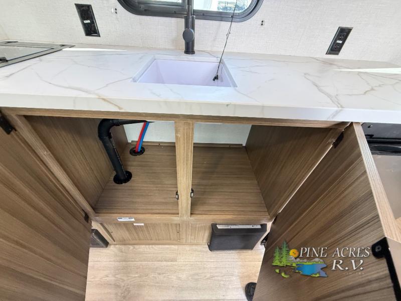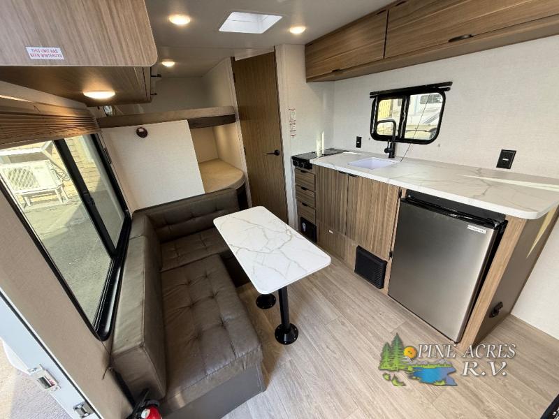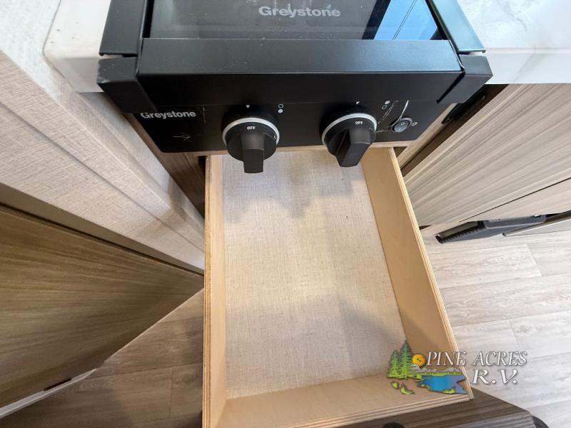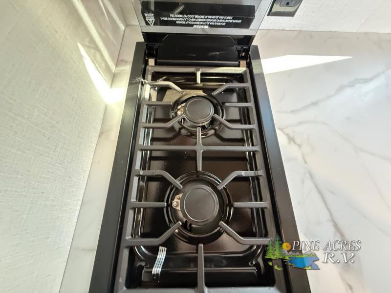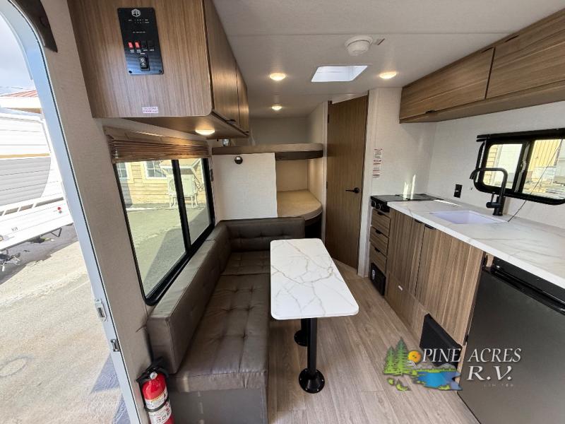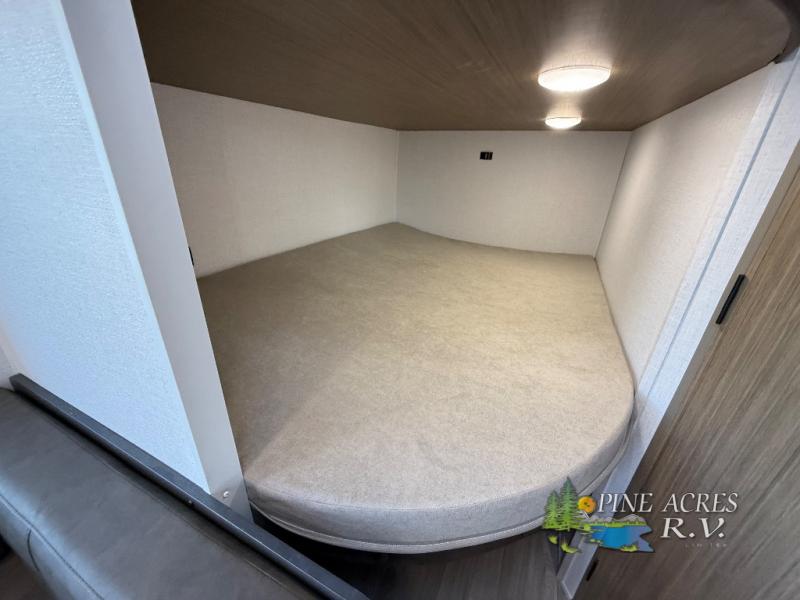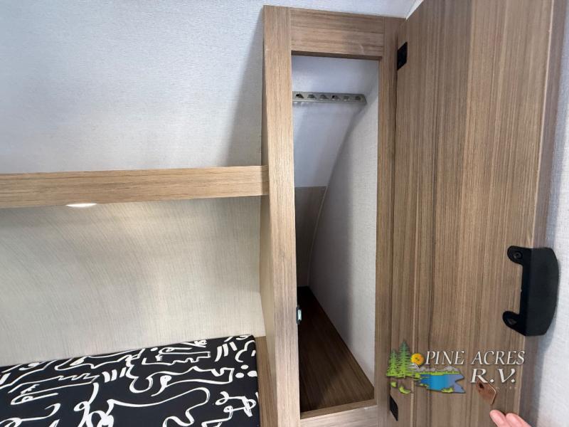 The double-size bunks with storage will be a big selling point in this travel trailer! While your guests take the bunks, you can have the front queen bed all to yourselves, and there is a wardrobe to keep your things organized. A two-burner cooktop and microwave will let you make meals each day, and you can dine at the open lounge with a table.