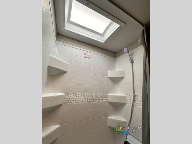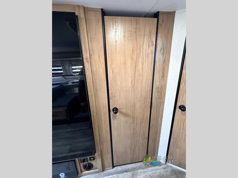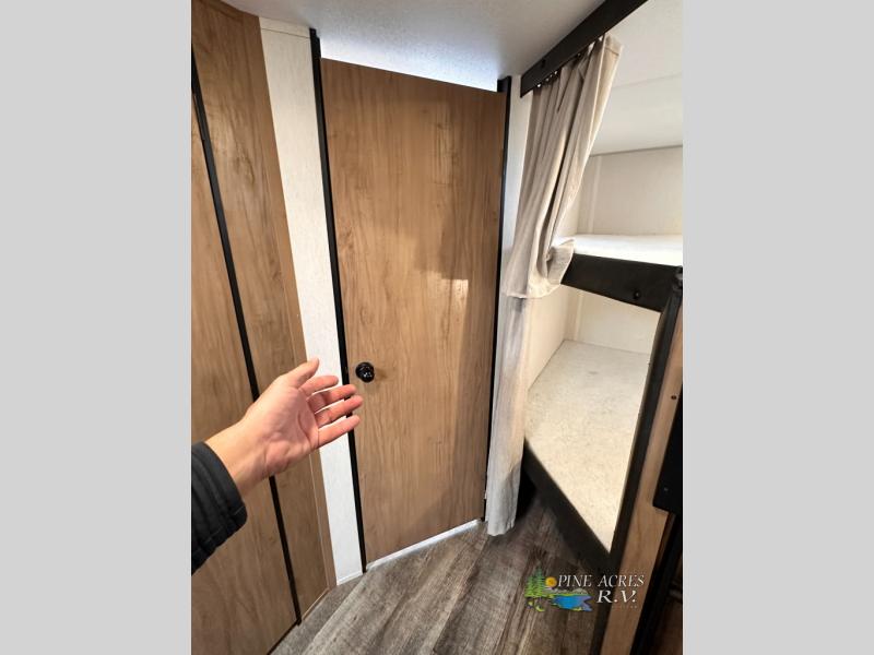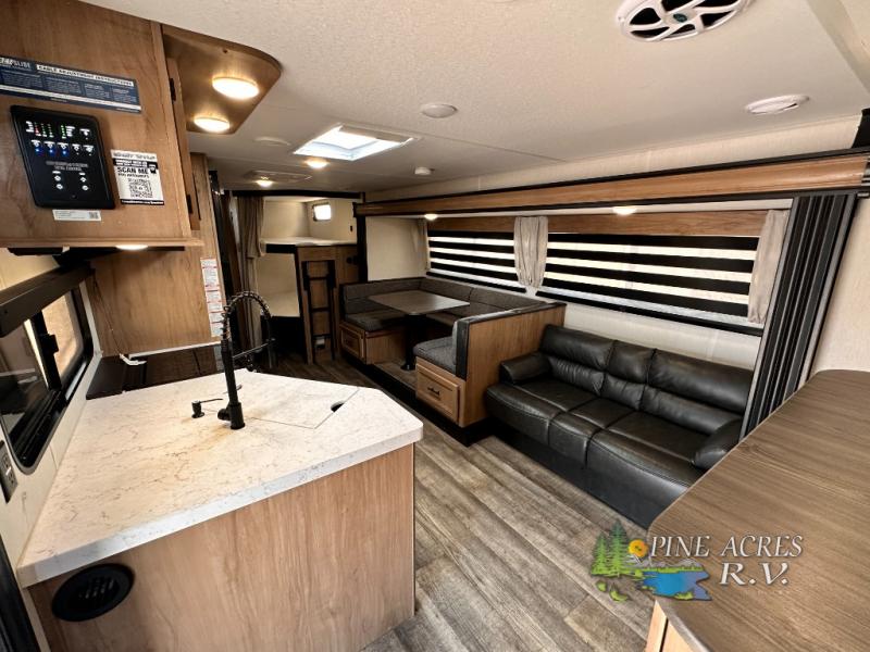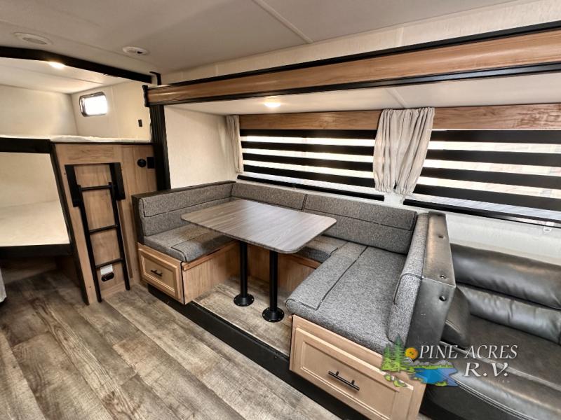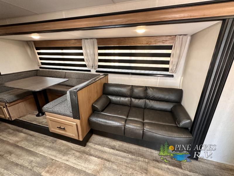 You will love the space provided in this dual entry Cherokee Grey Wolf travel trailer that has double-size bunks! The rear entry door leads right into the full bath allowing easy access from outside when you need to use the bathroom while you're enjoying the great outdoors. The large U-shaped dinette slide will not only seat everyone comfortably for a meal or a game, but since it also slides out, it opens up the interior even more to give you plenty of space for foot traffic. For all of your outdoor gear, you will find the outside storage compartments handy for stowing away your things when not in use. While the kids enjoy their bunk beds, you will enjoy a good night's rest in your queen bed with wardrobes on either side up in the front private bedroom!