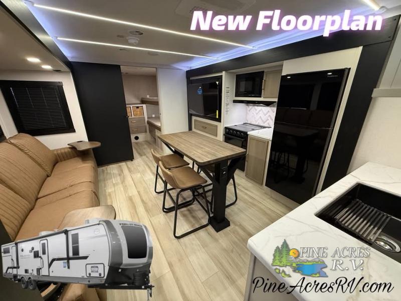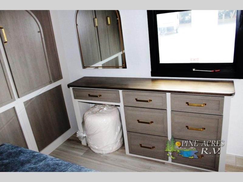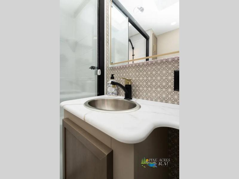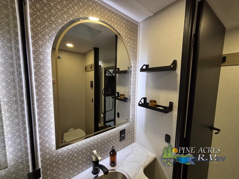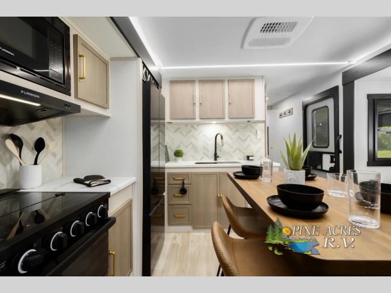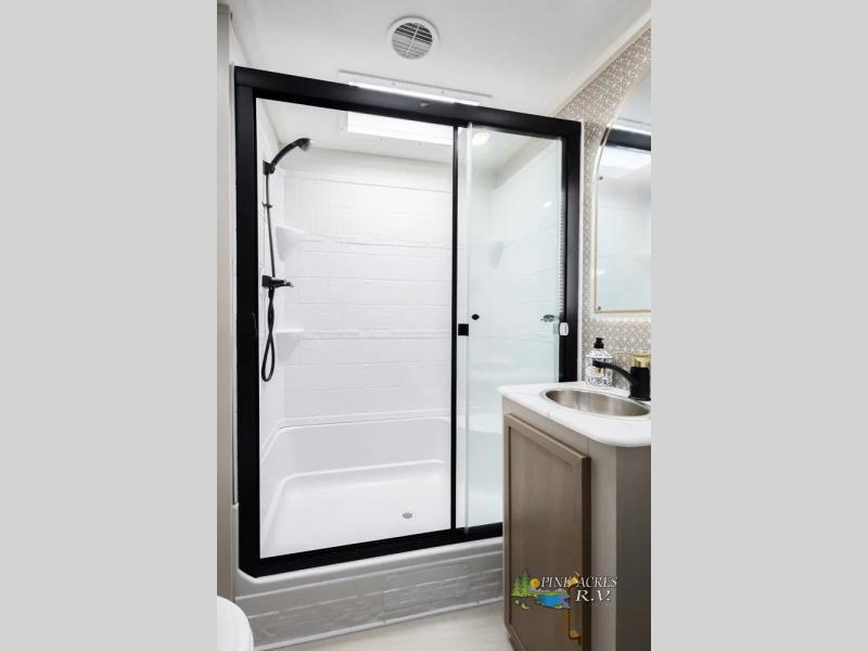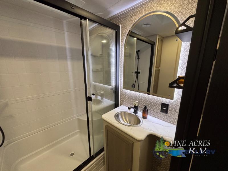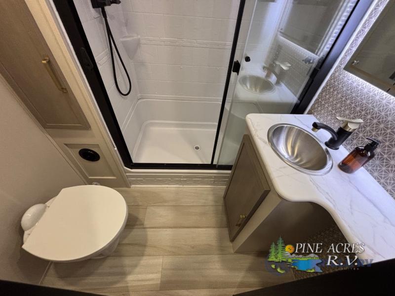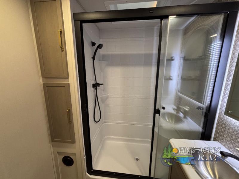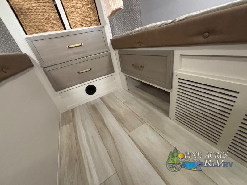 With any Wildwood Heritage Glen travel trailer by Forest River, the quality construction, attention to detail and design along with a bright and welcoming interior allows you to relax in comfort. Each model includes a WeatherShield one piece fiberglass roof, nitrogen-filled radial tires, and an enclosed underbelly with 12V tank heaters on all holding tanks for added protection. You will appreciate the on-demand tankless water heater, along with power stabilizer and tongue jacks, and an extra-large pass-thru storage with slam latch baggage doors. Head inside to enjoy matte gold hardware, wood door casings in place of plastic door casings, and an ultimate interior lighting upgrade with 4k puck/strip lights and a stylish LED back-lit bath mirror!