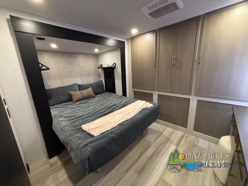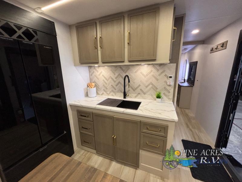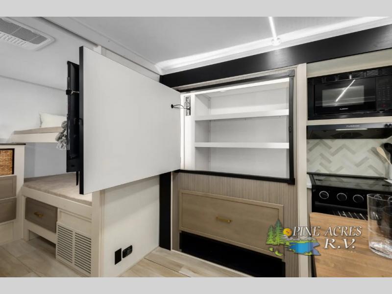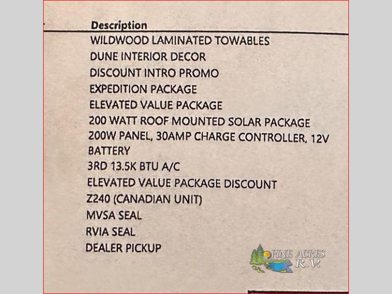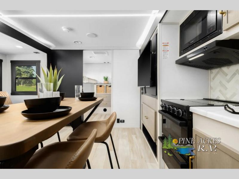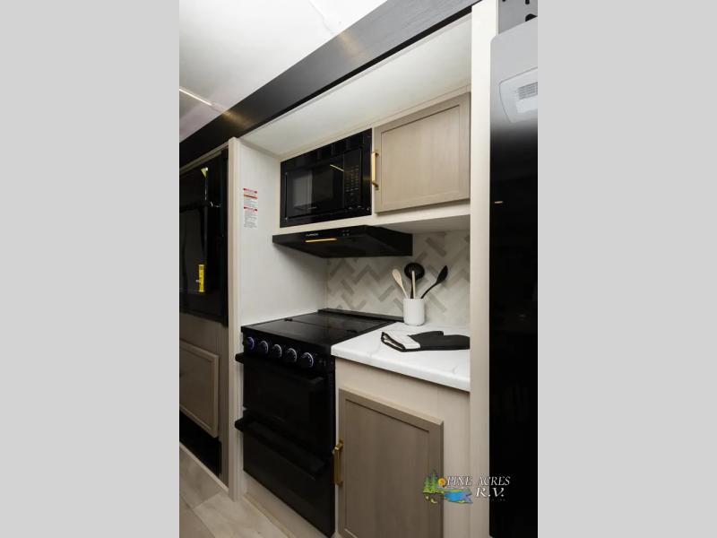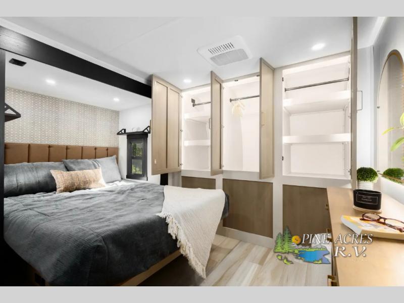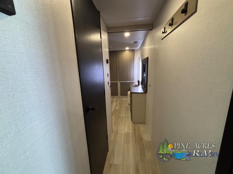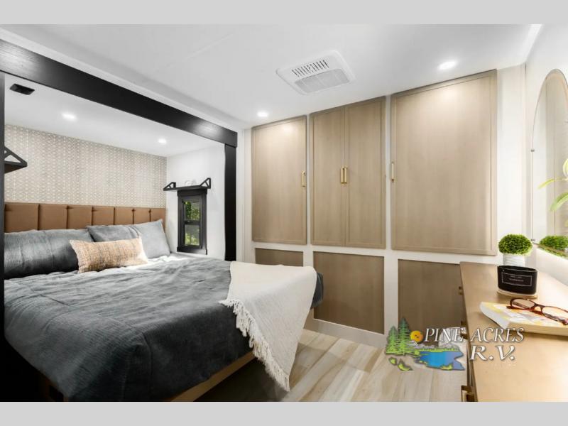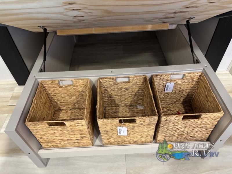 With any Wildwood Heritage Glen travel trailer by Forest River, the quality construction, attention to detail and design along with a bright and welcoming interior allows you to relax in comfort. Each model includes a WeatherShield one piece fiberglass roof, nitrogen-filled radial tires, and an enclosed underbelly with 12V tank heaters on all holding tanks for added protection. You will appreciate the on-demand tankless water heater, along with power stabilizer and tongue jacks, and an extra-large pass-thru storage with slam latch baggage doors. Head inside to enjoy matte gold hardware, wood door casings in place of plastic door casings, and an ultimate interior lighting upgrade with 4k puck/strip lights and a stylish LED back-lit bath mirror!