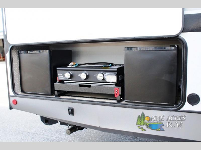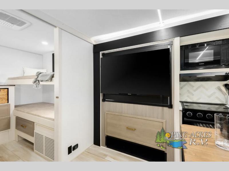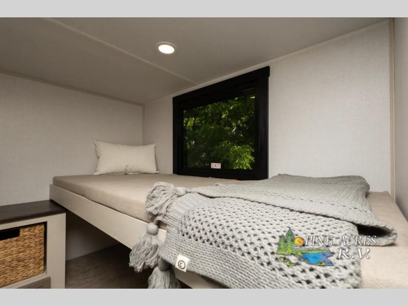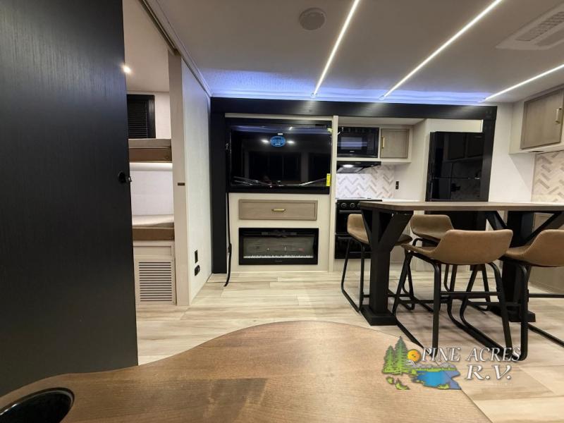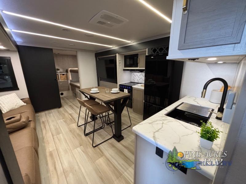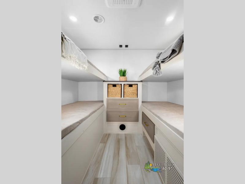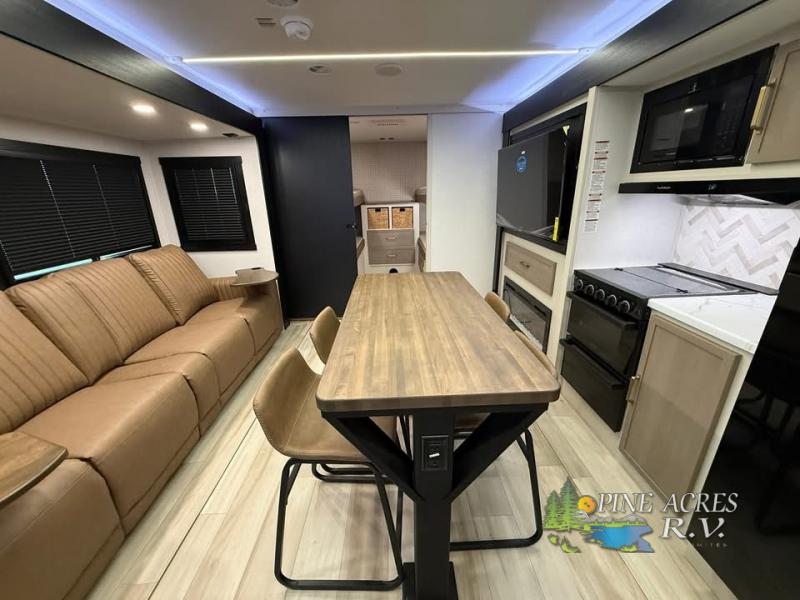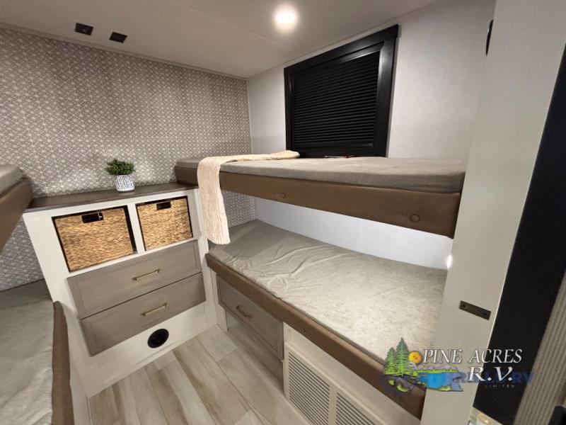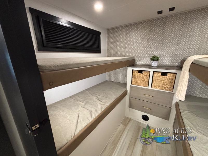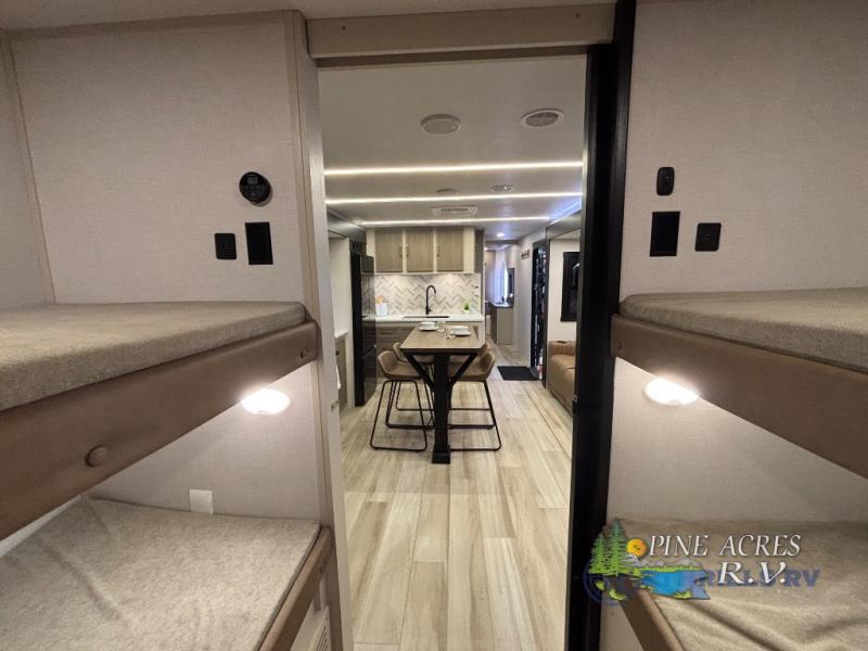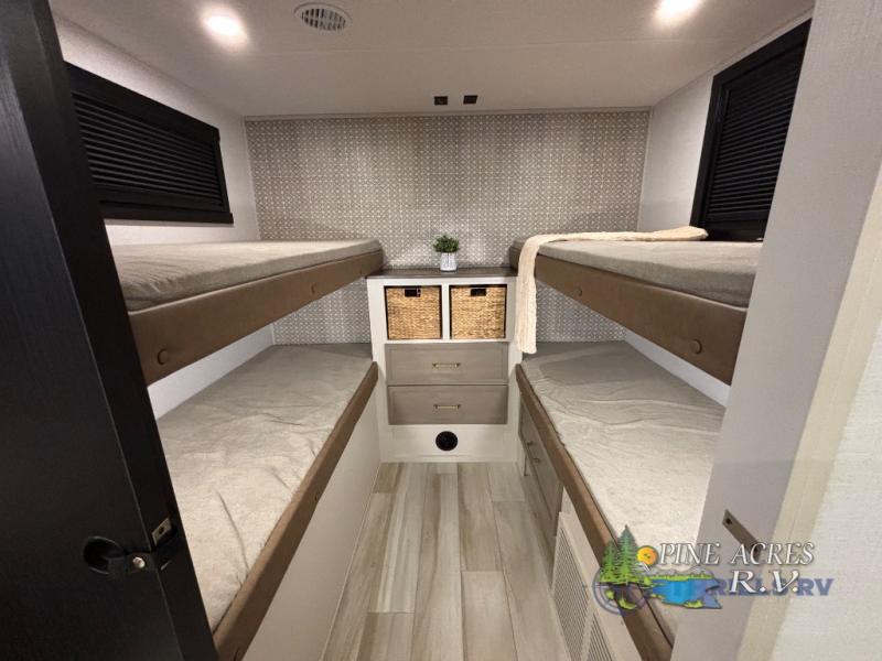 This is the perfect travel trailer if you enjoy camping with a larger group! The rear private bunkhouse includes four bunk beds plus a dresser to keep this space tidy. You'll have the queen bed slide out in the front bedroom all to yourselves, along with a dresser and an ottoman, plus a front wardrobe with washer/dryer prep. Everyone can meet in the combined kitchen and living area that includes spacious theater seating, a kitchen island with four chairs, full kitchen amenities, and dual opposing slides for more space!