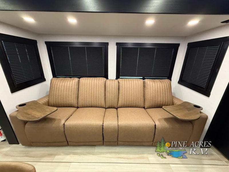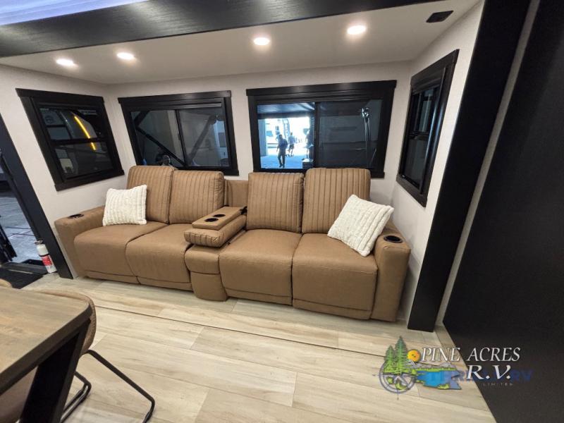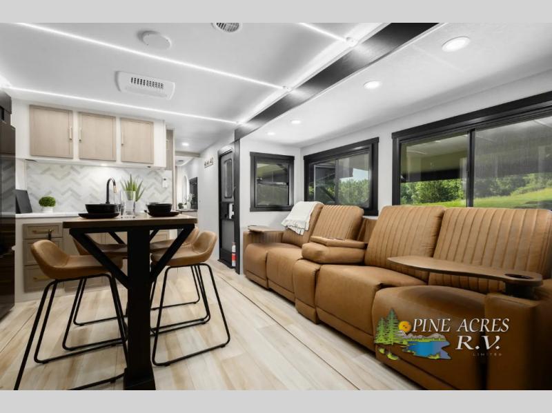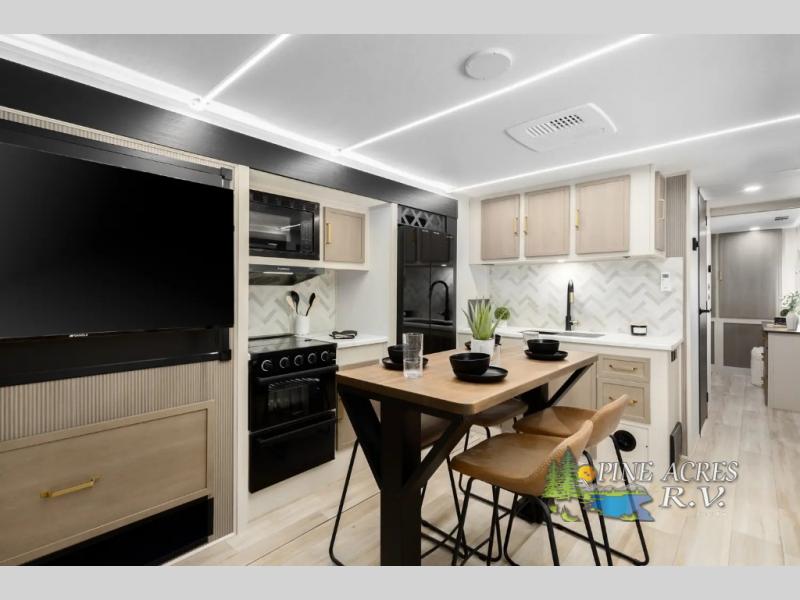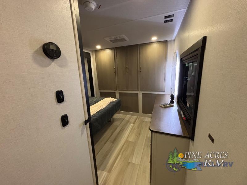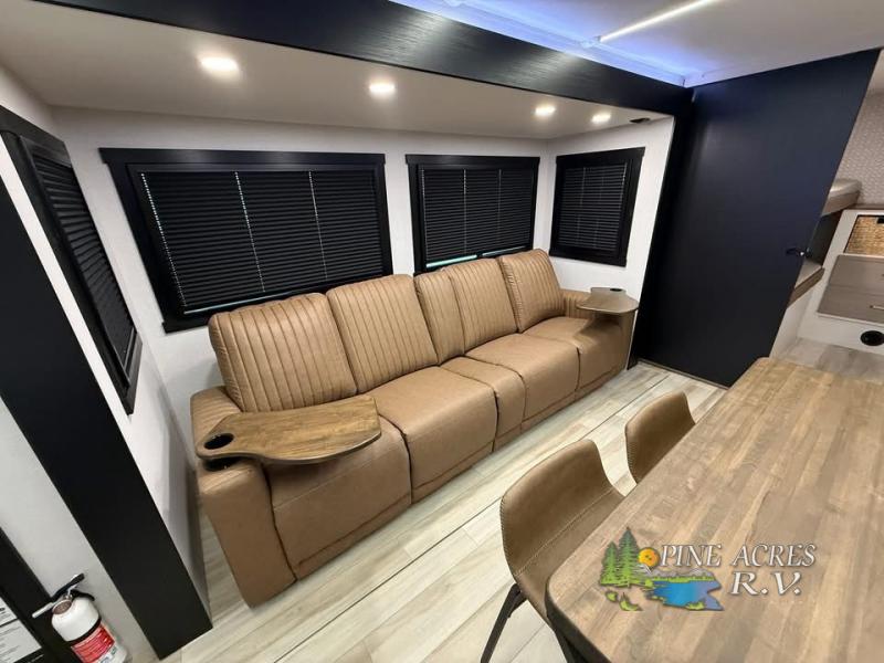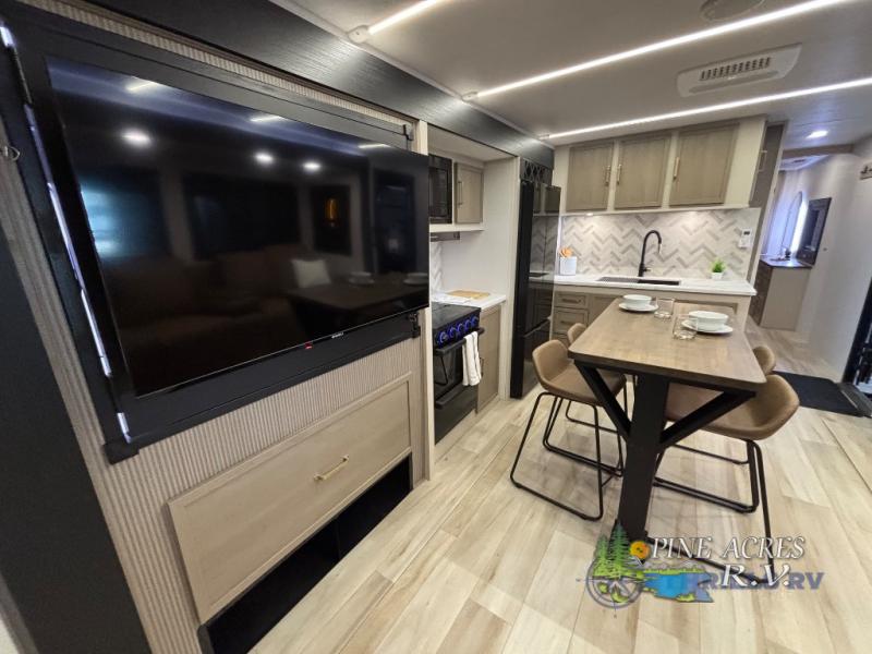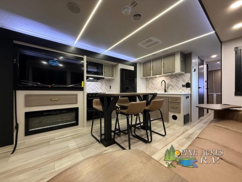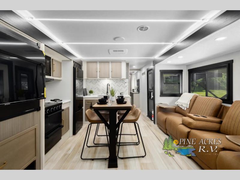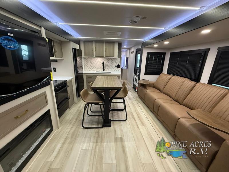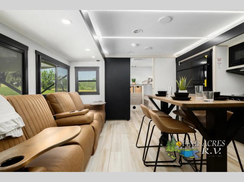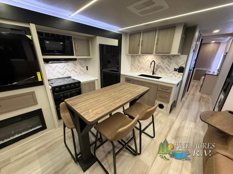 This is the perfect travel trailer if you enjoy camping with a larger group! The rear private bunkhouse includes four bunk beds plus a dresser to keep this space tidy. You'll have the queen bed slide out in the front bedroom all to yourselves, along with a dresser and an ottoman, plus a front wardrobe with washer/dryer prep. Everyone can meet in the combined kitchen and living area that includes spacious theater seating, a kitchen island with four chairs, full kitchen amenities, and dual opposing slides for more space!