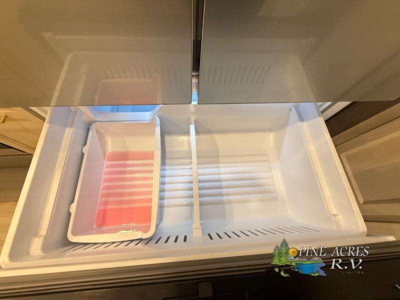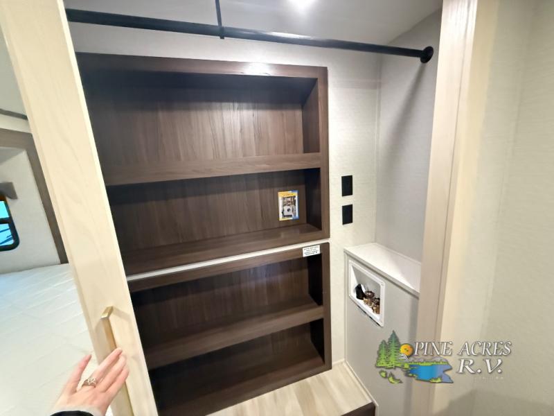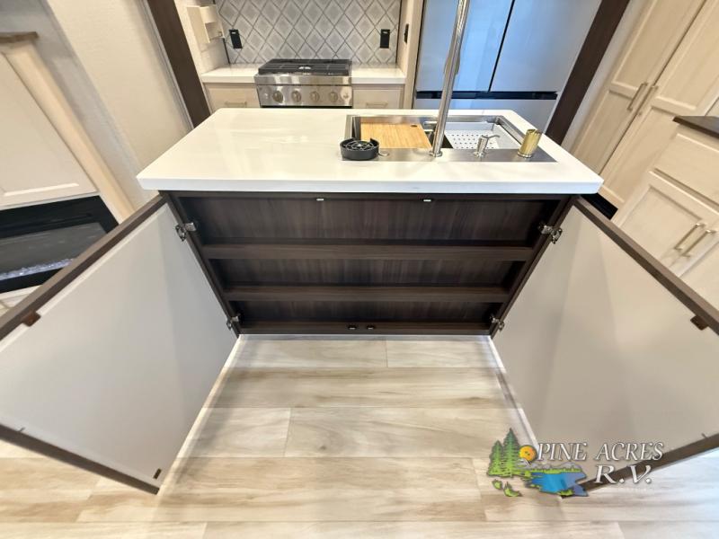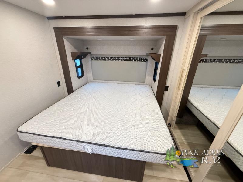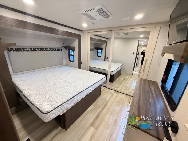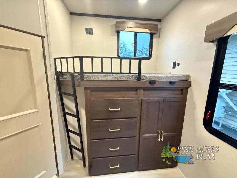 If you have a large group, this Cedar Creek Experience fifth wheel is for you. A rear bunkhouse offers tons of flexibility, with an upper bunk above a sofa on one side and a TV/drawer unit on the other. At the opposite end you have a private front bedroom with king bed, dresser, TV, and a sliding door closet that includes shelving and washer/dryer prep. A central kitchen is as nice as the one at home, with an 18 cu. ft. 12V refrigerator with an ice maker, a three burner cooktop, and a stainless steel 30" over-the-range microwave. There is also a center island with a large sink for easy clean up. You'll love to relax by the fireplace on the power theater seats, where you can watch either the TV or the fireplace - or both! Outside you'll find even more amenities including a 15' awning plus an outdoor refrigerator and microwave!