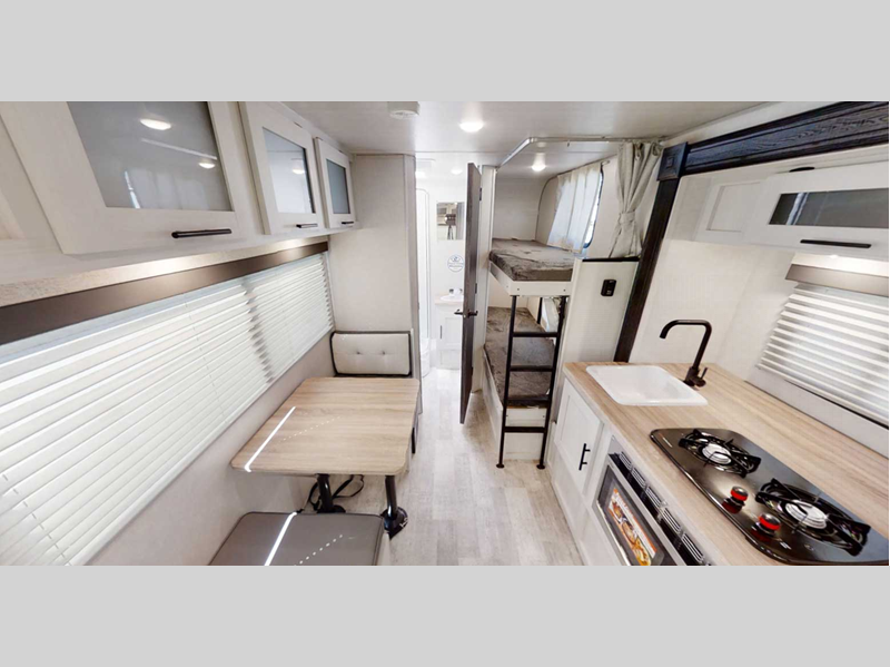 There won't be anything holding you back from a good time with this No Boundaries travel trailer! Whether it's a weekend away with the kids or a meaningful trip with your spouse, you'll have great comfort in this trailer with the RV queen bed up front and the bunk beds in the back. The bunks also have a flip-up adventure storage for extra gear, and you have more sleeping space once you fold the booth dinette into a bed. If you choose to spend your time outside, you'll love having an 11' awning to protect you, and there is a pass-through storage compartment to store your grilling sticks and fishing poles. Add the optional Un-Plugged package to take your camping experience to a whole new level. Some features included in this package are 600 watts of solar, premium Lithium-ion batteries, a 3,000 watt inverter charger, a high-efficiency A/C, and more.