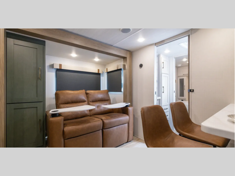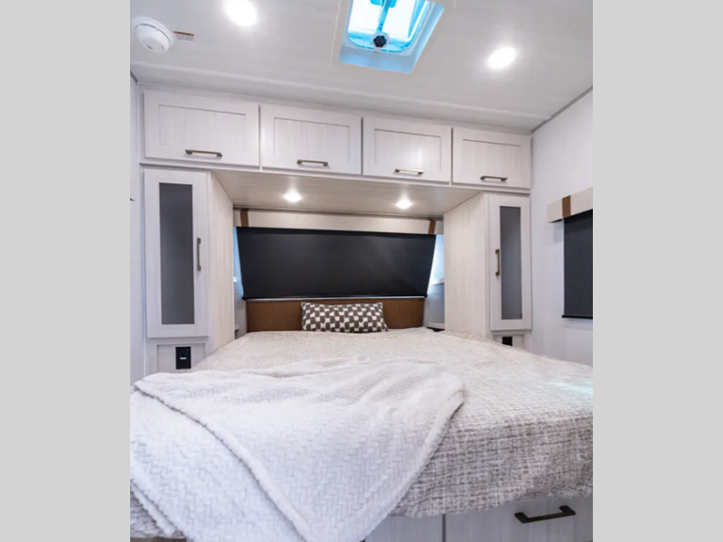 You'll love camping in this couple's trailer! There is a queen bed in the front bedroom, along with dual bedside wardrobes and overhead storage for clothes, books and more. And don't overlook the spacious walk-thru bath! Once you've made breakfast in the rear kitchen or on the outside kitchen, you can dine at the bar top with chairs and a flip-up window. There is also a Trailgate Outdoor Bar if you decide to dine outdoors!