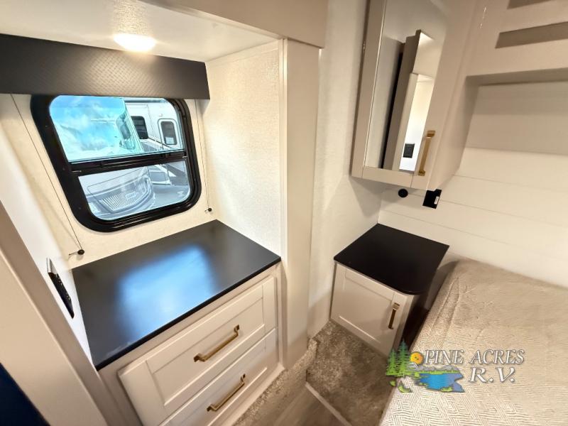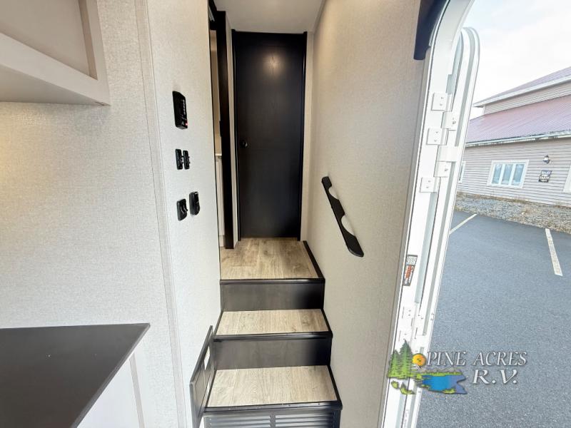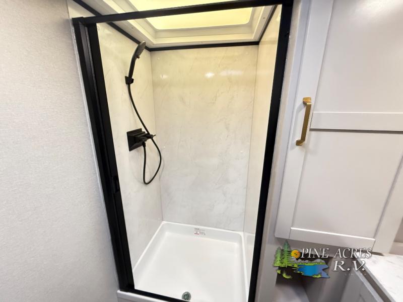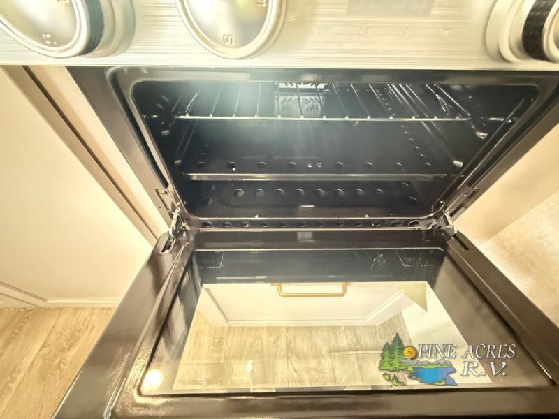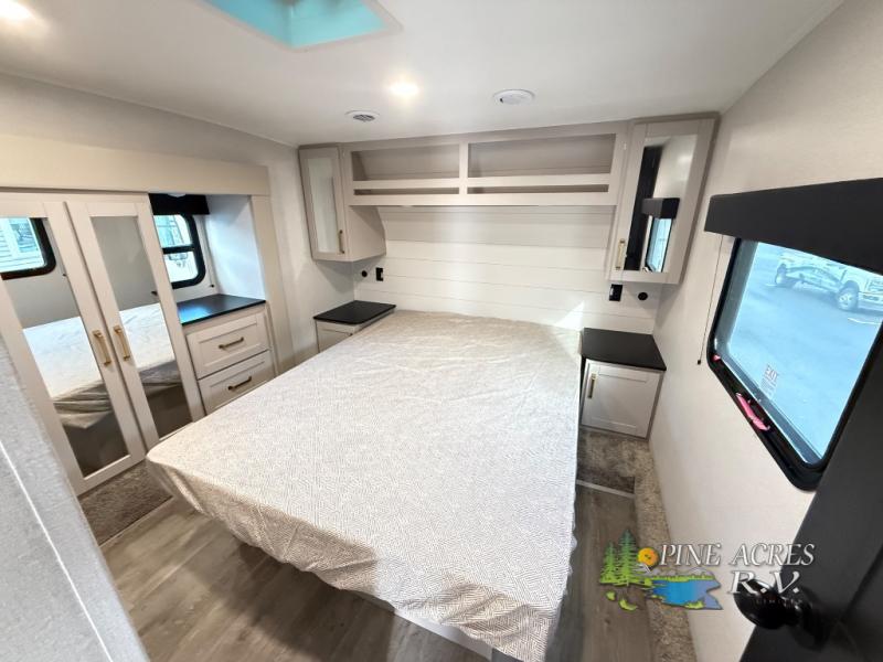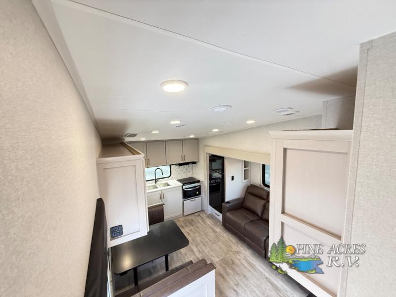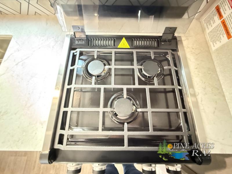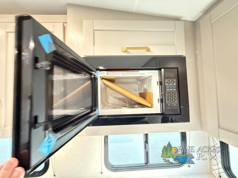 The fifth wheel you were waiting for! The spacious rear kitchen is equipped with a three-burner cooktop, microwave, booth dinette, 12V refrigerator, and sink, providing ample space for meal preparation. Overhead cabinets and a pantry provide ample storage for cookware, dishes, and other essential kitchen items. The living area features a trifold sofa, perfect for relaxation and entertainment. The full bathroom’s thoughtful design ensures that everyone has their own space, and the front bedroom is a retreat from the world, featuring a plush queen bed, a spacious wardrobe, and a closet.