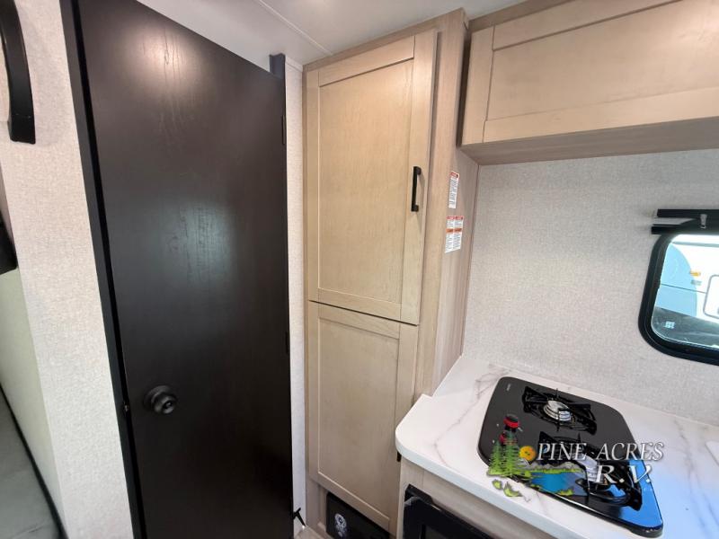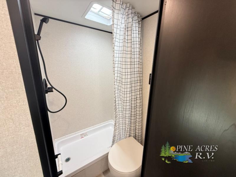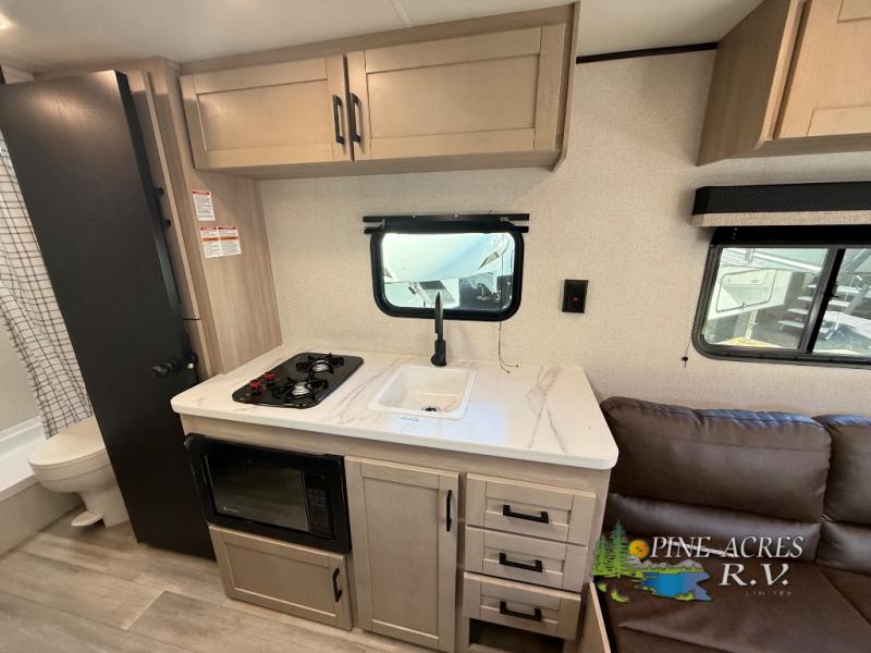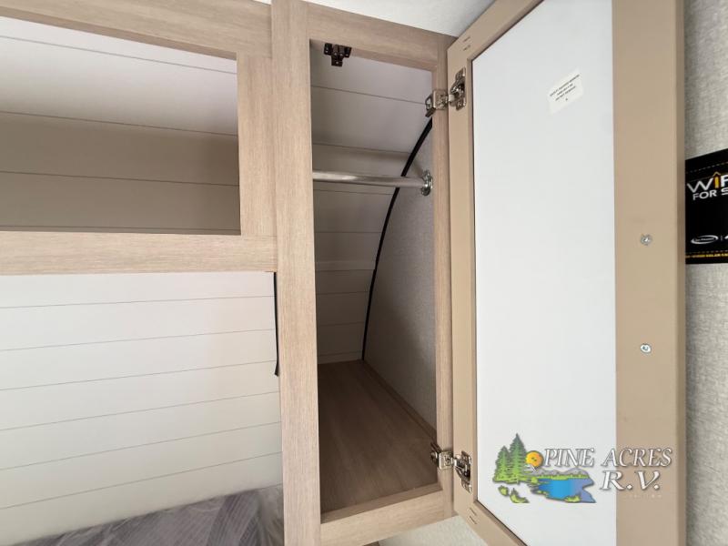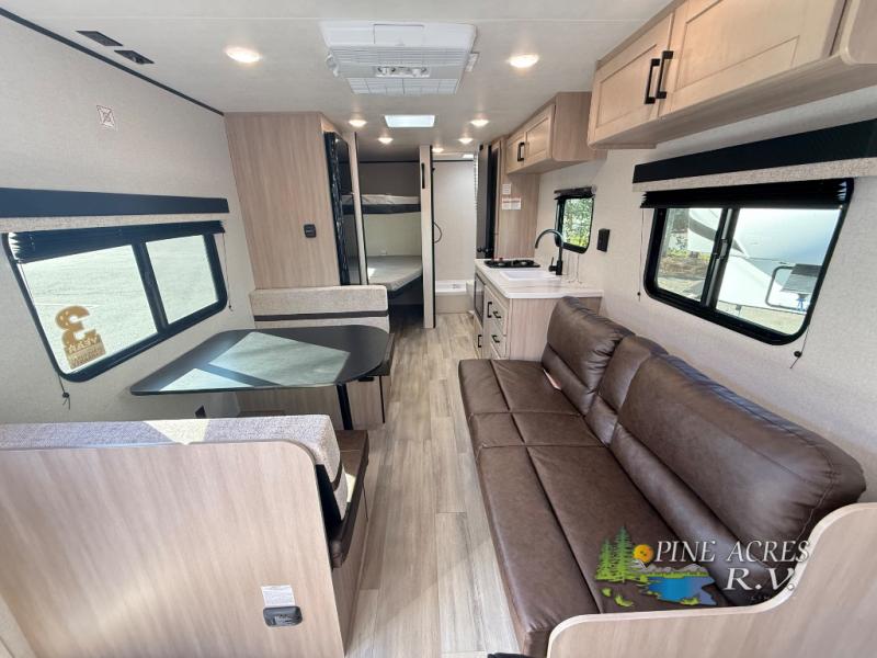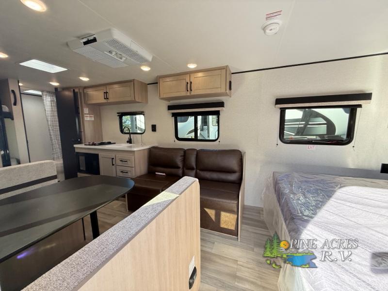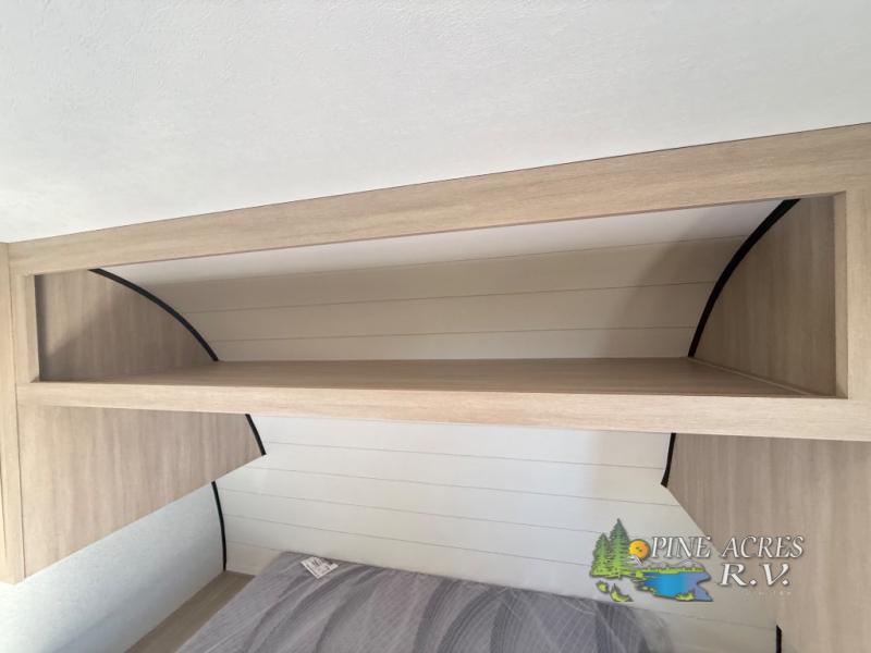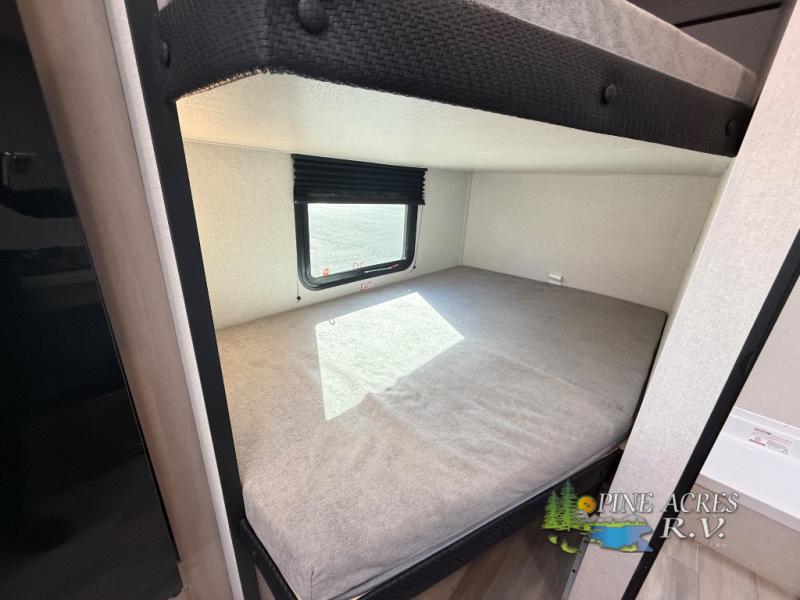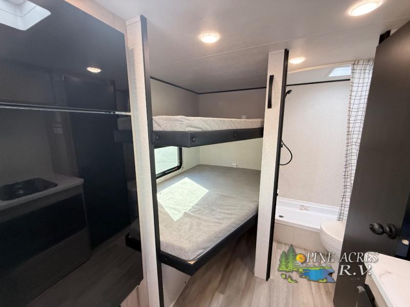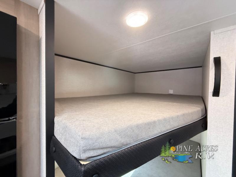 Camping trips are made easy in this Lynx Edition travel trailer with double-size bunk beds for guests or little ones. You'll find a front walk-around queen bed for a great night's rest, along with dual bedside wardrobes to keep your things tidy. The rear corner private bath includes a foot-flush toilet and a 40" shower, so you won't have to leave the camper in the middle of the night. A two-burner cooktop and microwave oven will let you make meals each day, and you'll find seating spaces at the booth dinette or on the sofa!