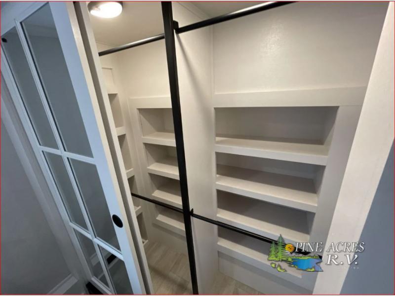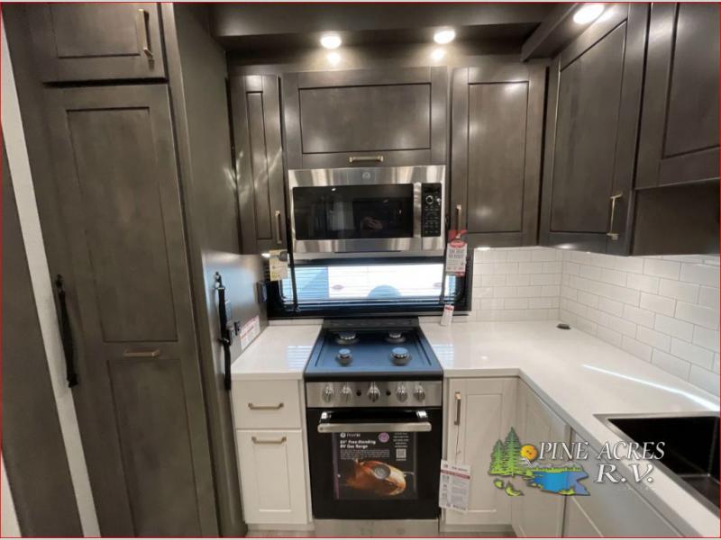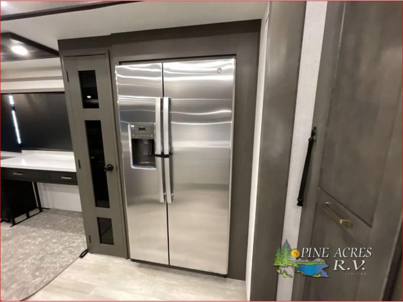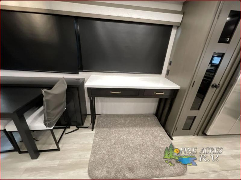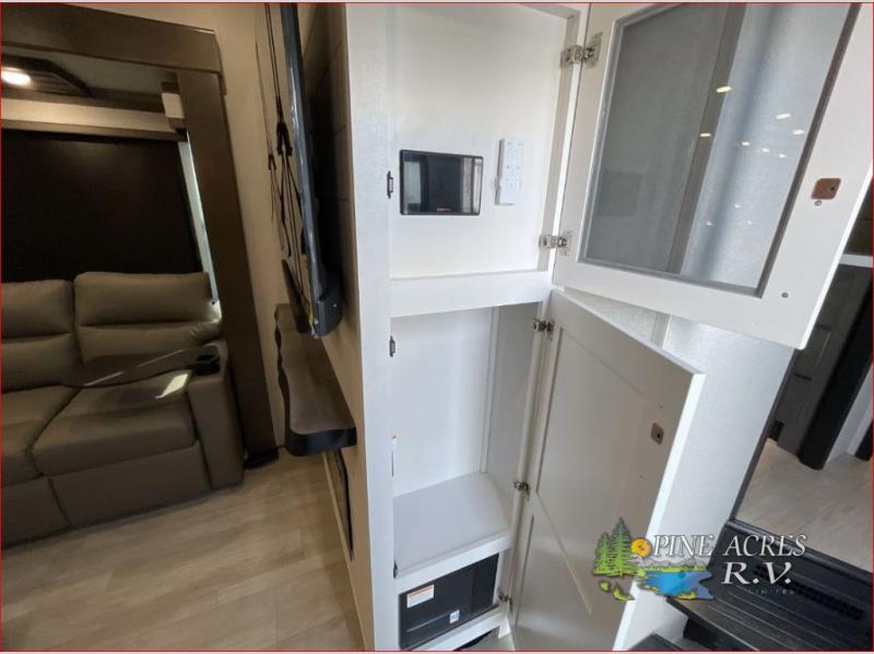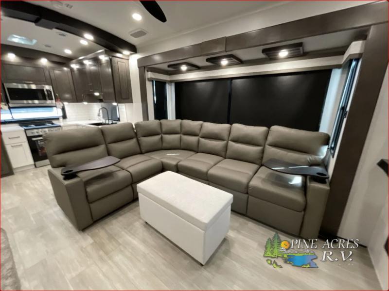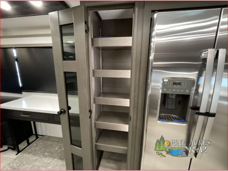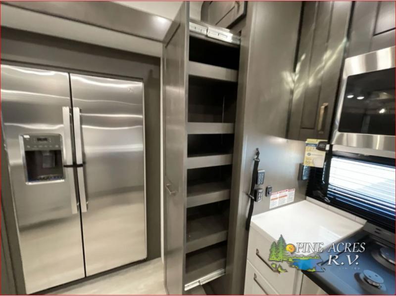 At the front of the 36RK model we have the spacious bedroom featuring a luxurious 72" x 80" king bed, providing ample room to relax and unwind after a long day. A wardrobe and dresser, complete with a TV mounted above, offer generous storage for clothing and personal essentials. Moving down the hall, the full bathroom includes a large 36" x 48" shower with a built-in seat for added comfort, as well as a linen closet for convenient storage. Toward the center and rear of the unit, the open living area expands with dual opposing slides, creating an inviting and comfortable space. One slide houses a 100" L-shaped sofa and theater seating across from the entertainment center with a cozy fireplace, perfect for relaxing evenings. The opposite slide features a pull-out table ideal for dining or game nights, alongside a versatile desk and coffee bar. This same slide also includes a 21-cu. ft. residential refrigerator and a shelved pantry for effortless organization. At the very rear, the U-shaped kitchen is designed for function and style, boasting solid-surface countertops, abundant overhead cabinets, a pull-out pantry, and a pull-out cutting board making meal prep, cooking, and snacking both easy and enjoyable.