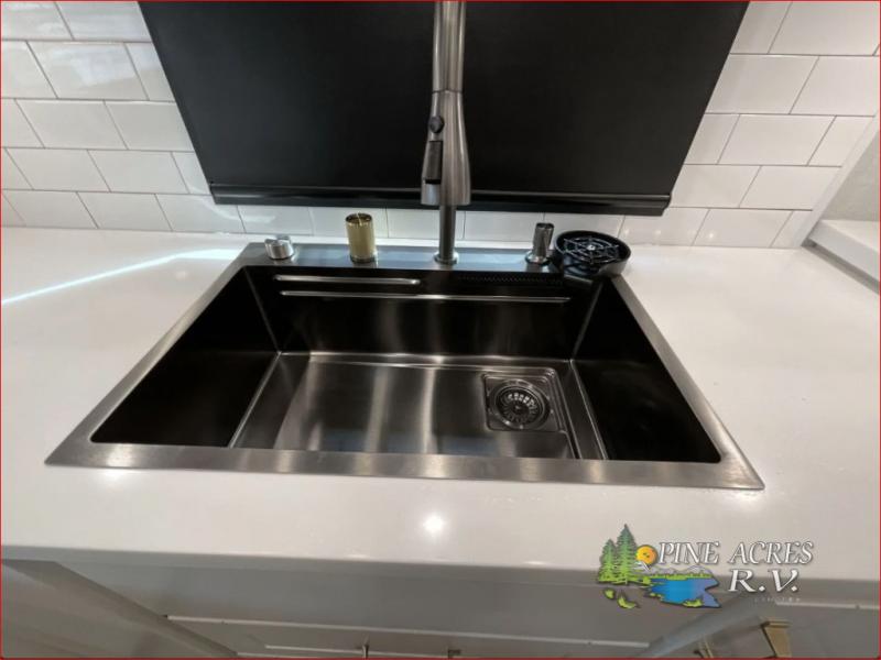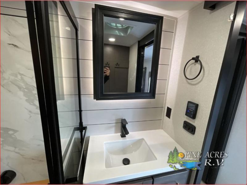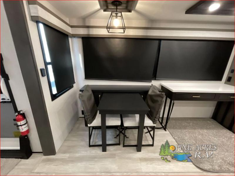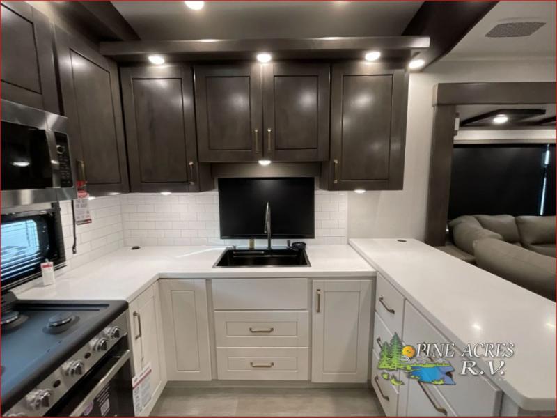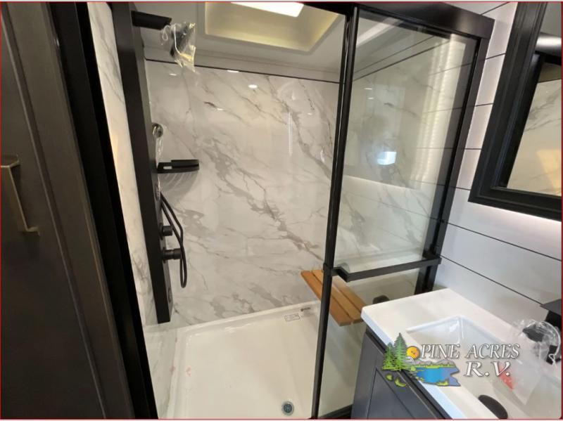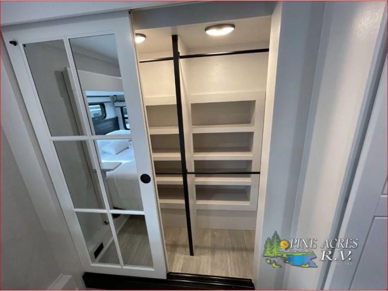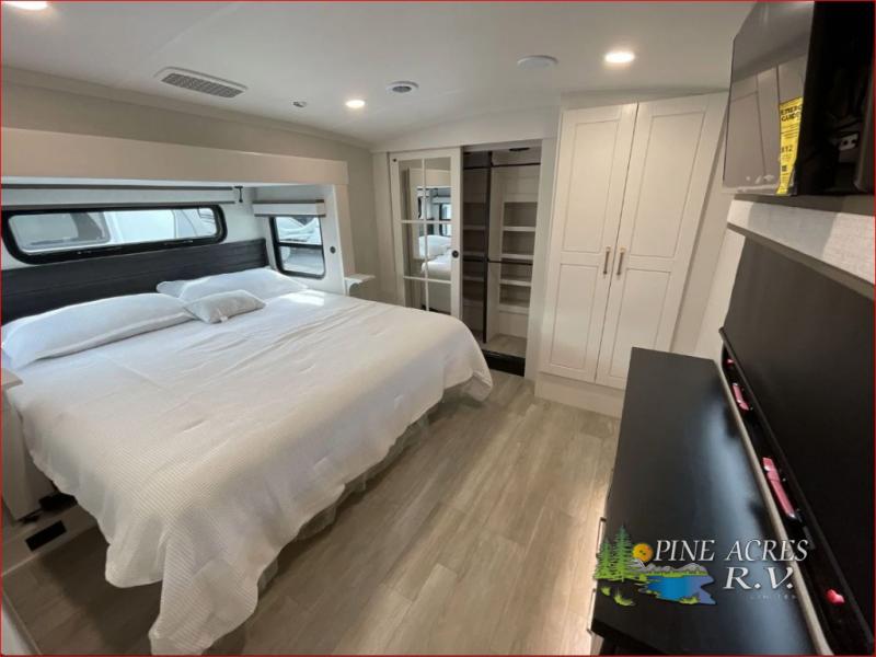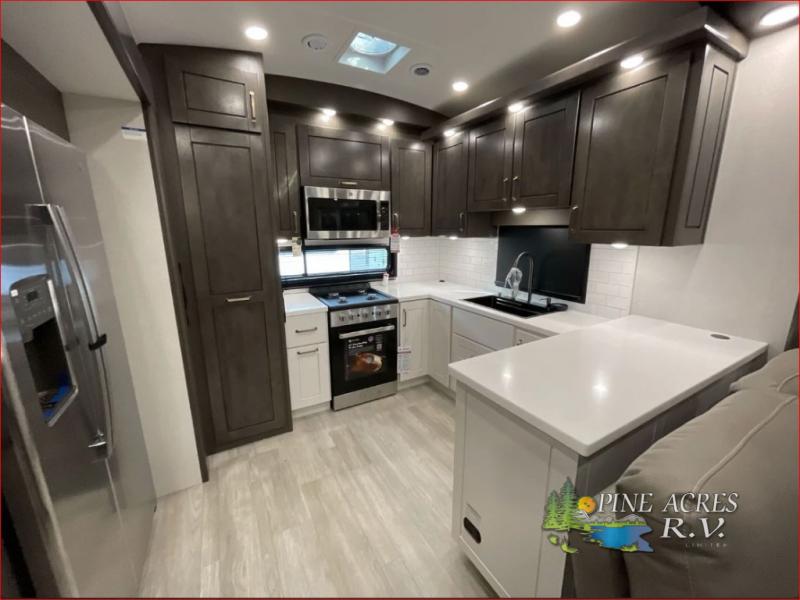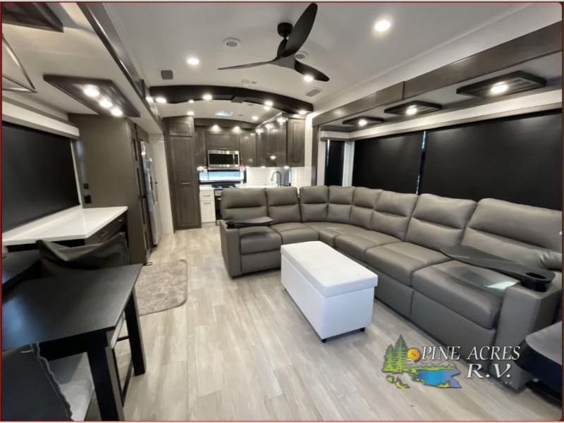 At the front of the 36RK model we have the spacious bedroom featuring a luxurious 72" x 80" king bed, providing ample room to relax and unwind after a long day. A wardrobe and dresser, complete with a TV mounted above, offer generous storage for clothing and personal essentials. Moving down the hall, the full bathroom includes a large 36" x 48" shower with a built-in seat for added comfort, as well as a linen closet for convenient storage. Toward the center and rear of the unit, the open living area expands with dual opposing slides, creating an inviting and comfortable space. One slide houses a 100" L-shaped sofa and theater seating across from the entertainment center with a cozy fireplace, perfect for relaxing evenings. The opposite slide features a pull-out table ideal for dining or game nights, alongside a versatile desk and coffee bar. This same slide also includes a 21-cu. ft. residential refrigerator and a shelved pantry for effortless organization. At the very rear, the U-shaped kitchen is designed for function and style, boasting solid-surface countertops, abundant overhead cabinets, a pull-out pantry, and a pull-out cutting board making meal prep, cooking, and snacking both easy and enjoyable.