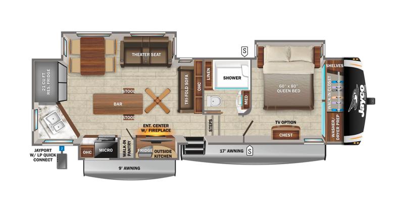 JAYCO Eagle Fifth Wheels 319MLOK 2023 Jayco Eagle 319MLOK 2023 Fifth wheel haut de gamme avec foyer chaleureux cuisinette extérieure ilôt central fauteuils style théâtre sofa-lit et ensemble table et chaises. Profitez du confort grâce à l’air climatisé 15 000 BTU au lit queen au chauffe-eau 6 gallons et aux marche-pieds pratiques. Financement disponible sur place ainsi que garantie prolongée. Nous reprenons tout genre d'échanges tels que VR VTT bateaux motos voitures etc. Commerçant certifié ACVRQ avec inspection et garantie ! Les options et accessoires peuvent différer selon les unités reçues en succursale. Contactez notre équipe pour plus de détails !