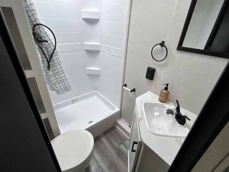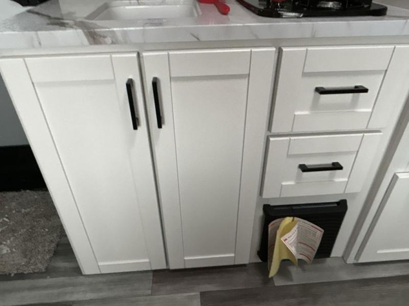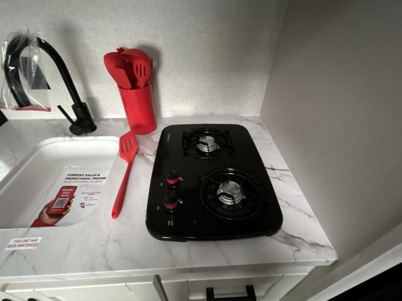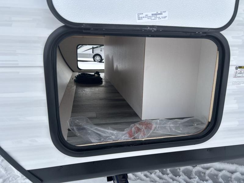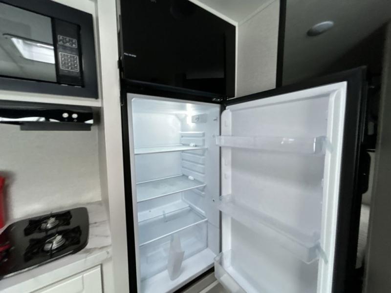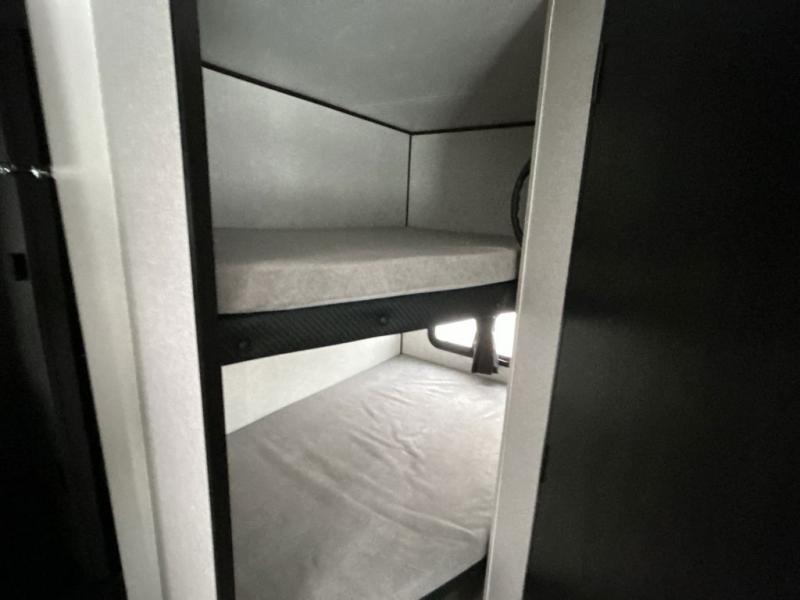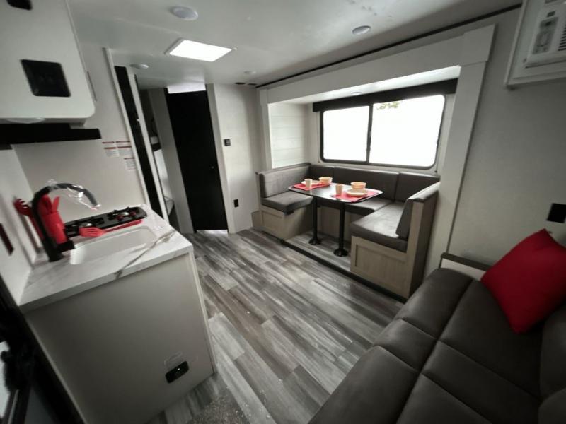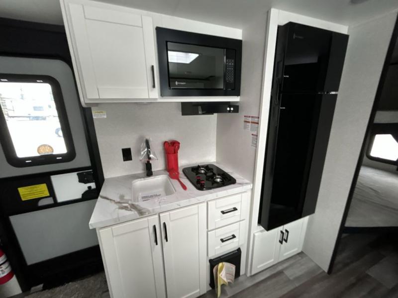 Any time spent in this travel trailer will be time well spent! You can easily sleep eight people each night thanks to the double-size bunks, front Murphy bed, and U-shaped dinette within the slide out. There is a full bath next to the bunks for easy nighttime use, and the linen closet will be perfect for clean towels. A cooktop, microwave oven, and 8 cu. ft. 12V refrigerator will let you cook and store food, and there is an overhead cabinet for spices or snacks!