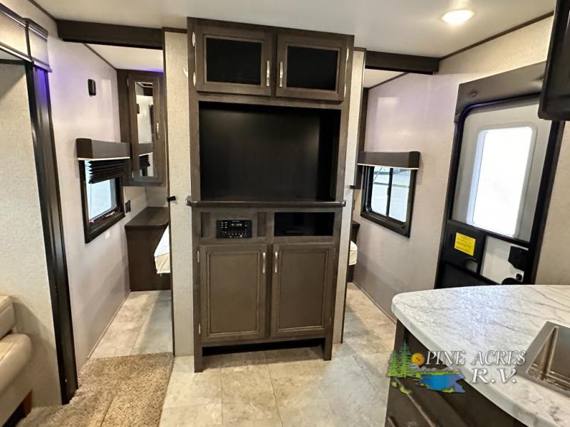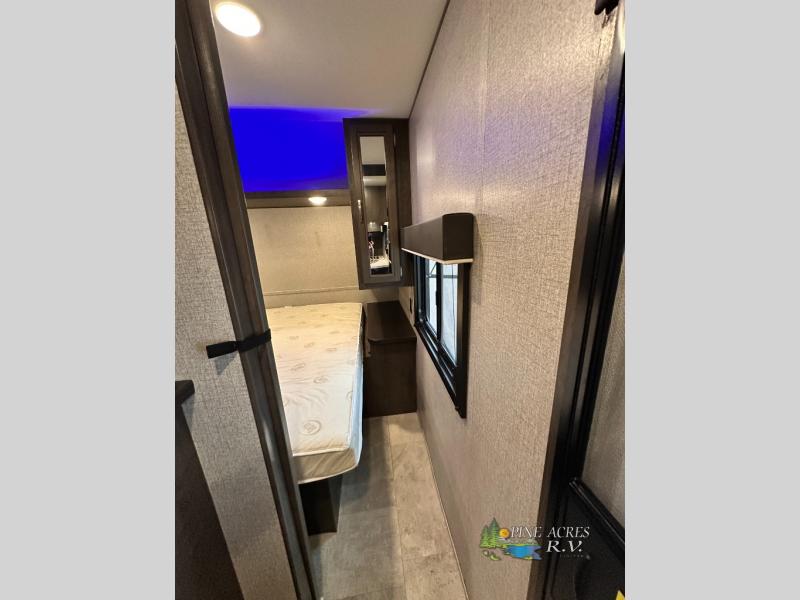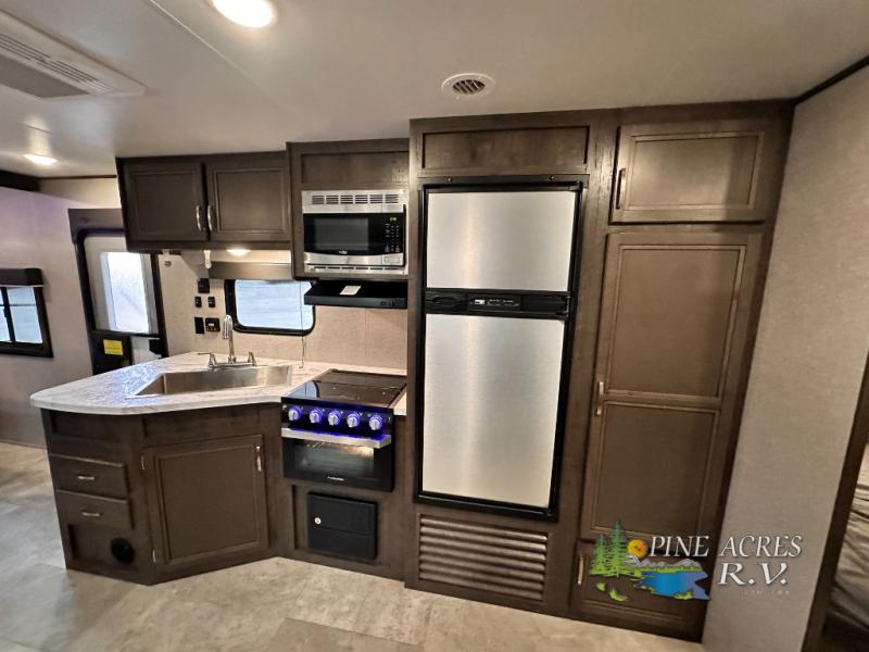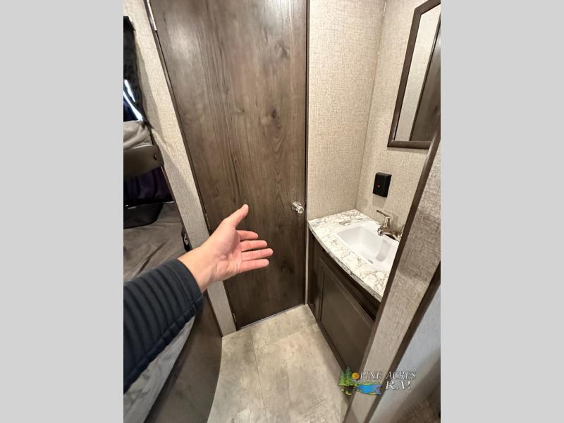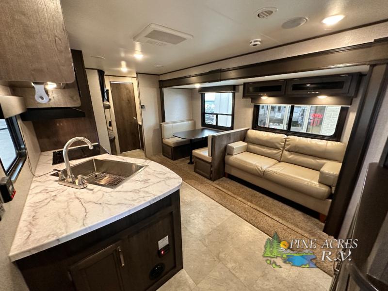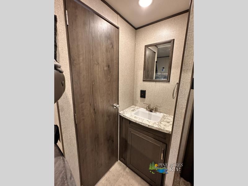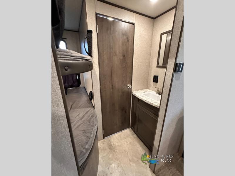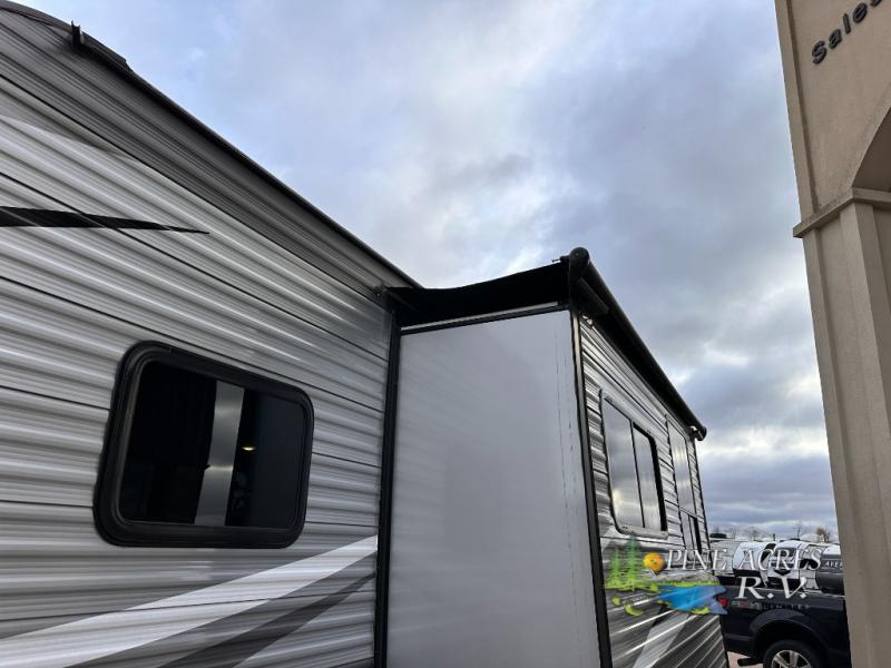 The full bathroom is next to the double size bunks making those nighttime trips for the little ones quiet convenient. And the full kitchen offers everything you will need to feed the whole family and their friends, plus solid surface countertops that are seamless. You can even make meals on the outside kitchen while the others relax under the power awning. The booth dinette and jackknife sofa slide out opens up the main area so everyone can have their own space to relax. And when you want to get away from it all, close the two bedroom doors to enjoy the queen Serta mattress and all the storage you will have in your own room.