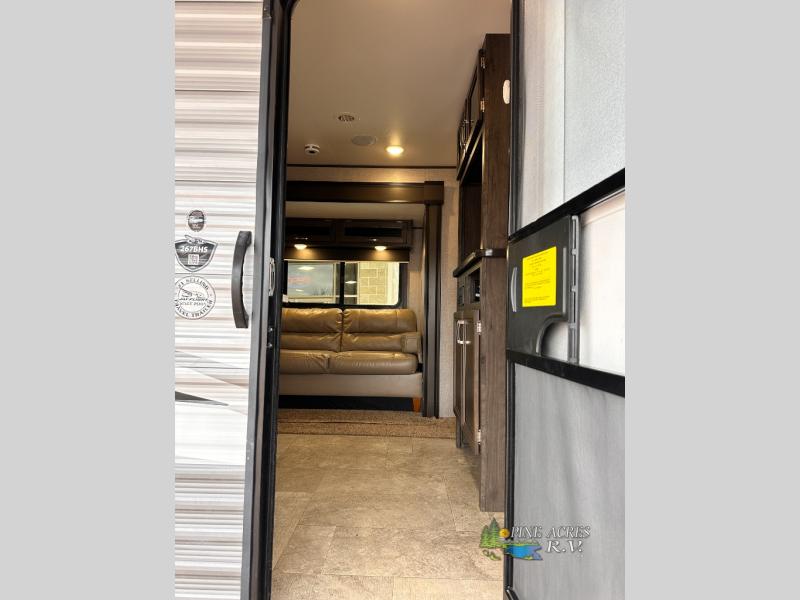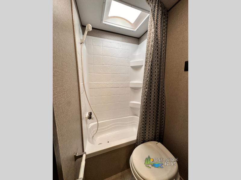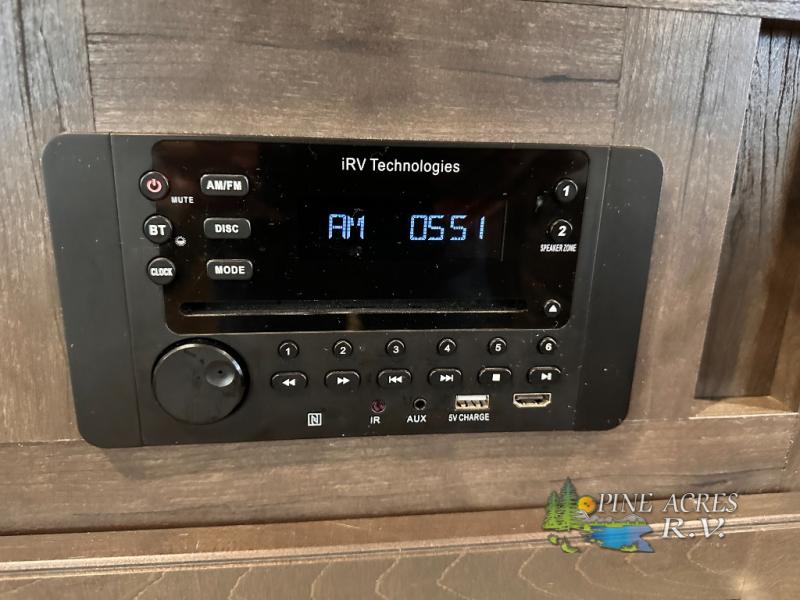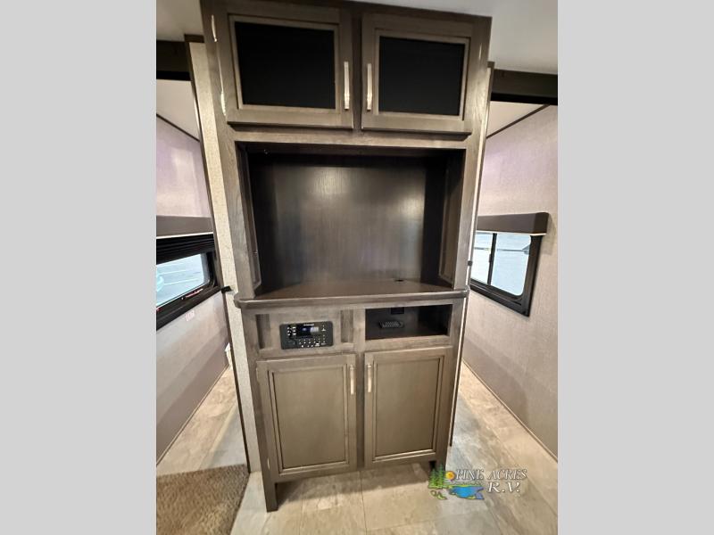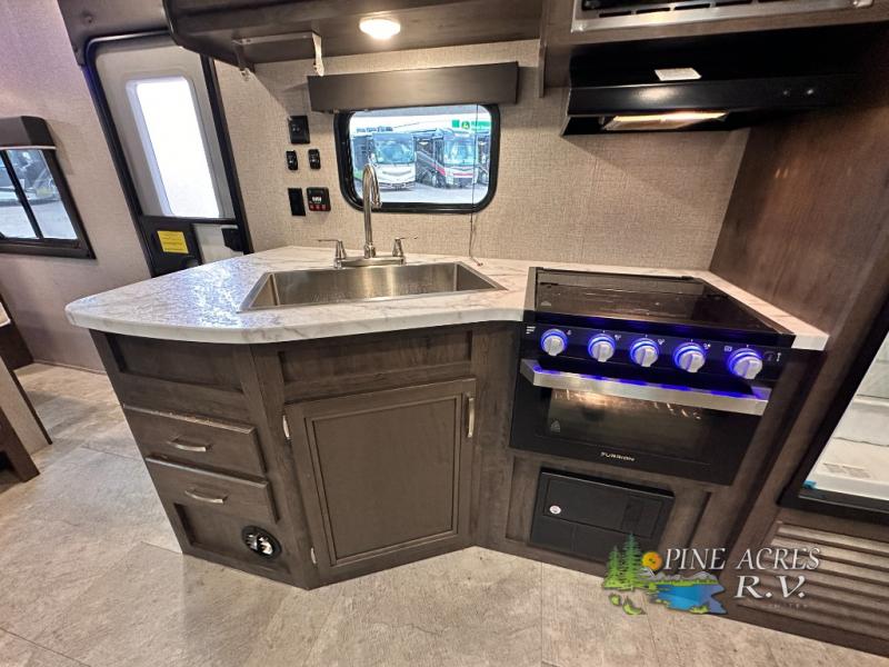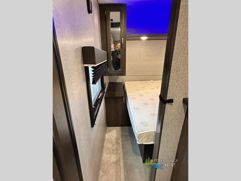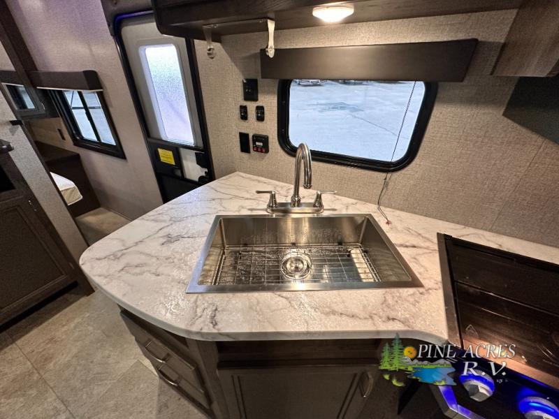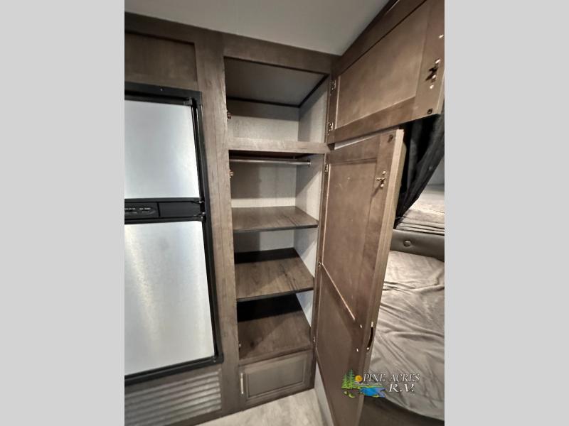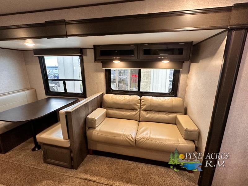 The full bathroom is next to the double size bunks making those nighttime trips for the little ones quiet convenient. And the full kitchen offers everything you will need to feed the whole family and their friends, plus solid surface countertops that are seamless. You can even make meals on the outside kitchen while the others relax under the power awning. The booth dinette and jackknife sofa slide out opens up the main area so everyone can have their own space to relax. And when you want to get away from it all, close the two bedroom doors to enjoy the queen Serta mattress and all the storage you will have in your own room.