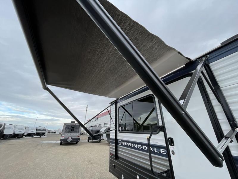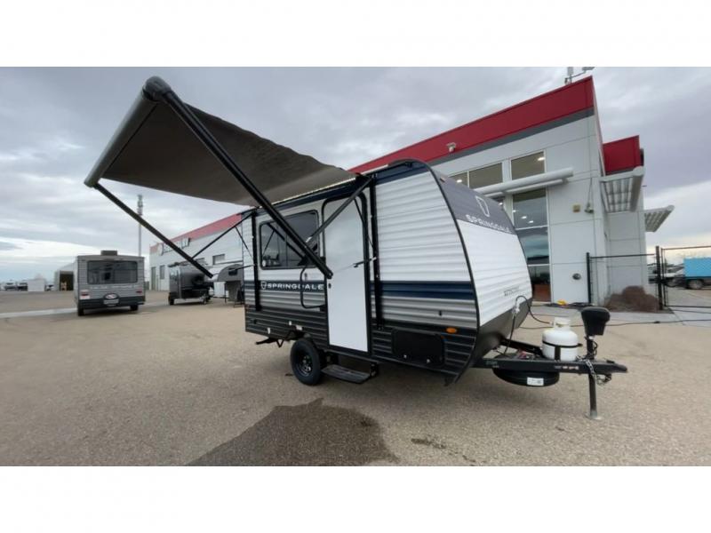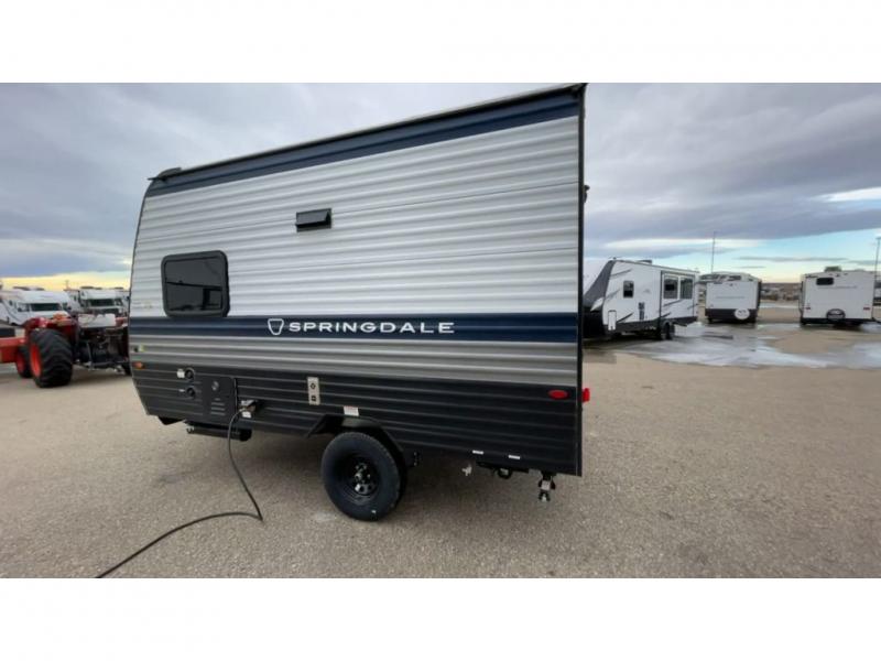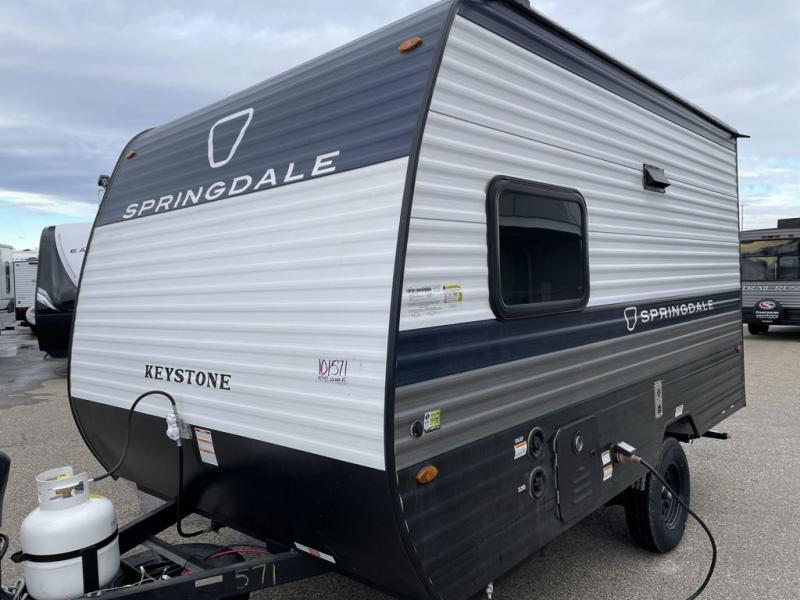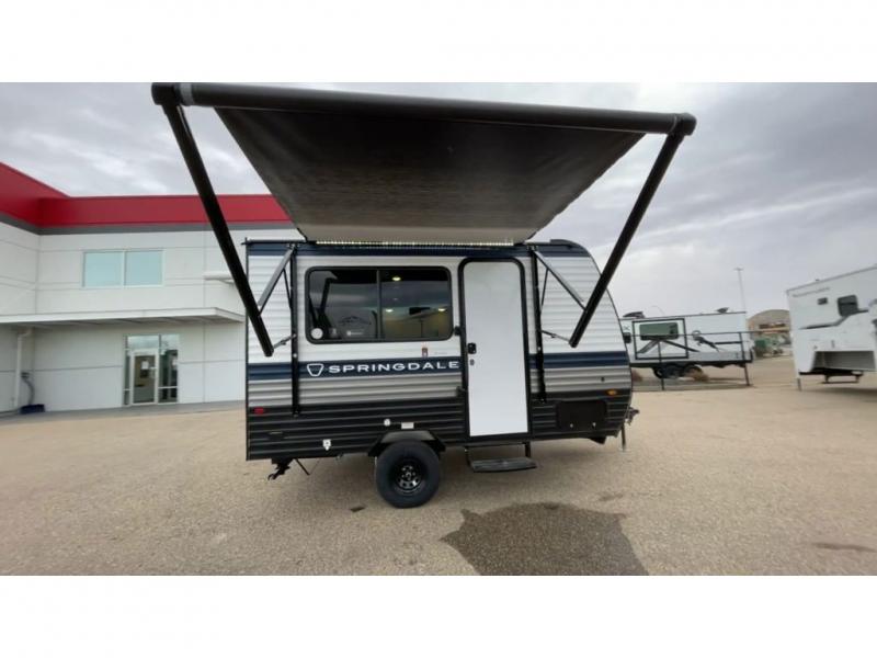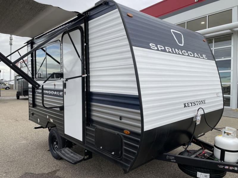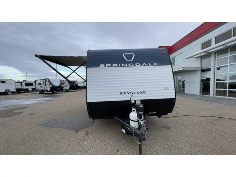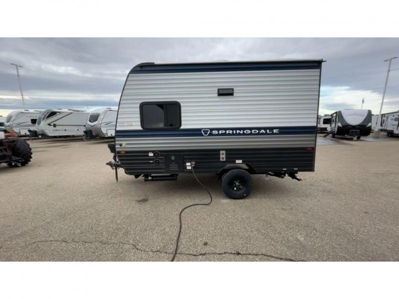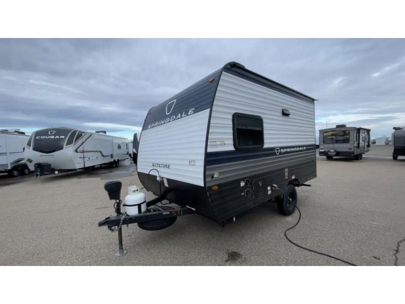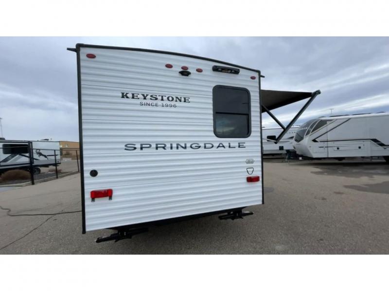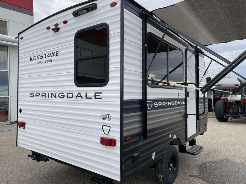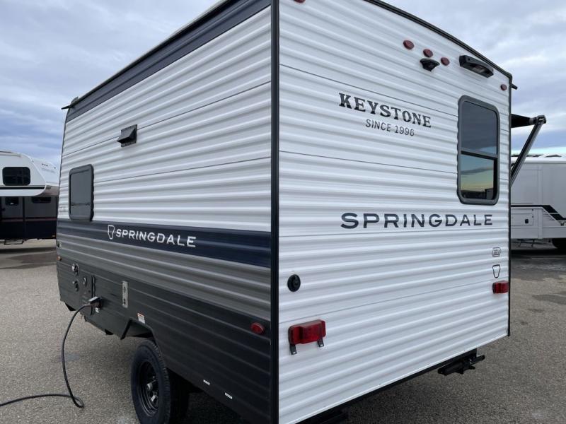With any Springdale Mini travel trailer by Keystone, you will enjoy lightweight towing thanks to their single axle! The XL tinted safety glass windows are ultra durable, and the power awning will provide protection from the sun as you relax in your camp chairs outside. Each model includes blackout night shades, LED lighting, plus many more interior comforts. There is also a 20K BTU furnace to keep you comfortable, plus a tankless water heater for endless hot showers!