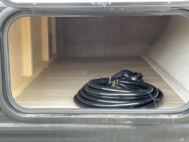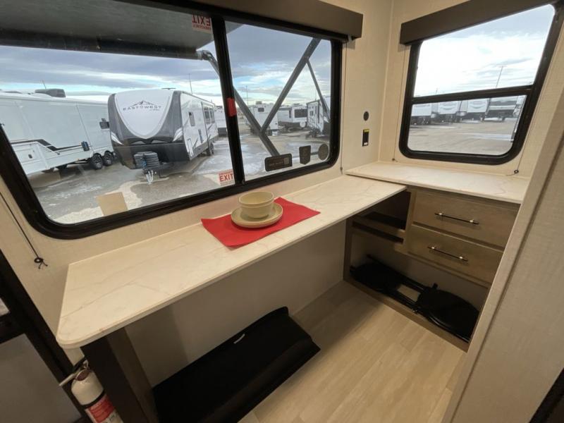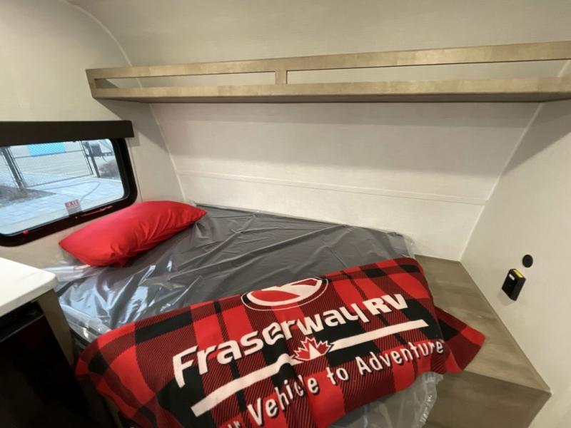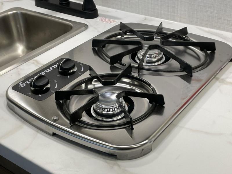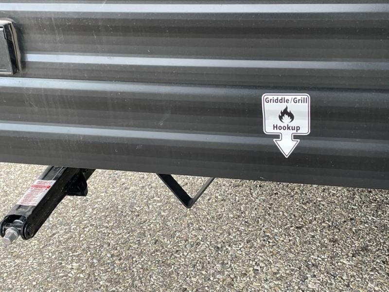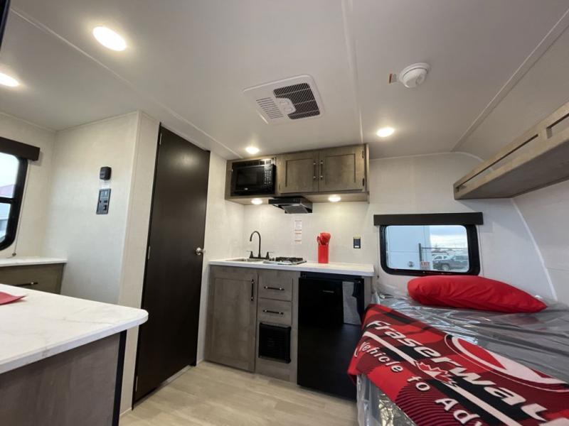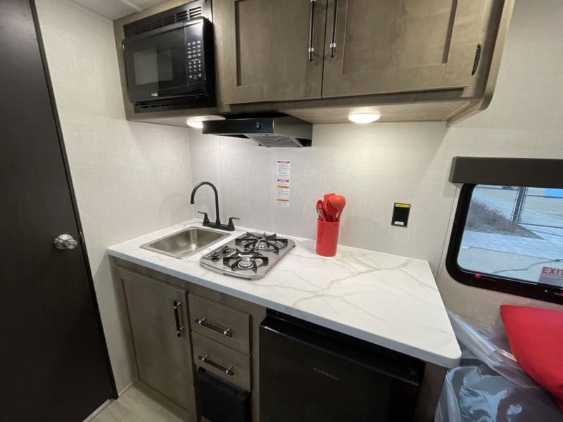 Your small crew will love camping in this lightweight travel trailer. There is a full-size bed up front with an overhead shelf to keep belongings out of the way. The two-burner cooktop and microwave oven will let you make breakfast in the morning, and the bar table with two stools provides a place to dine together. And a private bath with a shower and toilet lets you easily clean up after a day outdoors!