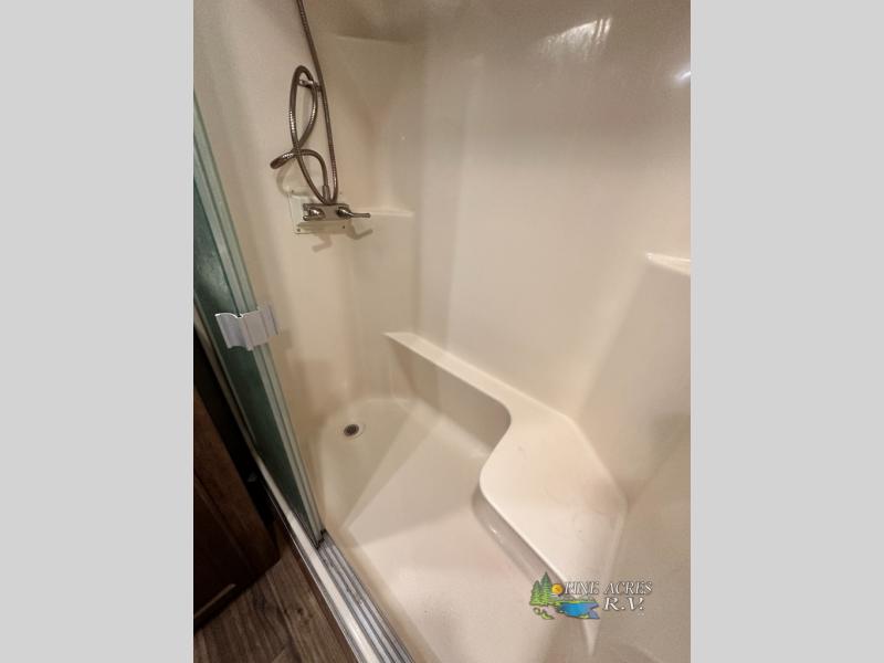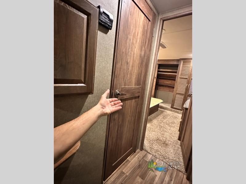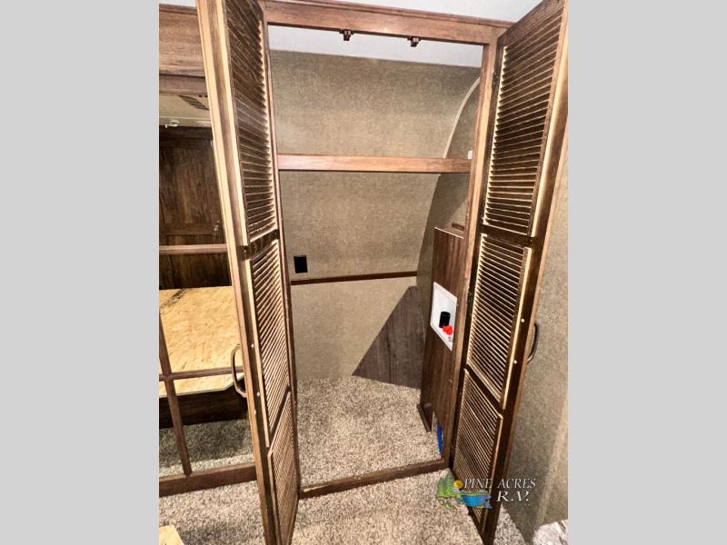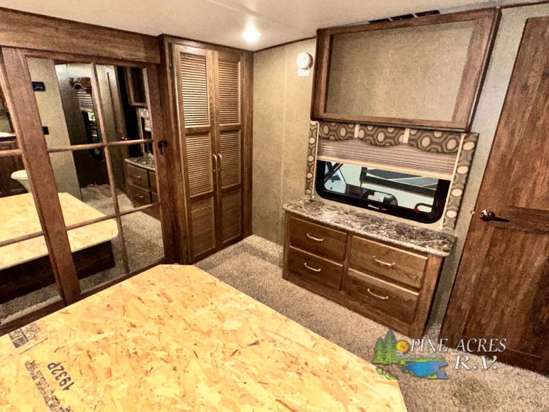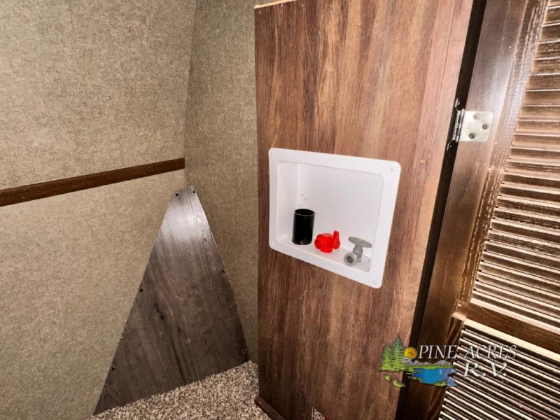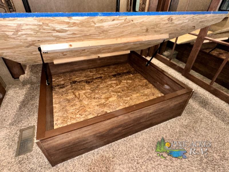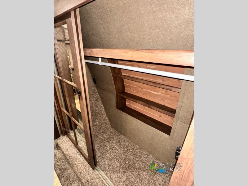 The master bedroom provides a king bed slide out with storage underneath, and a front master closet including a second closet that has been prepped for a washer and dryer. There is also a chest of drawers opposite the bed along the curb side wall so you can easily tuck away all of your things.