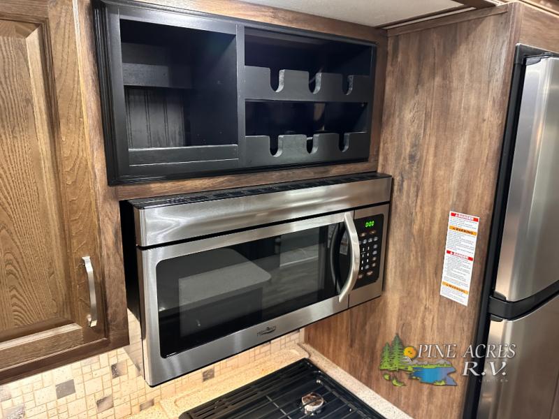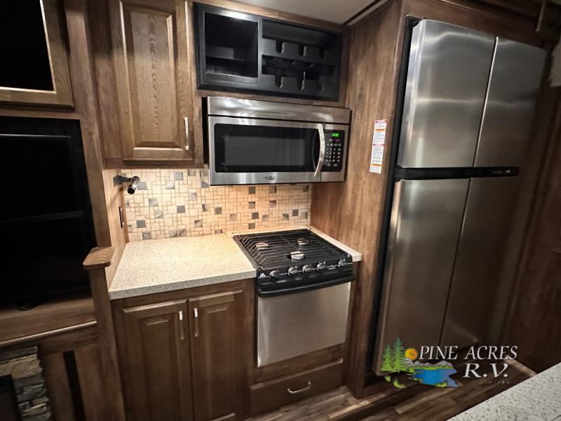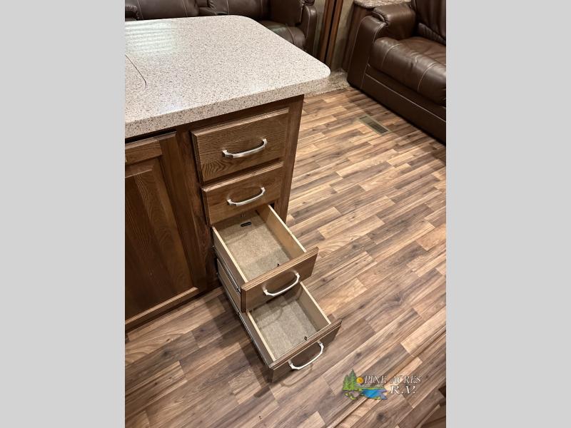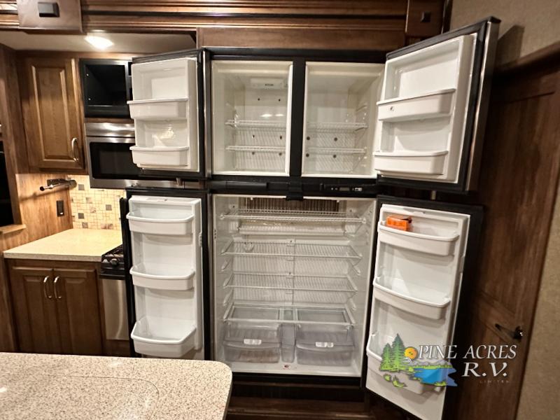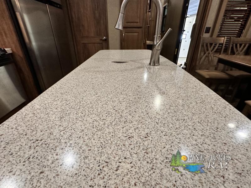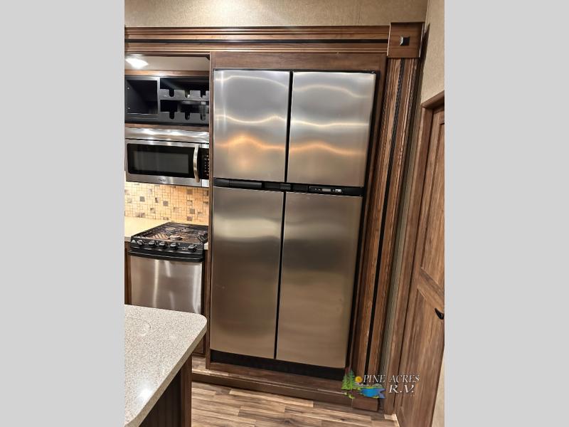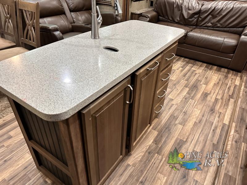 Head to the rear of this Avalanche fifth wheel from just inside the main door to find a combined kitchen and living space. There is a slide out free standing dinette with chairs and theater seat for two just inside the door. On the opposite side another slide featuring a entertainment center with fireplace and overhead storage, plus the kitchen appliances including a three burner range, residential microwave, an 18 cu. ft. refrigerator, and storage. A nice island in the center provides a double sink and more counter space, as well as storage which you can also find along the outer corner of the middle bedroom where there is a pantry for your dry and canned goods.