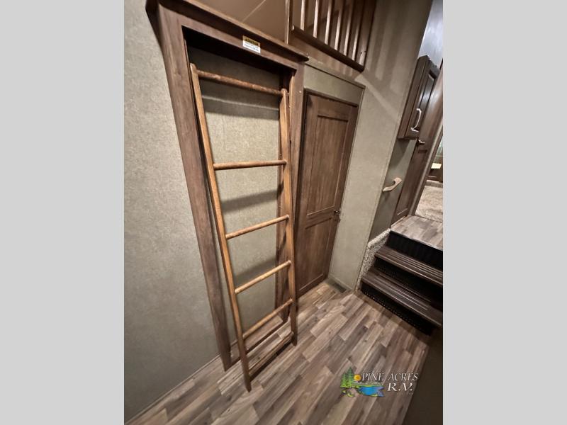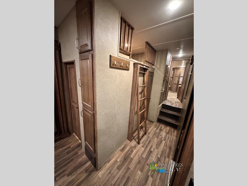 Step inside and slightly to your right there is a door into the middle bedroom that features dual entry, a slide out hide-a-bed sleeper sofa, a wardrobe for clothing, and an entertainment center with a desk. There is also a loft above this room including access with a ladder out in the hall opposite the main entry.
