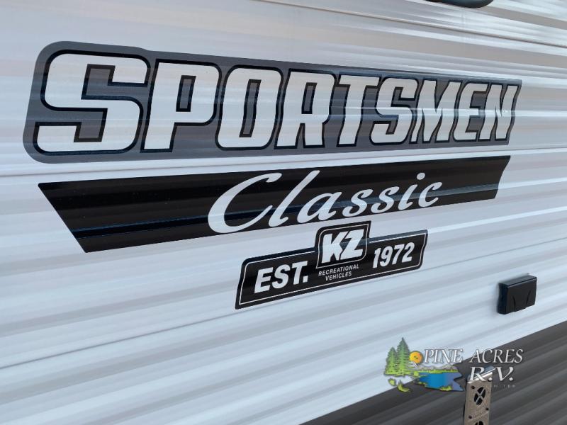 With any Sportsmen Classis travel trailer, expandable, or toy hauler by KZ you will find durable construction materials, like the 3/8" full-walkable roof and the one-piece seamless Tufflex material. Each model includes scissor-style stabilizer jacks, a Key-Alike program for baggage and entry doors, and a Leash Latch with a bonus beverage opener. You will find interior and exterior speakers, a new three-toned exterior metal, plus backup camera prep and solar prep. The Sportsmen Classic is designed to make you feel at home with LED interior lights, rail-style cabinet doors, residential grade linoleum, and plenty of storage space for all your belongings.