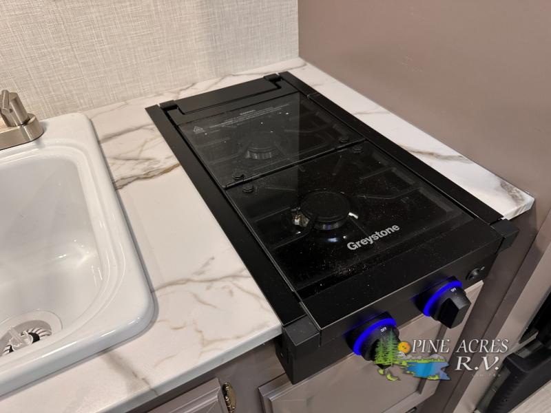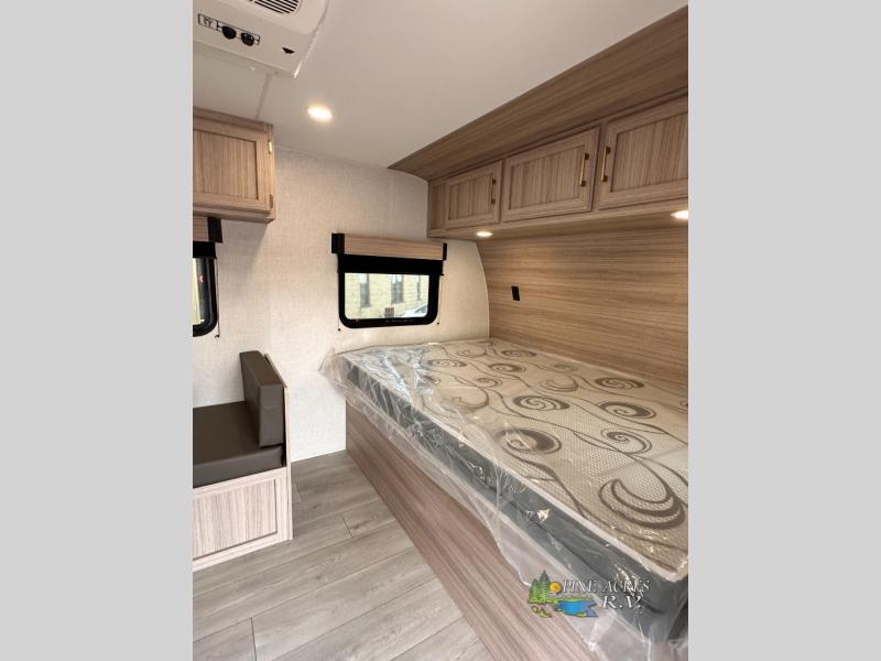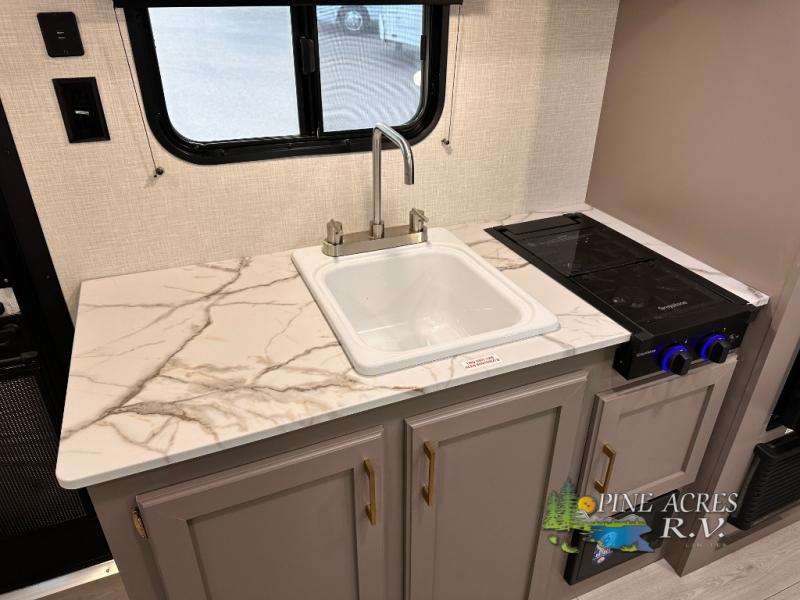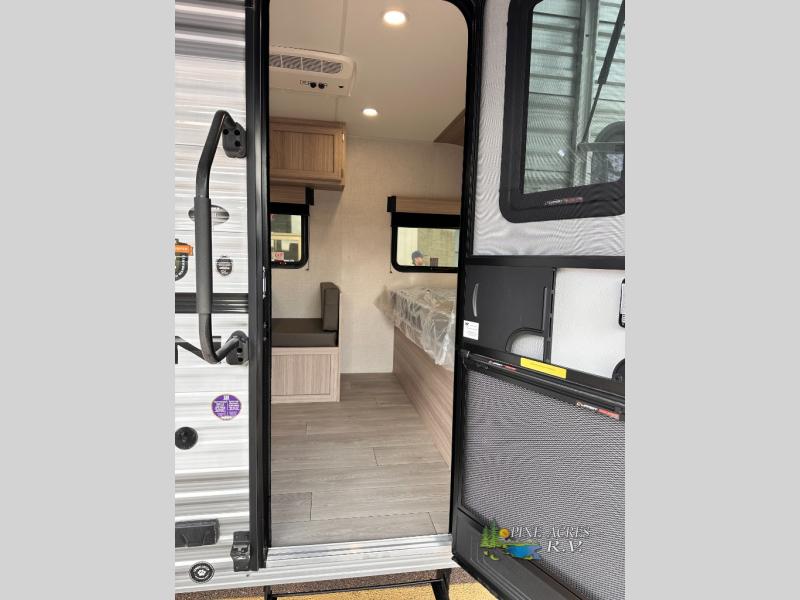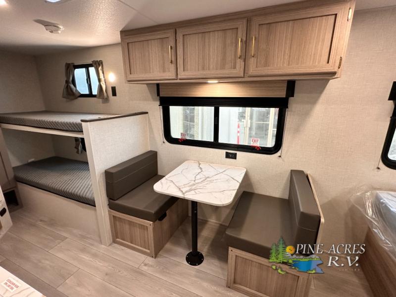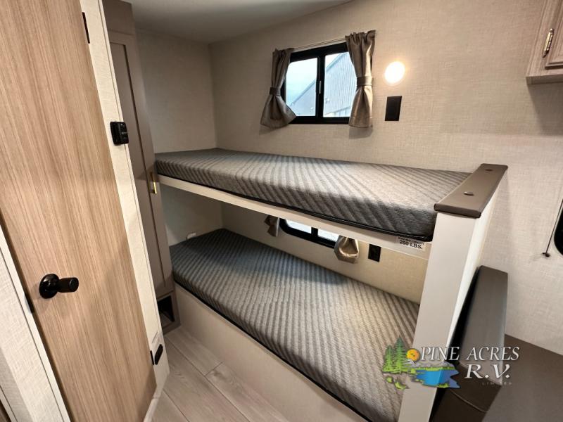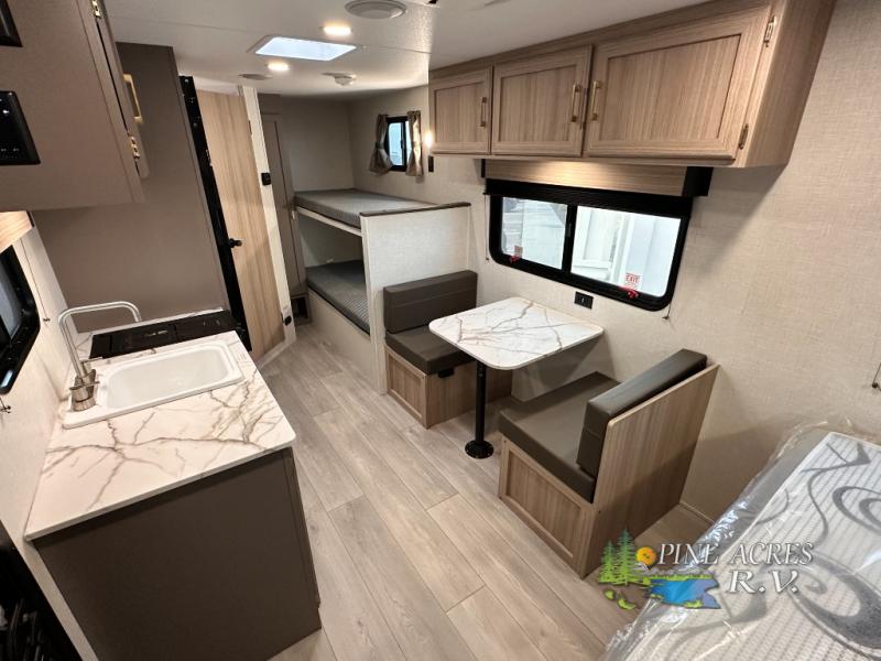 Bunk beds make this travel trailer the perfect family-friendly unit, so head to your local state park! The front 54" x 80" bed will provide comfortable sleeping space for you, plus there is a booth dinette for one or two little ones to sleep on. This model includes a two burner cooktop, a microwave oven, plus a single bowl sink for hassle-free clean up. The 13' power awning will protect you from the elements, and the pass-through storage will be perfect for fishing poles.