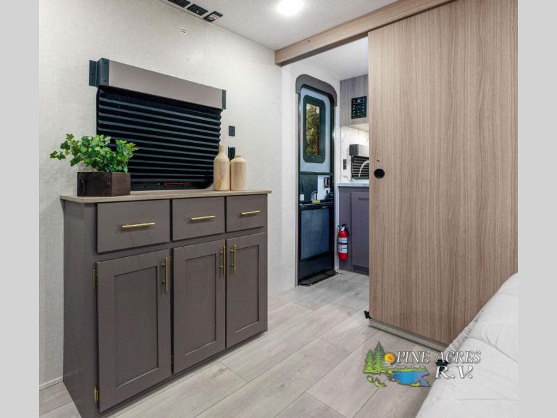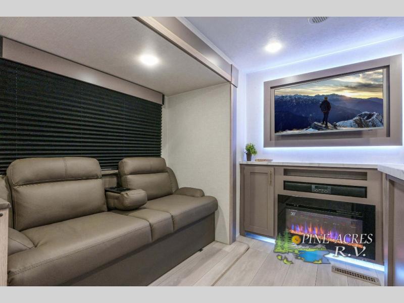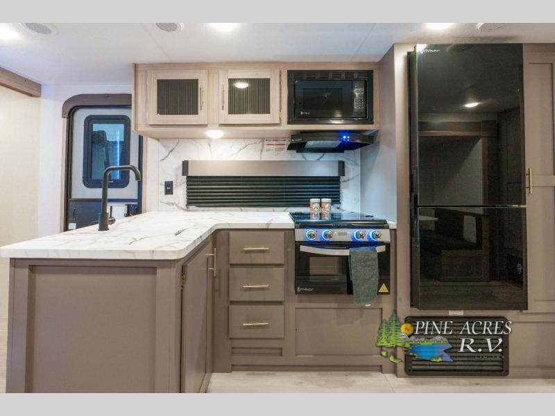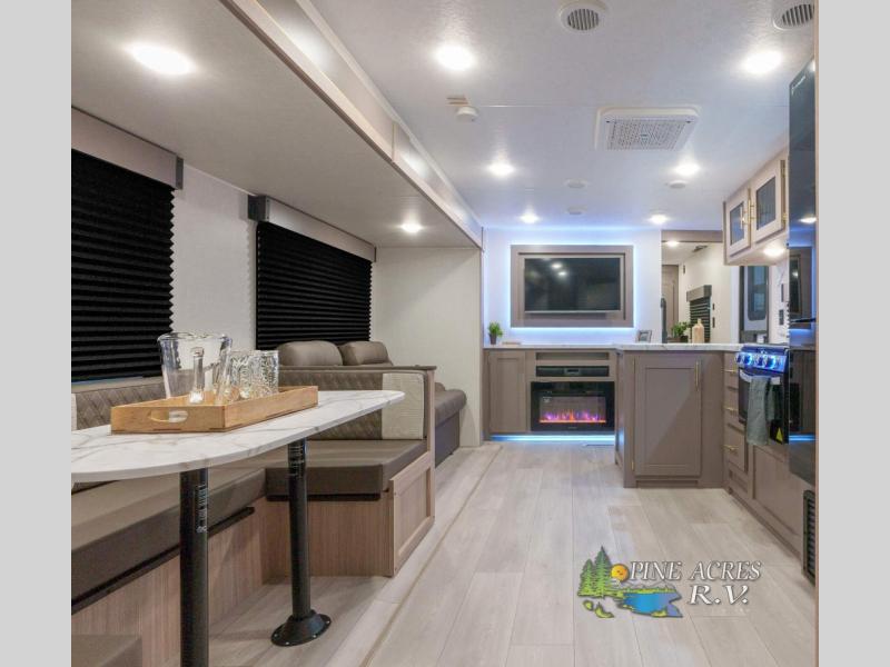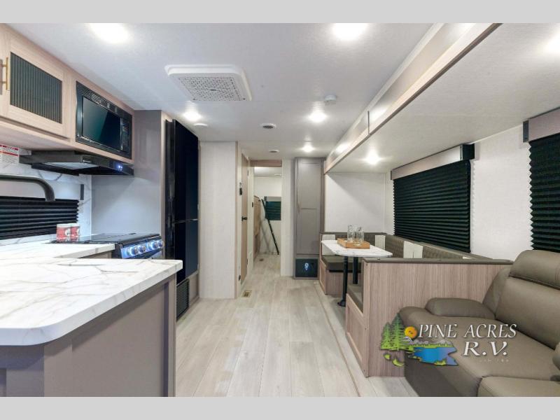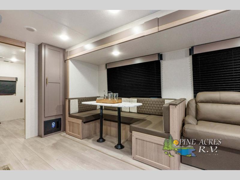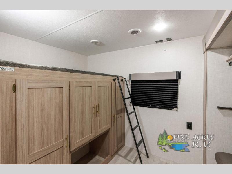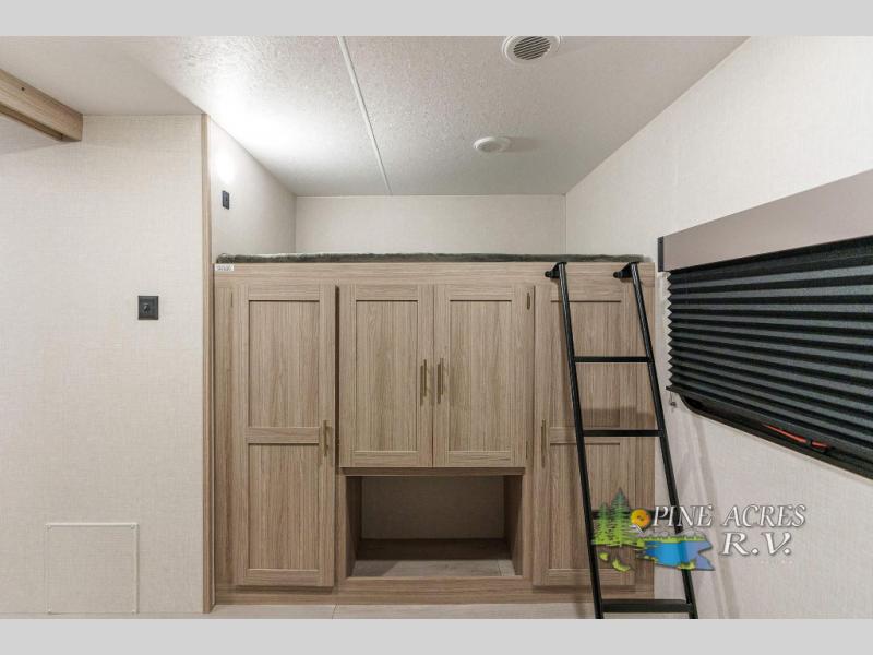 If you've been looking for a travel trailer with plenty of space for your family or group of friends, look no further than this one! The private bunkhouse includes a bunk/closet plus a jackknife sofa with a hinge bunk above. And the full bath is close by for convenience. Everyone can gather in the main living area at the U-shaped dinette, and there is a sofa here for more seating space. If the weather is nice, head outdoors to relax under the 20' power awning with LED lights as the cook prepares dinner on the outside griddle!