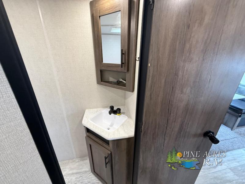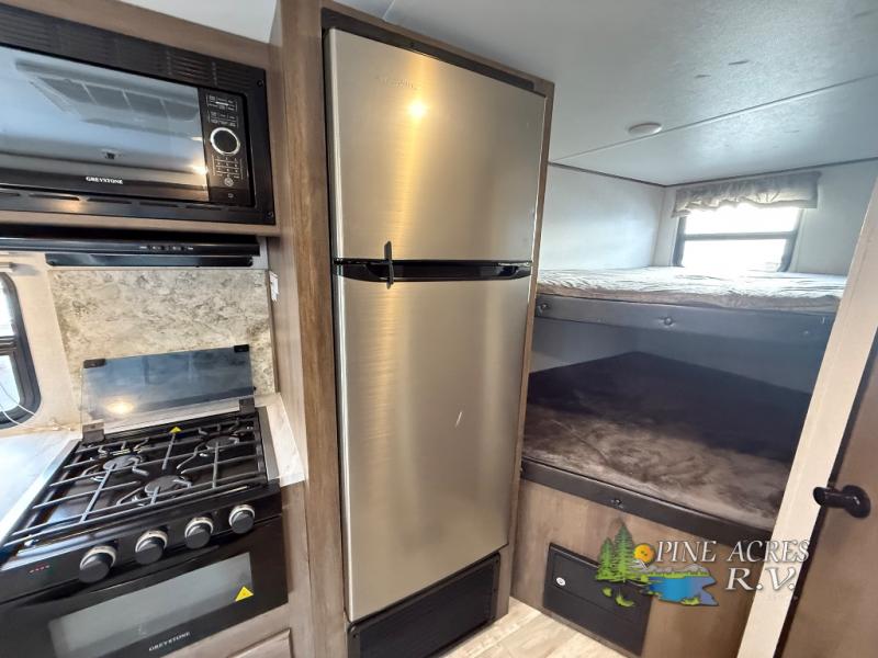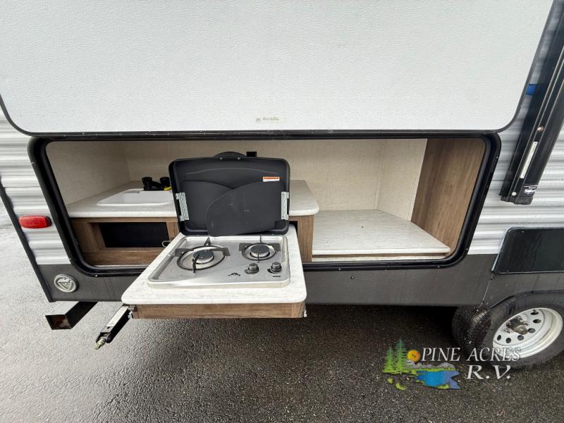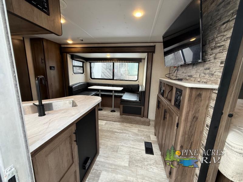 Imagine the kiddos hiking around the campground and laughing about their adventures in this Avenger travel trailer. This trailer offers sleeping accommodations for eight because of the double-size bunks, U-shaped dinette, and queen-size bed, and it also includes a full bathroom with a shower curtain on a curved track providing more elbow room. You will find full kitchen amenities inside, as well as an outdoor kitchen where you can watch the kids play while making dinner. The single slide provides more living space on the interior, as well as extra sleeping space.