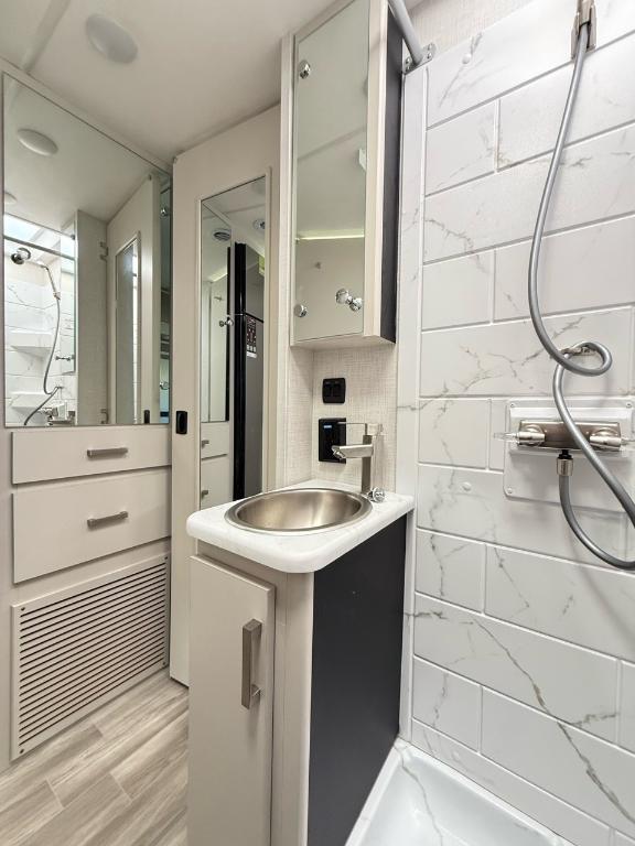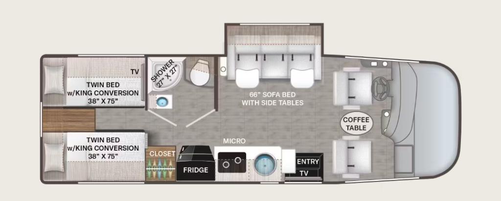 Motorisé Classe A – Thor Axis 24.1 2026 Le Thor Axis 24.1 est un petit motorisé de classe A conçu pour offrir la maniabilité d’un fourgon avec le confort d’un grand camping-car. Ce modèle combine design moderne. Technologie embarquée et équipements haut de gamme. Il est parfait pour les couples ou petites familles cherchant l’aventure sans compromis. Spécifications mécaniques : • Moteur : 7.3L V8 • Puissance : 325 chevaux • Type de carburant : Essence • Transmission : Ford TorqShift à 6 vitesse automatique • Châssis : Ford E-Series Dimensions & Capacités : • Longueur totale : 258 pieds • Réservoir d’eau douce : 41 gal • Réservoirs d’eaux usées : 70 gal • Couchages : Jusqu’à 5 personnes Son design intérieur Coastal Cream son extérieur Mercury Edition avec roues noires et ses options bien choisies – comme le siège conducteur électronique le système de stabilisation et le lit escamotable – en font un véhicule aussi pratique que raffiné. Facile à conduire. Encore plus facile à aimer. Découvrez le Axis 24.1 2026 — bien plus qu’un simple camping-car de Classe A. Ce modèle compact mais puissant est le compagnon idéal pour une escapade le temps d’un week-end ou un long voyage sur les routes. D'une maniabilité surprenante et équipé de tout le confort d’un grand camping-car le Axis redéfinit le voyage en toute liberté. Prêt pour l’aventure. Conçu pour le confort. Parfait pour l’évasion. Éléments distinctifs de ce Axis : - Lit électrique au dessus de la cabine de conduite - Semi Full Paint - Jantes Noires - Armoires supérieures avec finition lustrée - Édition NIGHTFALL