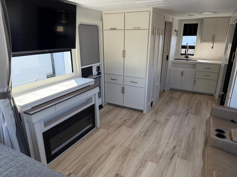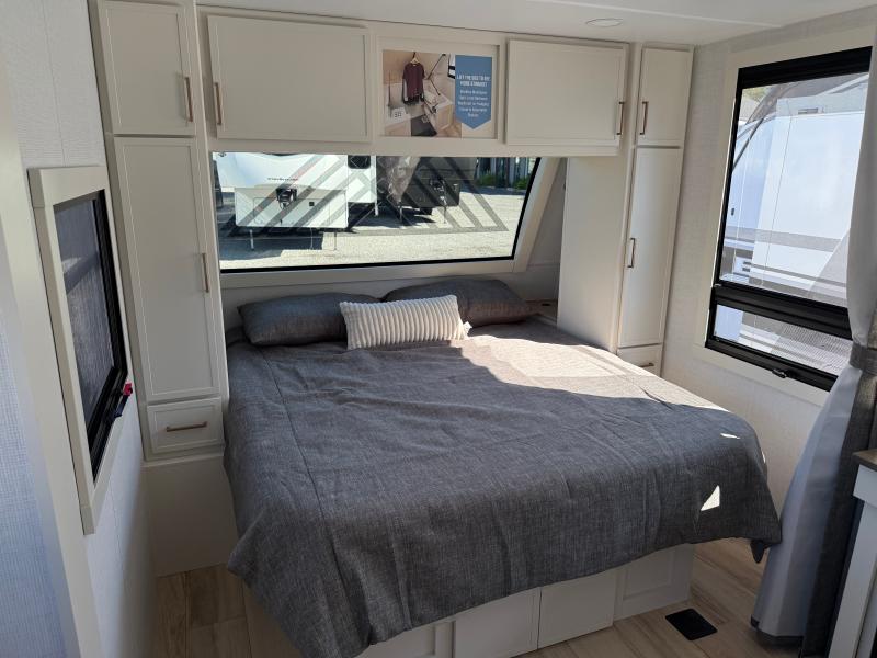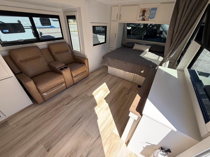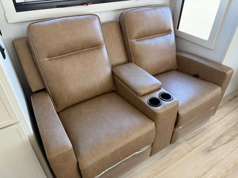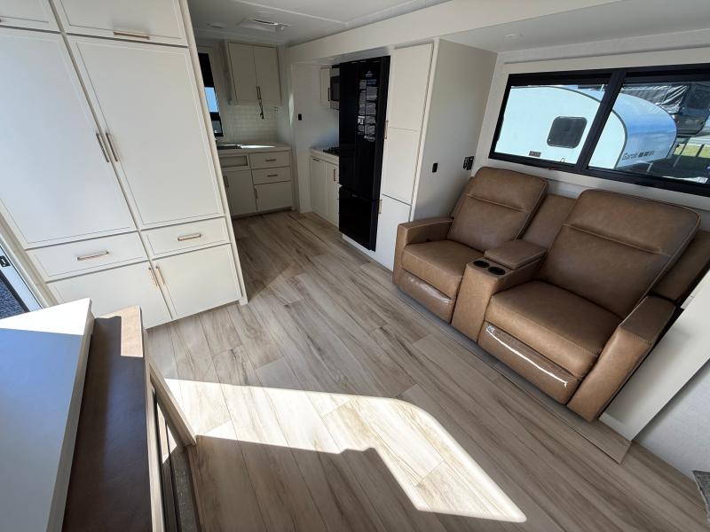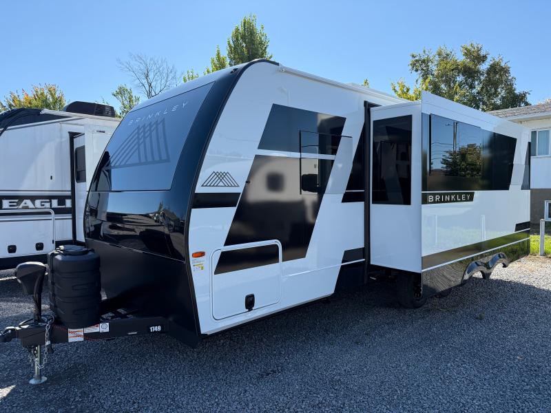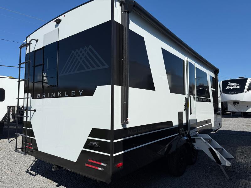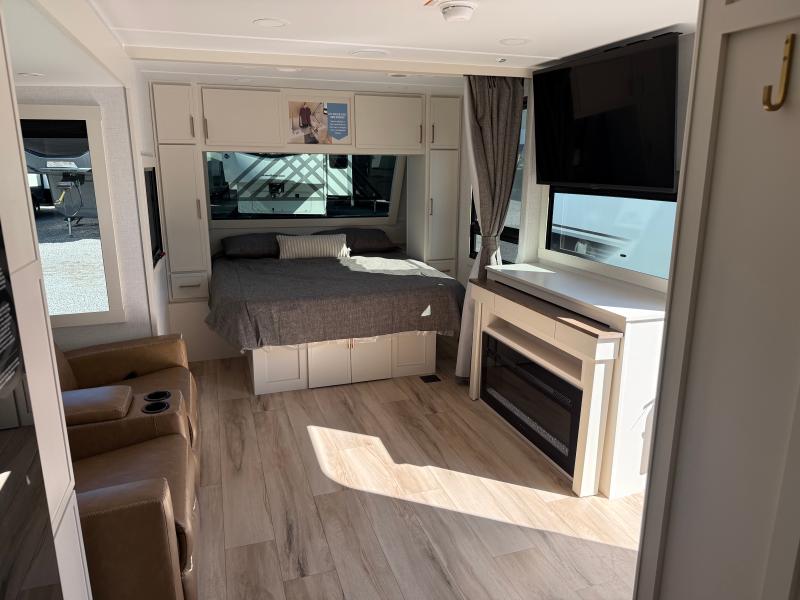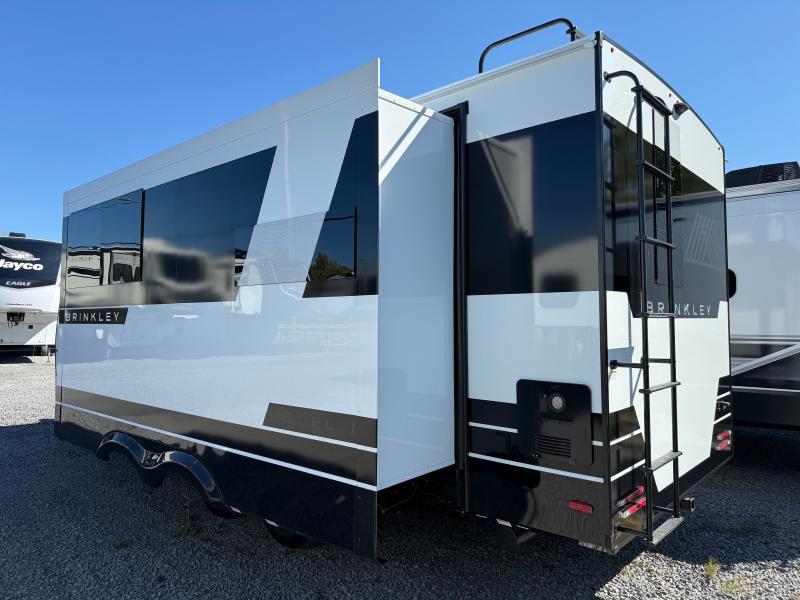 Brinkley I235 2026 une roulotte résidentielle spacieuse et confortable pour des séjours tout en détente. Elle offre un lit queen un foyer des fauteuils style théâtre un marche-pied et une échelle arrière parfaite pour profiter de chaque aventure avec style et commodité.