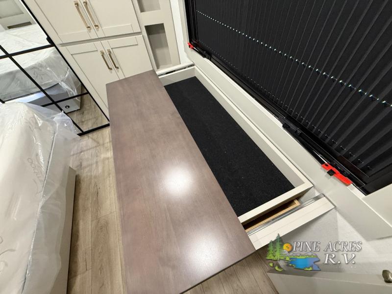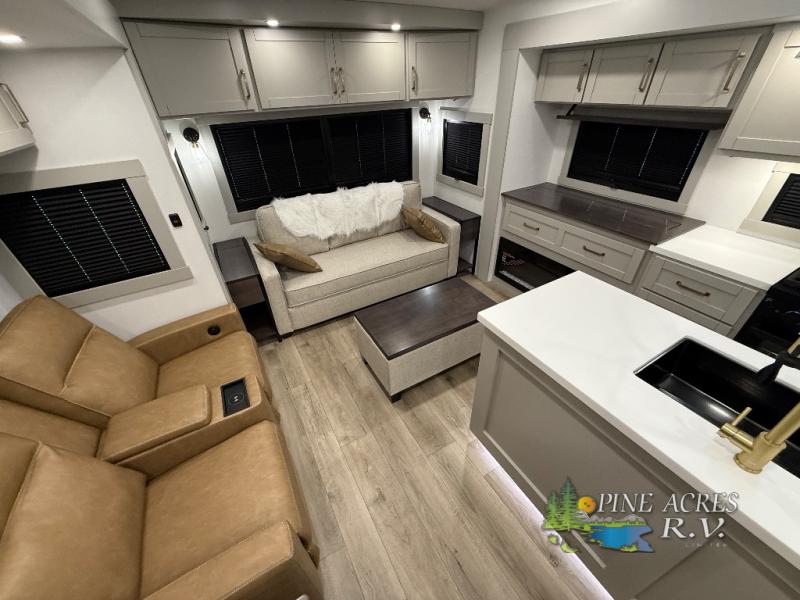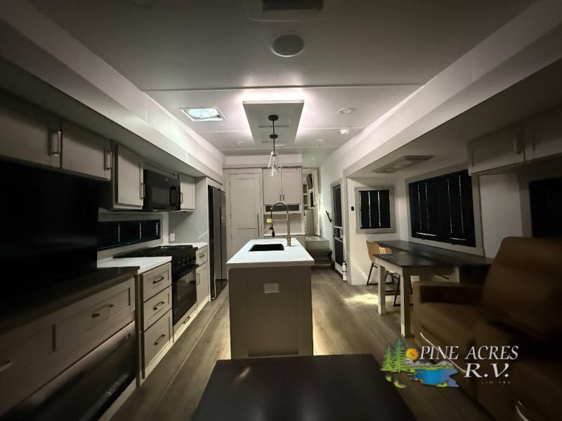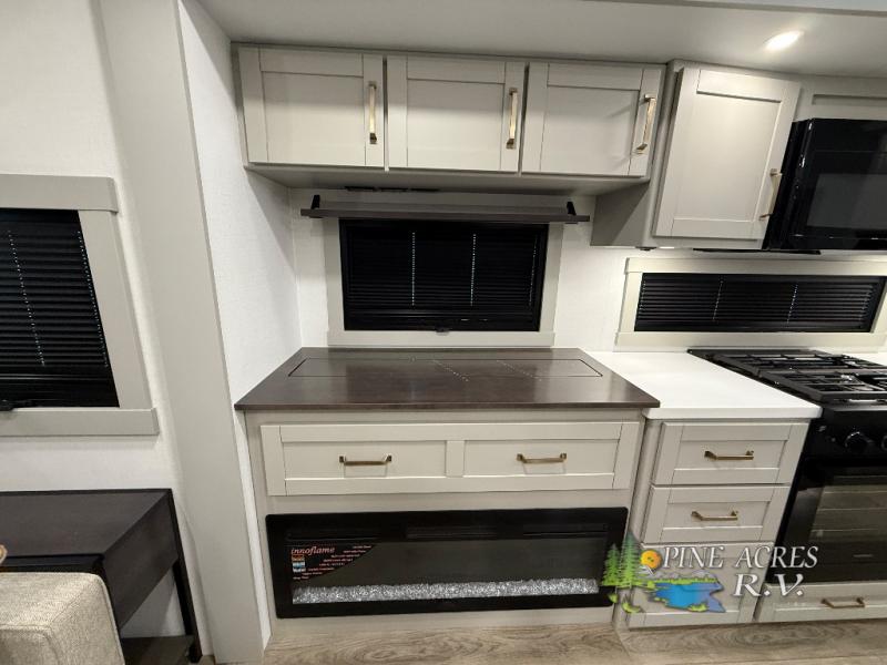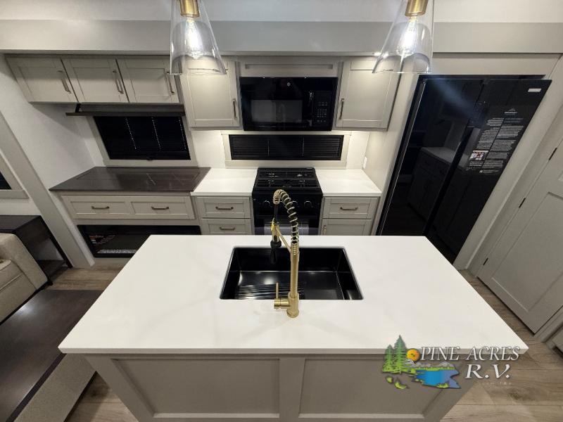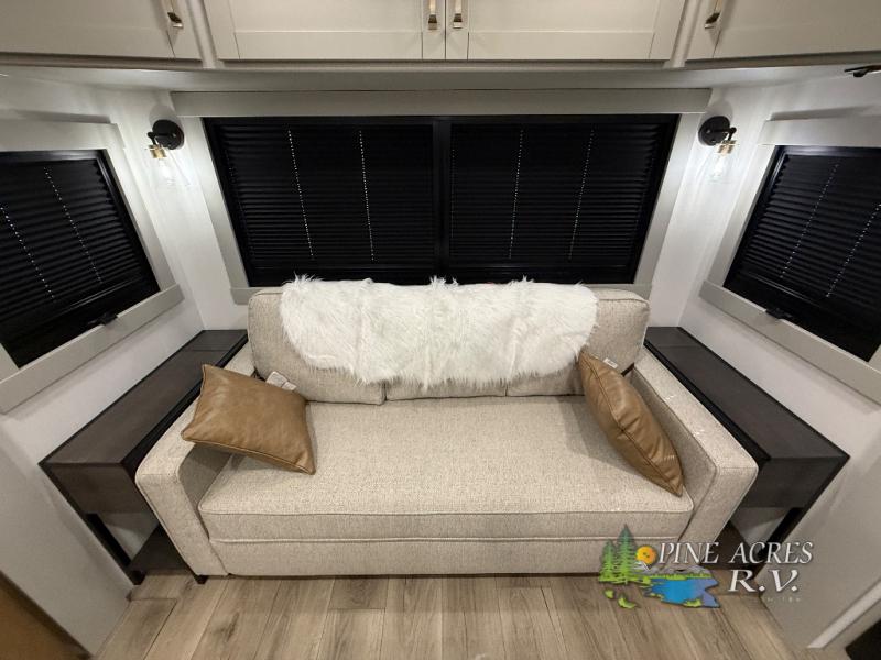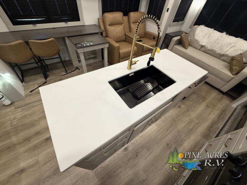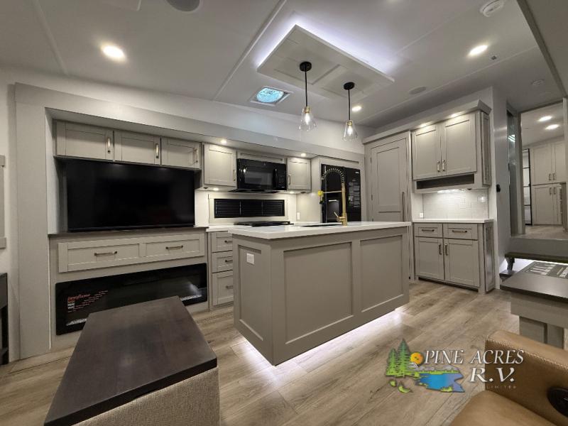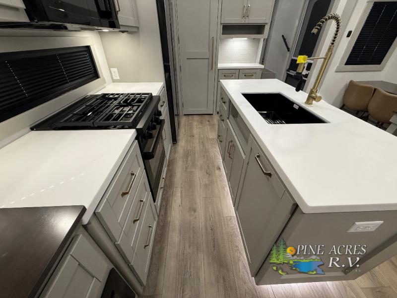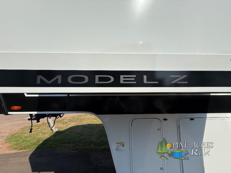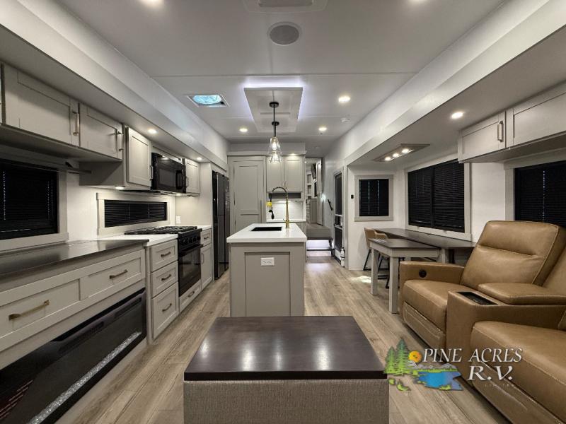 This Model Z luxury fifth wheel is bright and modern on the inside, with loads of amenities that will have you dreaming of your next trip! Enter and find a spacious combined living/kitchen space thanks to dual opposing slides. There is ample seating with a sliding desk/dining table, 62" theater seating, and a 72" tri-fold sofa along the rear wall. You can easily relax and enjoy the 50" Smart telescoping TV with a cozy fireplace below. The kitchen offers all that you need to prepare and cook meals just like home with a 16 cu. ft. refrigerator for your perishables, a 30" microwave oven, and three burner range top and oven. You will love the integrated spice rack, and the kitchen island all outfitted with dog bowls and double pull out trash bins with an integrated Stow 'N Go paper towel holder. There is also an 84" pantry with adjustable shelves for all of your canned and dry goods. Head up the steps to a private master suite with king bed slide. You can opt for the queen bed if you like. A sliding dresser top features hidden storage which is perfect for jewelry and other personal belongings. The front wardrobe features mirrored doors and the corner closet has been prepped for a stackable washer and dryer if you choose to add that option. Relax and enjoy a large bath featuring a linen cabinet, a 30" x 42" shower, and vanity with sink, plus medicine cabinet.