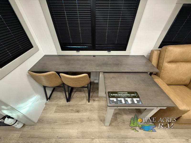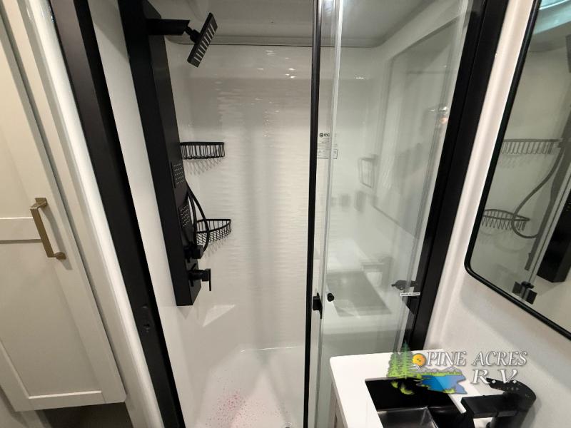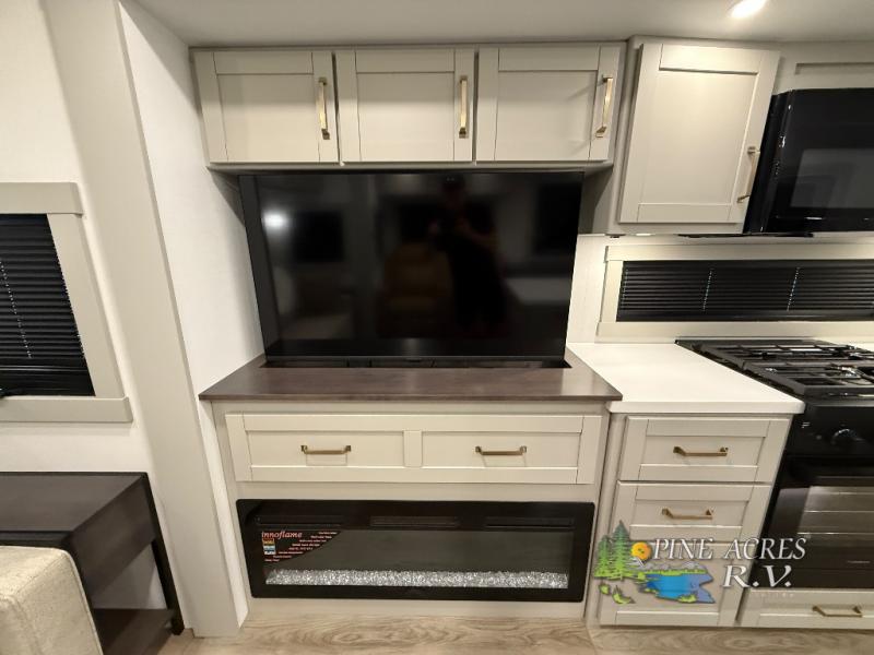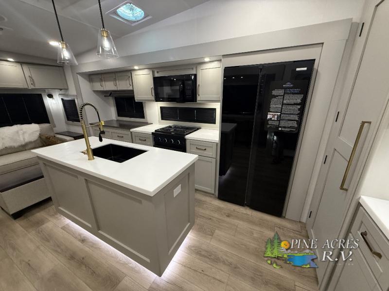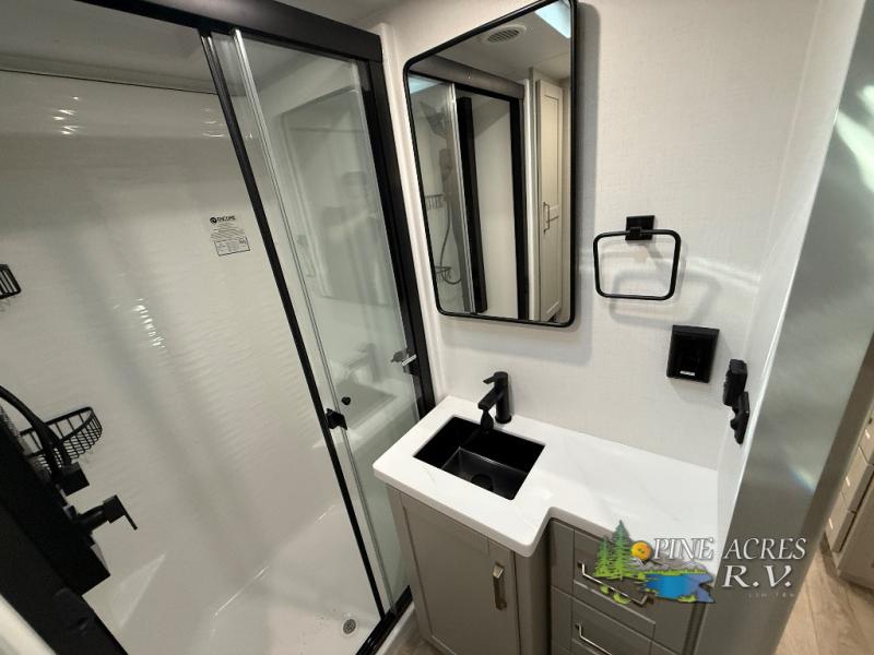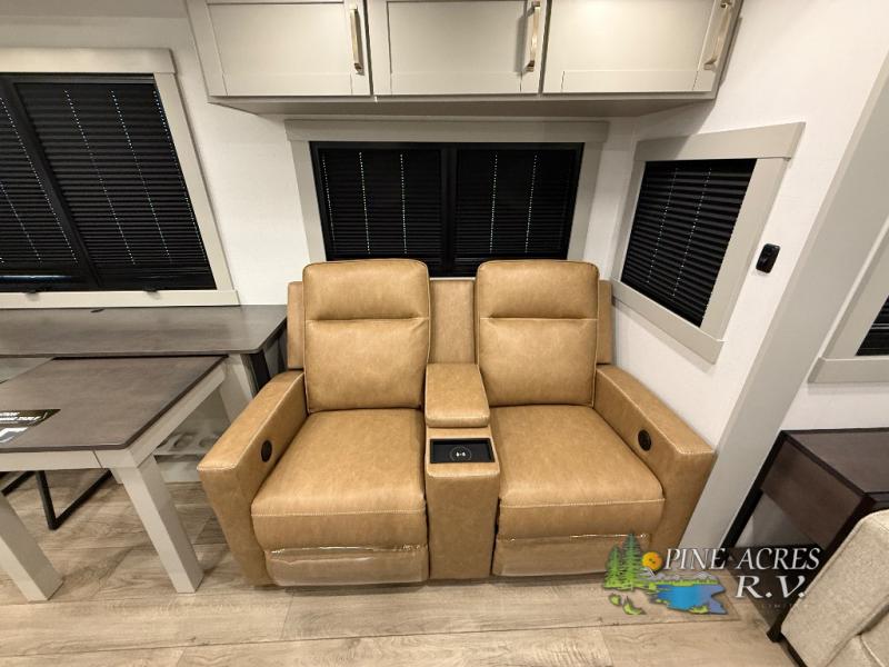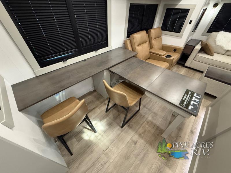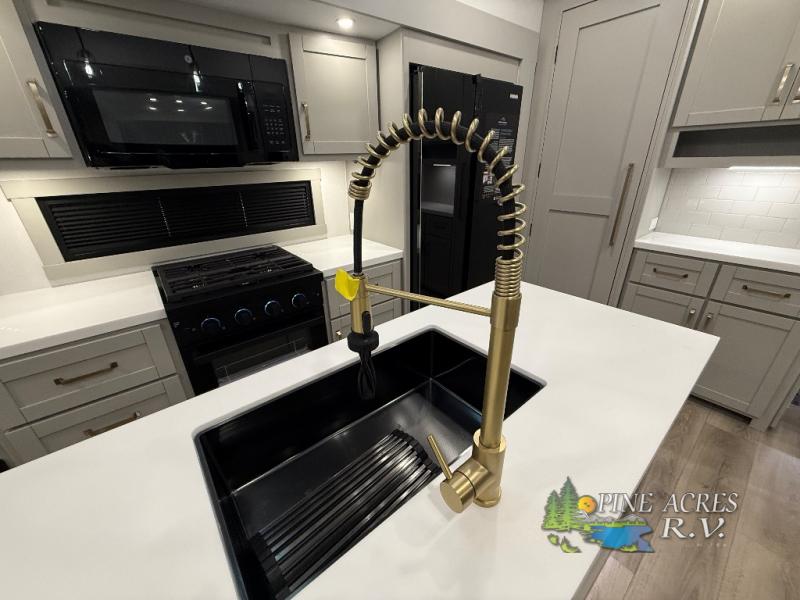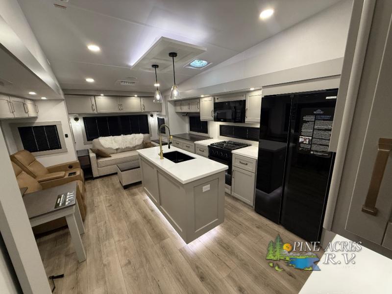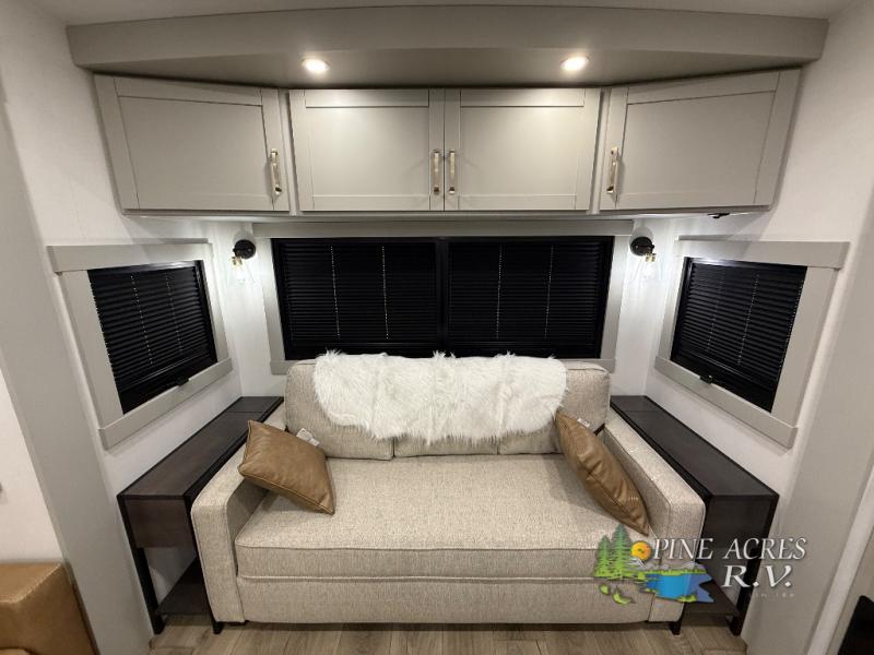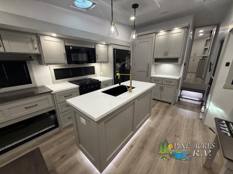 This Model Z luxury fifth wheel is bright and modern on the inside, with loads of amenities that will have you dreaming of your next trip! Enter and find a spacious combined living/kitchen space thanks to dual opposing slides. There is ample seating with a sliding desk/dining table, 62" theater seating, and a 72" tri-fold sofa along the rear wall. You can easily relax and enjoy the 50" Smart telescoping TV with a cozy fireplace below. The kitchen offers all that you need to prepare and cook meals just like home with a 16 cu. ft. refrigerator for your perishables, a 30" microwave oven, and three burner range top and oven. You will love the integrated spice rack, and the kitchen island all outfitted with dog bowls and double pull out trash bins with an integrated Stow 'N Go paper towel holder. There is also an 84" pantry with adjustable shelves for all of your canned and dry goods. Head up the steps to a private master suite with king bed slide. You can opt for the queen bed if you like. A sliding dresser top features hidden storage which is perfect for jewelry and other personal belongings. The front wardrobe features mirrored doors and the corner closet has been prepped for a stackable washer and dryer if you choose to add that option. Relax and enjoy a large bath featuring a linen cabinet, a 30" x 42" shower, and vanity with sink, plus medicine cabinet.
