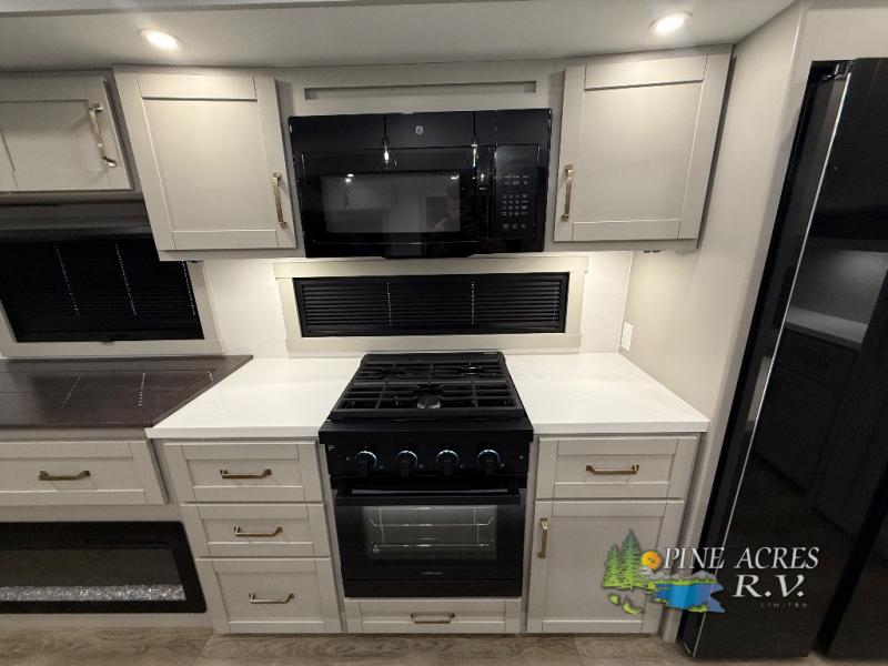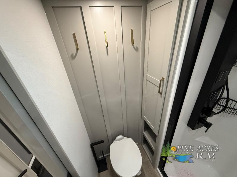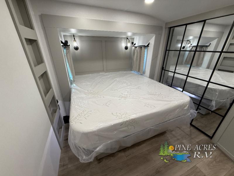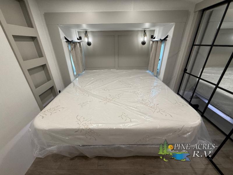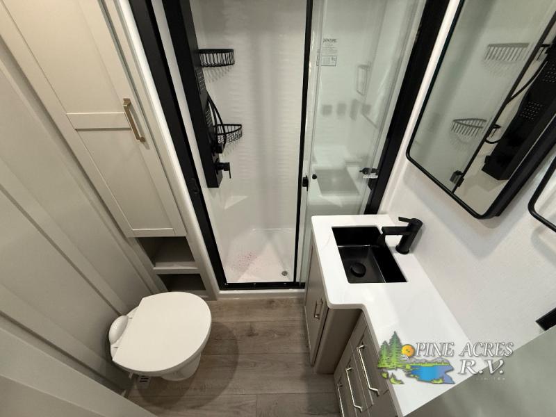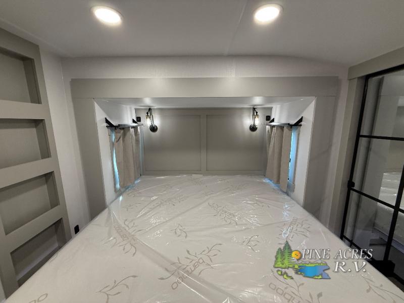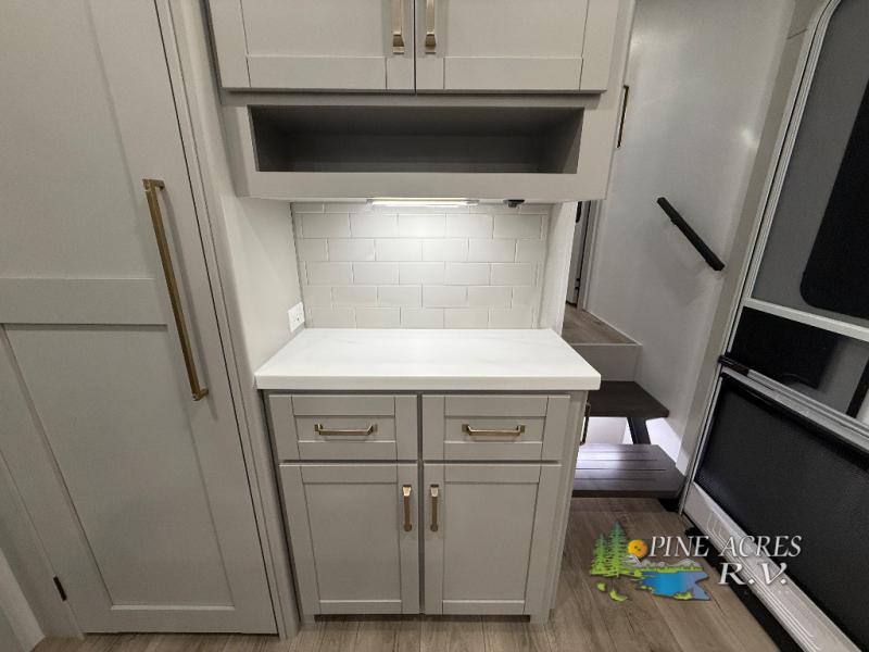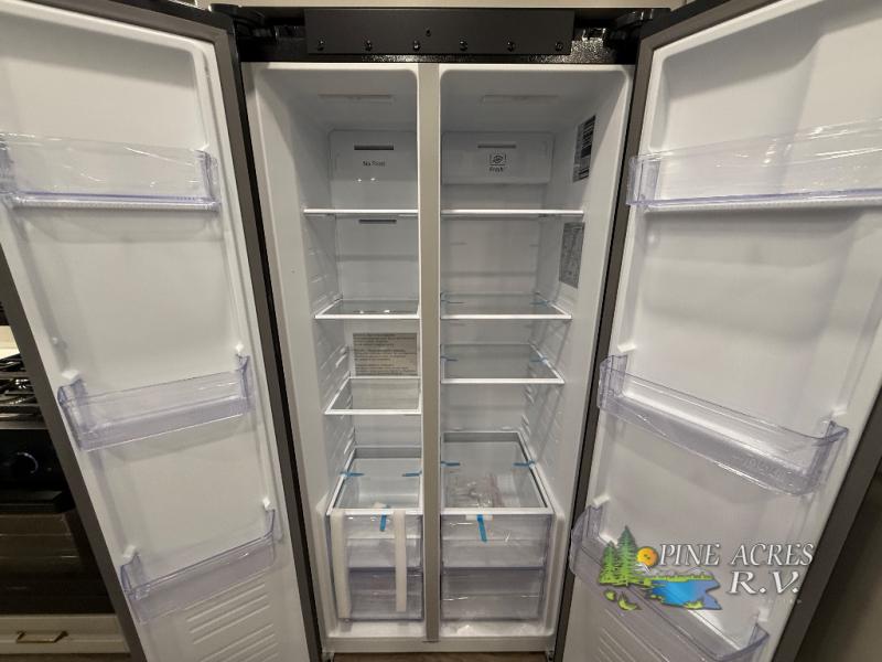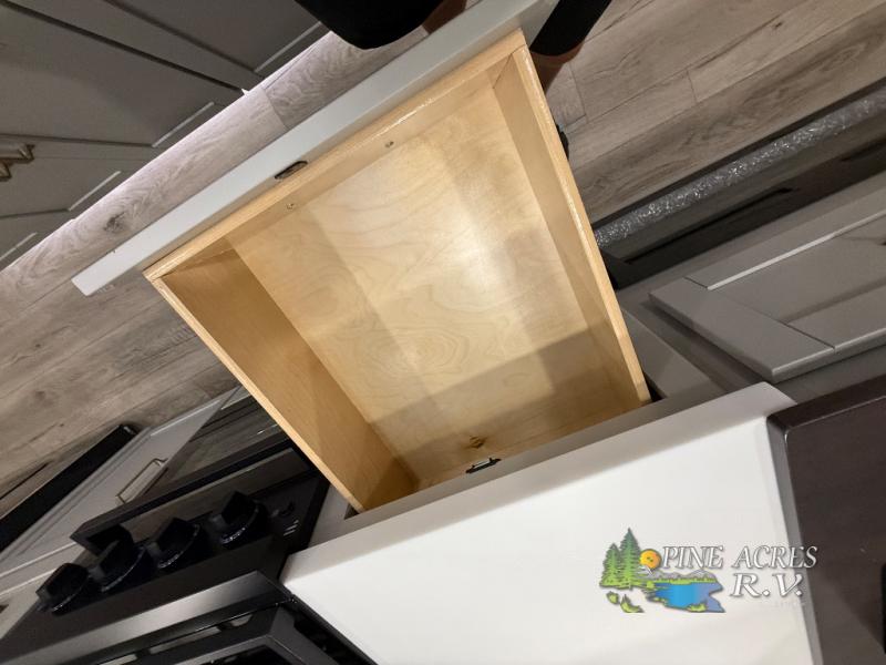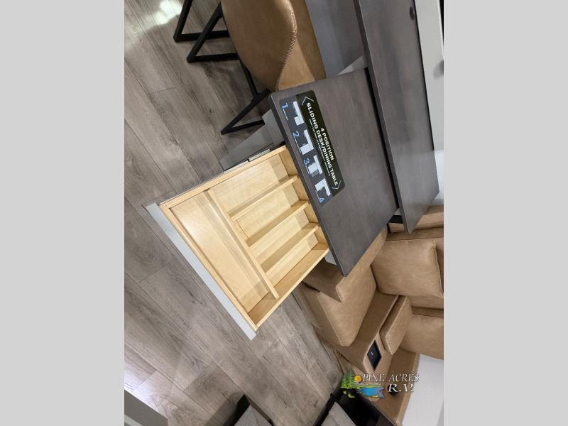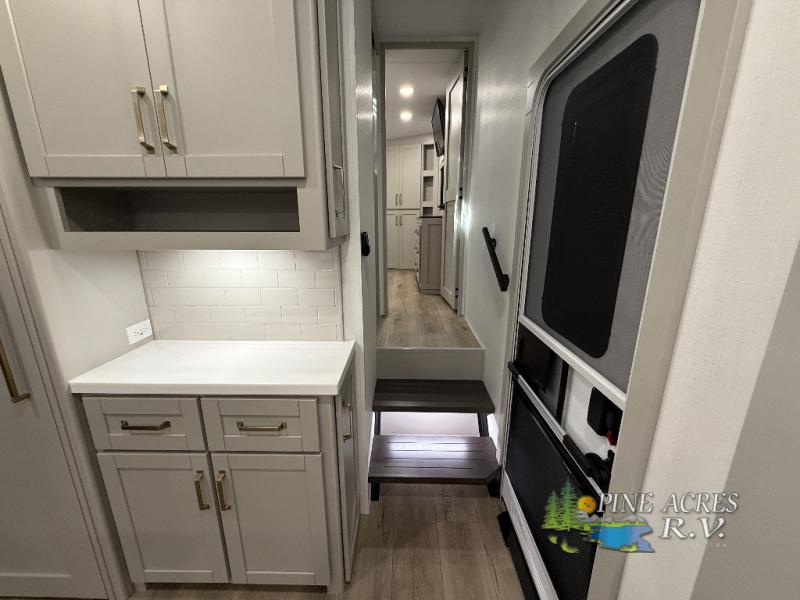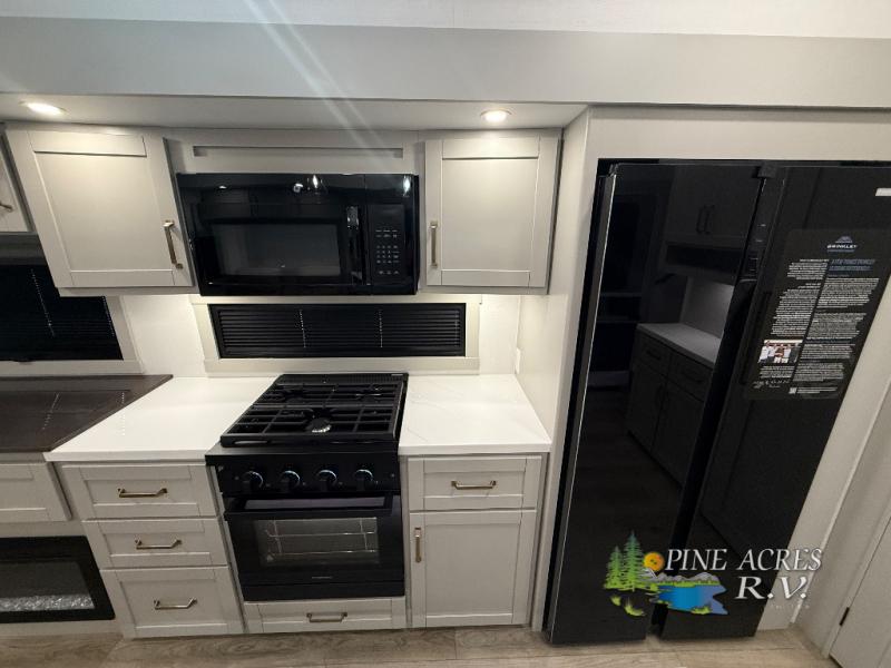 This Model Z luxury fifth wheel is bright and modern on the inside, with loads of amenities that will have you dreaming of your next trip! Enter and find a spacious combined living/kitchen space thanks to dual opposing slides. There is ample seating with a sliding desk/dining table, 62" theater seating, and a 72" tri-fold sofa along the rear wall. You can easily relax and enjoy the 50" Smart telescoping TV with a cozy fireplace below. The kitchen offers all that you need to prepare and cook meals just like home with a 16 cu. ft. refrigerator for your perishables, a 30" microwave oven, and three burner range top and oven. You will love the integrated spice rack, and the kitchen island all outfitted with dog bowls and double pull out trash bins with an integrated Stow 'N Go paper towel holder. There is also an 84" pantry with adjustable shelves for all of your canned and dry goods. Head up the steps to a private master suite with king bed slide. You can opt for the queen bed if you like. A sliding dresser top features hidden storage which is perfect for jewelry and other personal belongings. The front wardrobe features mirrored doors and the corner closet has been prepped for a stackable washer and dryer if you choose to add that option. Relax and enjoy a large bath featuring a linen cabinet, a 30" x 42" shower, and vanity with sink, plus medicine cabinet.