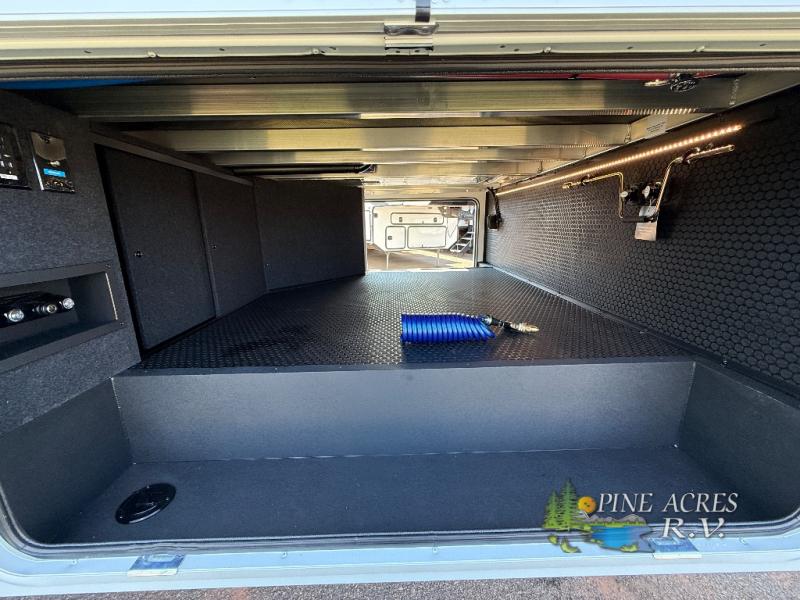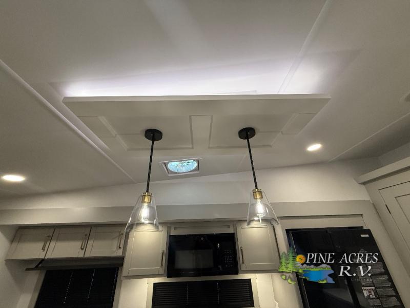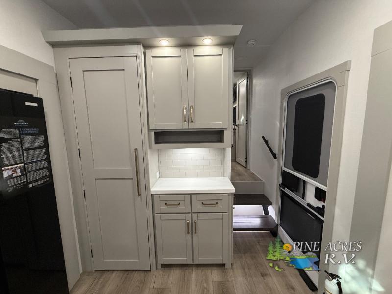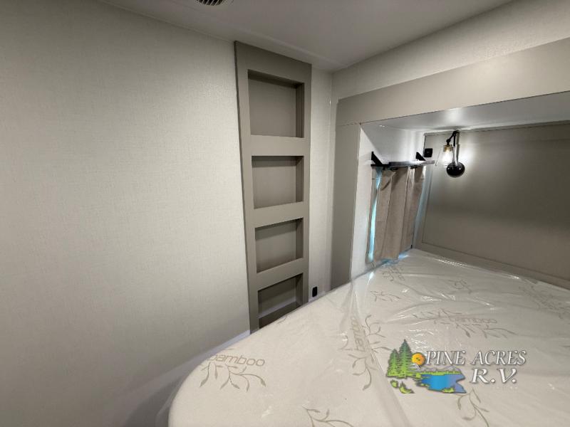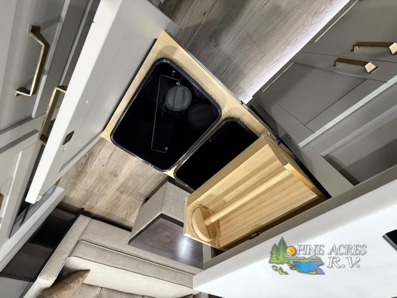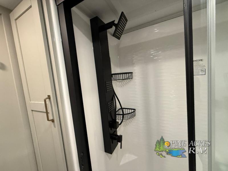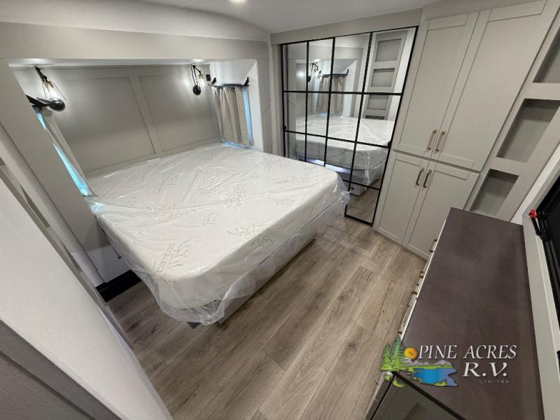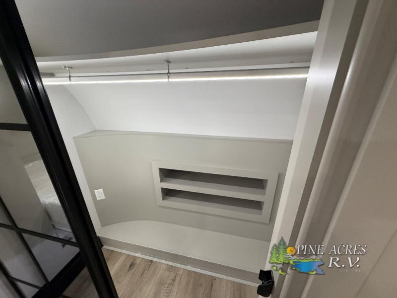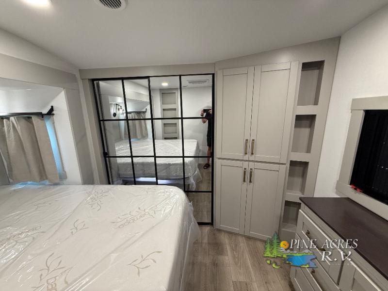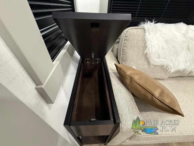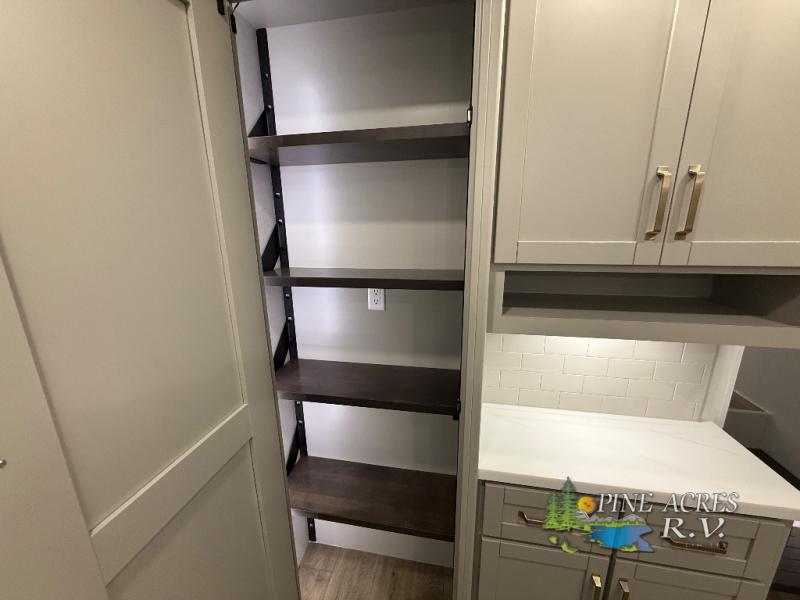 This Model Z luxury fifth wheel is bright and modern on the inside, with loads of amenities that will have you dreaming of your next trip! Enter and find a spacious combined living/kitchen space thanks to dual opposing slides. There is ample seating with a sliding desk/dining table, 62" theater seating, and a 72" tri-fold sofa along the rear wall. You can easily relax and enjoy the 50" Smart telescoping TV with a cozy fireplace below. The kitchen offers all that you need to prepare and cook meals just like home with a 16 cu. ft. refrigerator for your perishables, a 30" microwave oven, and three burner range top and oven. You will love the integrated spice rack, and the kitchen island all outfitted with dog bowls and double pull out trash bins with an integrated Stow 'N Go paper towel holder. There is also an 84" pantry with adjustable shelves for all of your canned and dry goods. Head up the steps to a private master suite with king bed slide. You can opt for the queen bed if you like. A sliding dresser top features hidden storage which is perfect for jewelry and other personal belongings. The front wardrobe features mirrored doors and the corner closet has been prepped for a stackable washer and dryer if you choose to add that option. Relax and enjoy a large bath featuring a linen cabinet, a 30" x 42" shower, and vanity with sink, plus medicine cabinet.