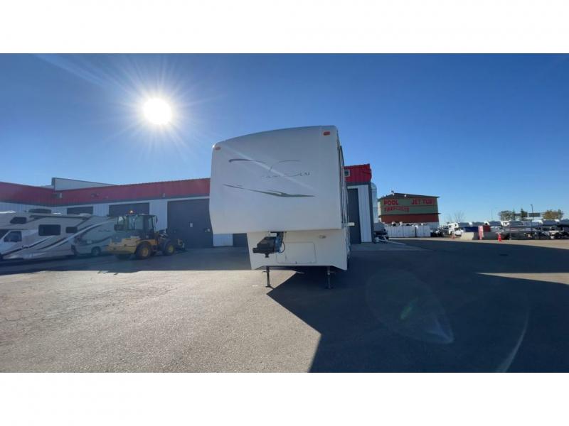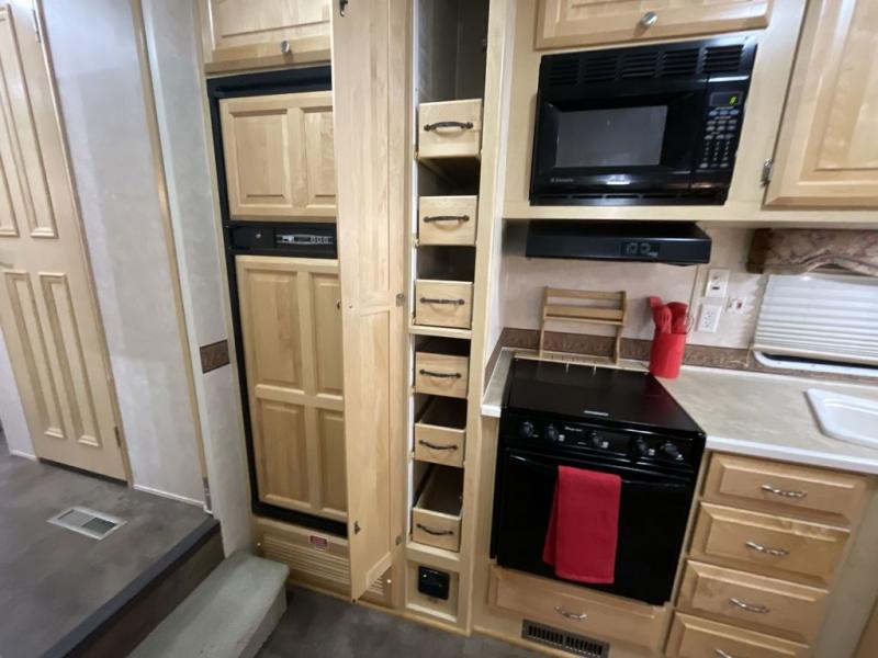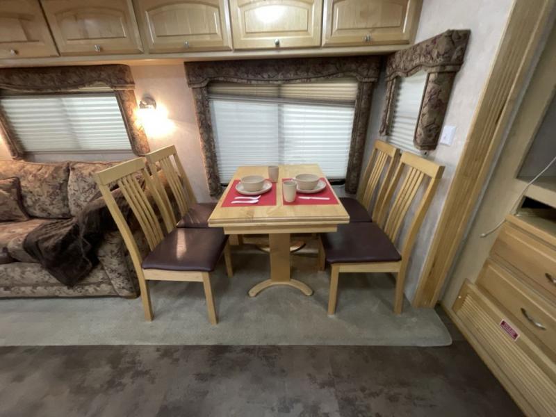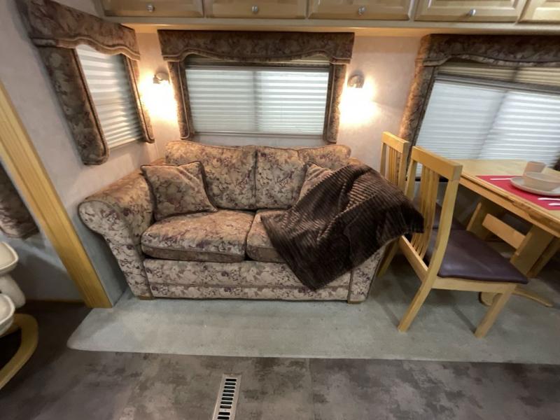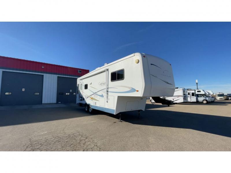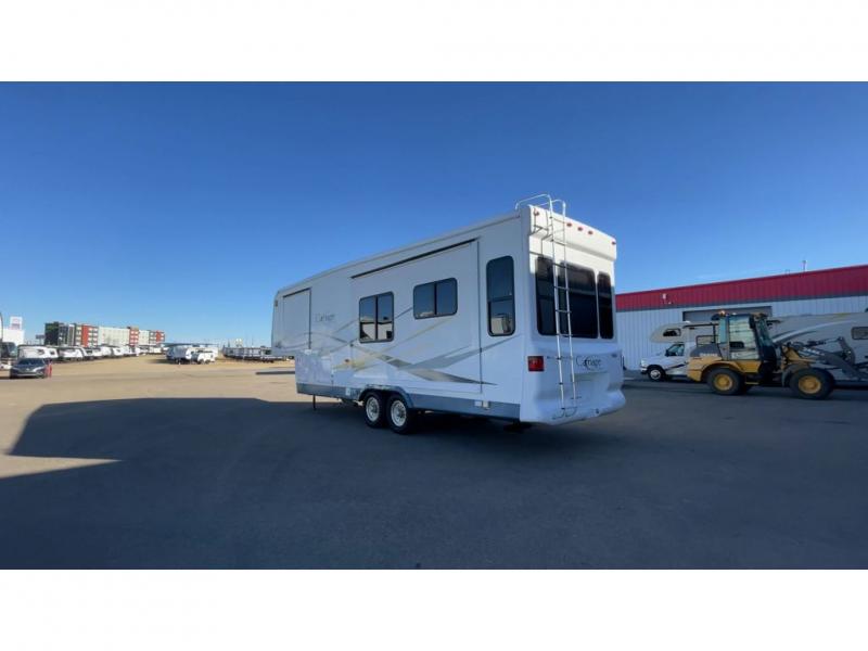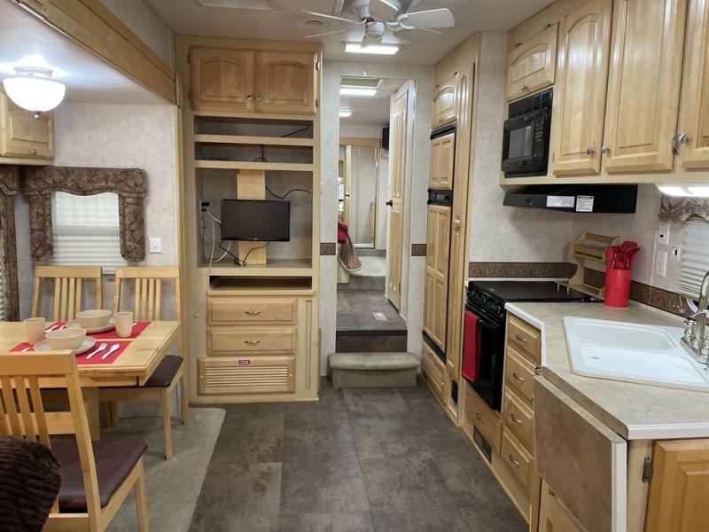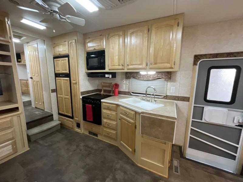 Double Slide Cameo Fifth Wheel w/Rear Living Area Including 2 Euro Chairs, End Table, Hide-A-Bed Sofa & Free Standing Dinette Slideout, Ent. Center, Ceiling Fan, Double Kitchen Sink, 3 Burner Range, Pantry, Refrigerator, Angle Shower, Private Toilet Area, Lav., Linen Cabinet, Front Queen Bed Slide, Window Seat, Drawers, Ward. w/Shelf & Much More.