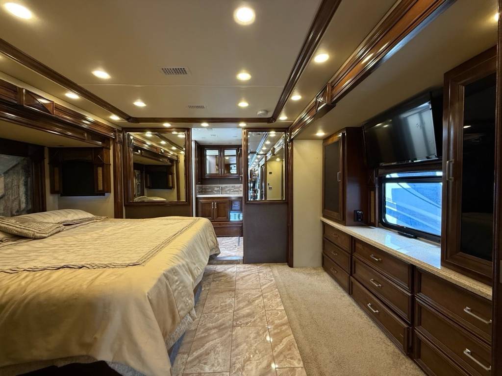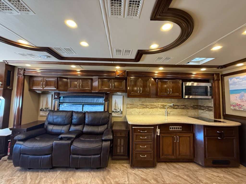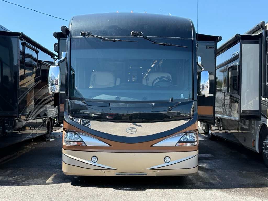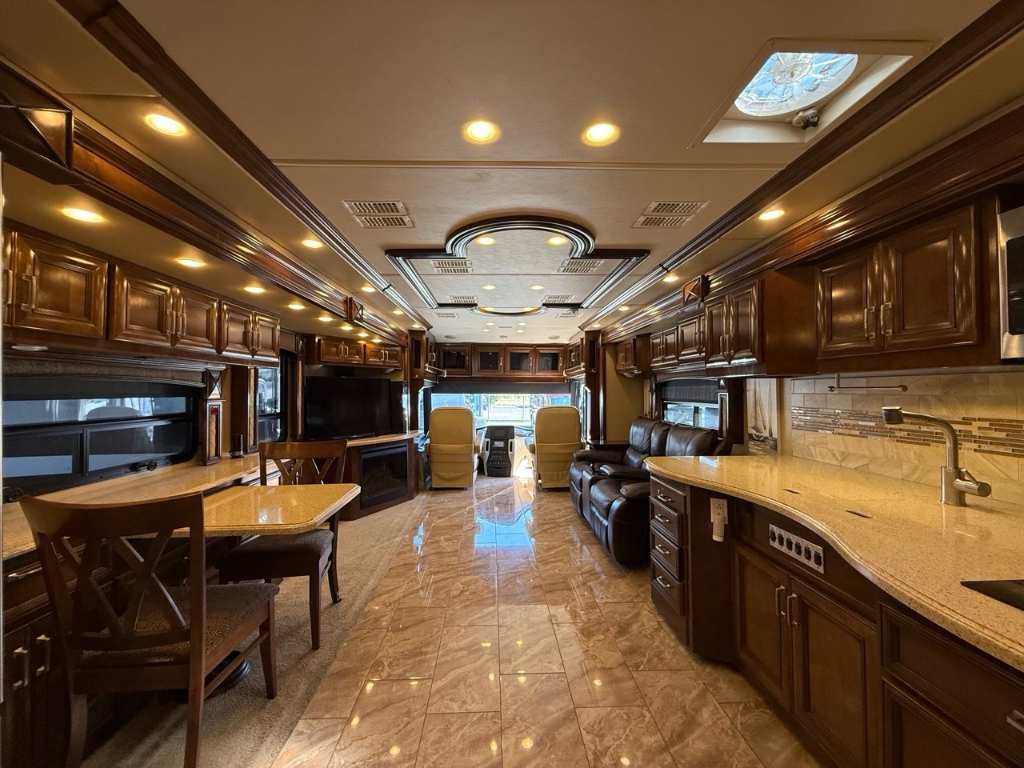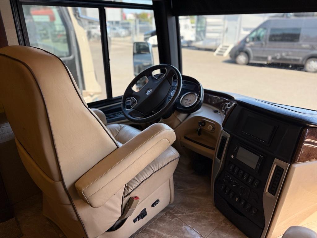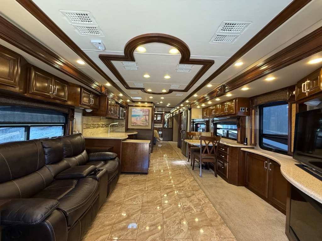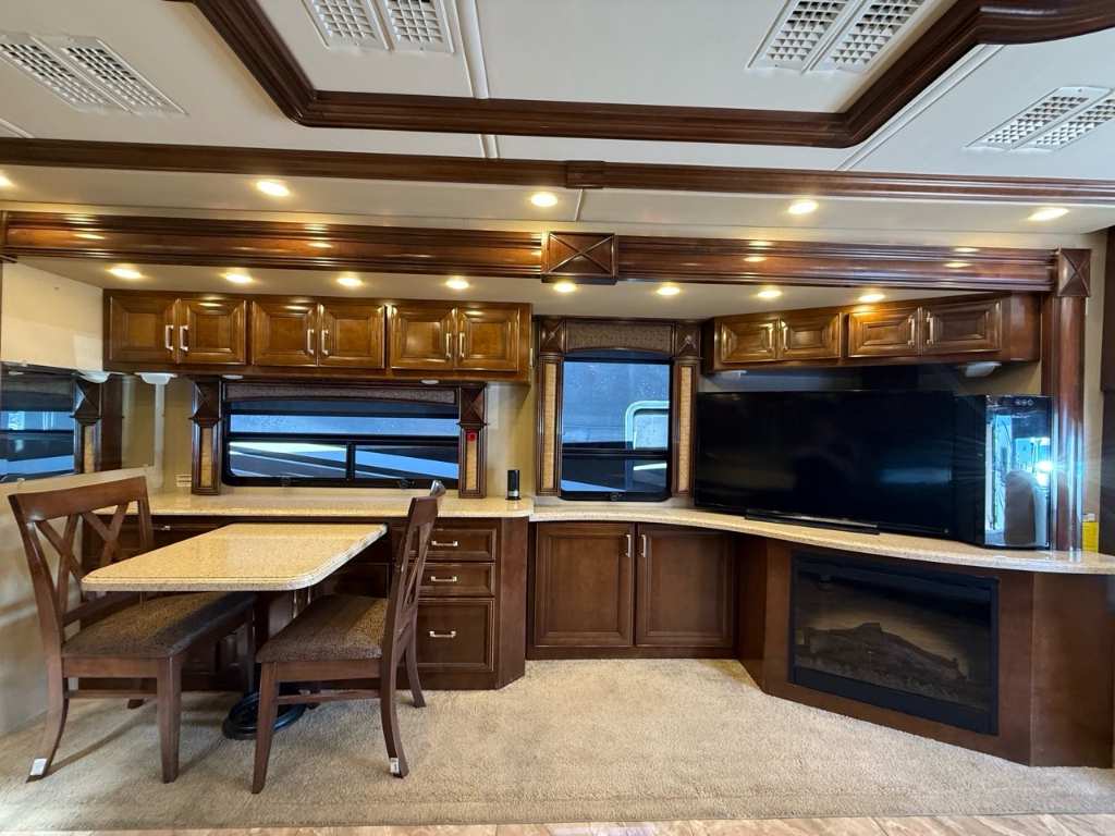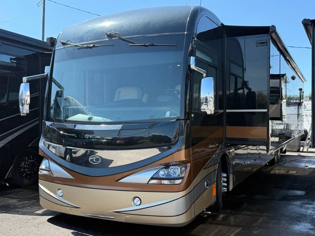 Motorisé Classe A – American Coach 2014 - 42G – Le American Coach American Revolution 42G (2014) est un motorisé Class A luxueux conçu pour les familles ou voyageurs exigeants souhaitant un véritable confort résidentiel en déplacement. Spécifications mécaniques : • Moteur : Cummins I6 Diesel Pusher • Transmission : Allison à 6 vitesses automatique • Puissance : 450 hp à 2 100 RPM • Châssis : Freightliner Liberty • Type de carburant : Diesel Dimensions et capacités : • Longueur : 42.96 pieds • Réservoir d’eau douce : 100 gal • Réservoirs d’eaux usées : 100 gal • Couchages : Jusqu’à 4 personnes 5 caractéristiques principales : • Ses trois extensions créent un vaste espace de vie intérieur une fois stationné. • Il offre un grand lit king et un canapé convertible pour accueillir plusieurs personnes confortablement. • La cuisine et le salon sont élégants avec des finitions haut de gamme et des sièges en cuir. • Il comprend deux salles de bain complètes dont une à l’arrière pour plus de commodité. • Les équipements incluent téléviseurs laveuse/sécheuse climatisation et systèmes audio intégrés. Ce motorisé combine espace luxe et équipements complets idéal pour les longs séjours ou les voyages haut de gamm