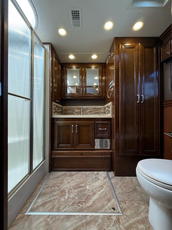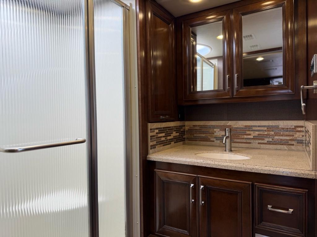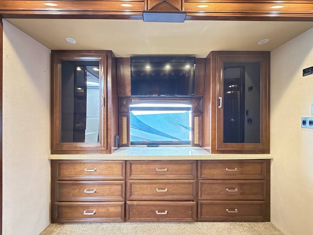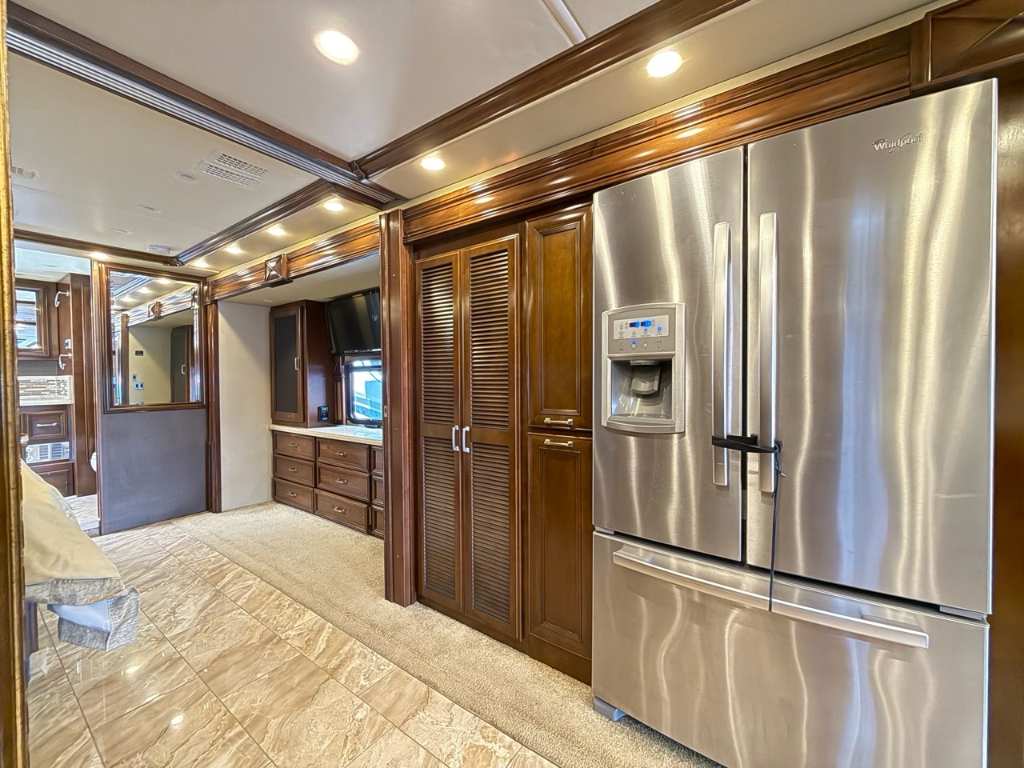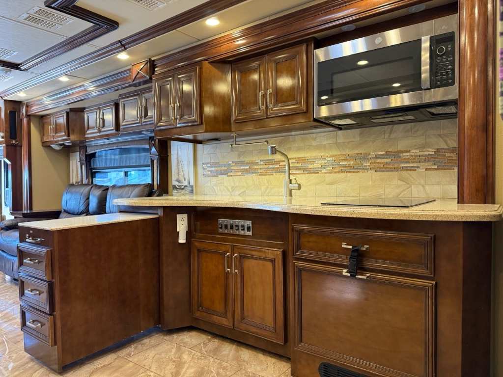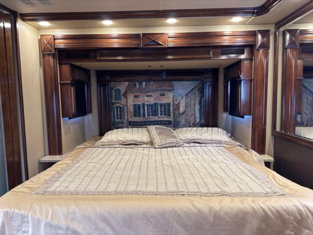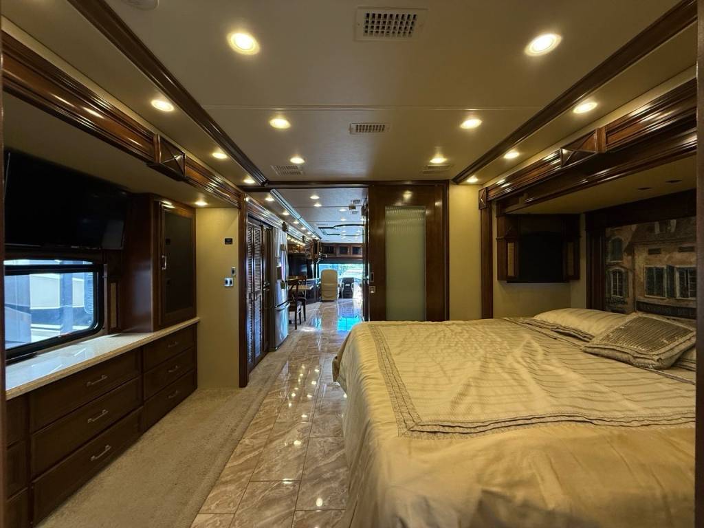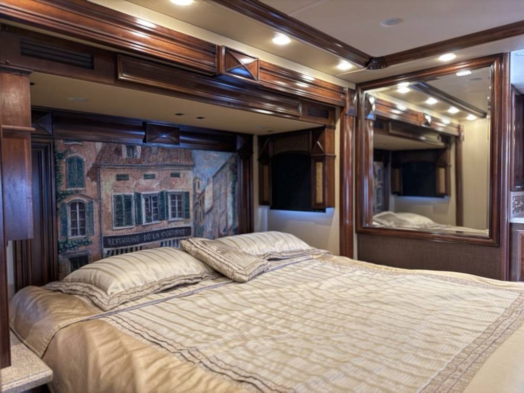 Motorisé Classe A – American Coach 2014 - 42G – Le American Coach American Revolution 42G (2014) est un motorisé Class A luxueux conçu pour les familles ou voyageurs exigeants souhaitant un véritable confort résidentiel en déplacement. Spécifications mécaniques : • Moteur : Cummins I6 Diesel Pusher • Transmission : Allison à 6 vitesses automatique • Puissance : 450 hp à 2 100 RPM • Châssis : Freightliner Liberty • Type de carburant : Diesel Dimensions et capacités : • Longueur : 42.96 pieds • Réservoir d’eau douce : 100 gal • Réservoirs d’eaux usées : 100 gal • Couchages : Jusqu’à 4 personnes 5 caractéristiques principales : • Ses trois extensions créent un vaste espace de vie intérieur une fois stationné. • Il offre un grand lit king et un canapé convertible pour accueillir plusieurs personnes confortablement. • La cuisine et le salon sont élégants avec des finitions haut de gamme et des sièges en cuir. • Il comprend deux salles de bain complètes dont une à l’arrière pour plus de commodité. • Les équipements incluent téléviseurs laveuse/sécheuse climatisation et systèmes audio intégrés. Ce motorisé combine espace luxe et équipements complets idéal pour les longs séjours ou les voyages haut de gamm