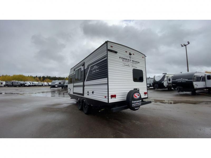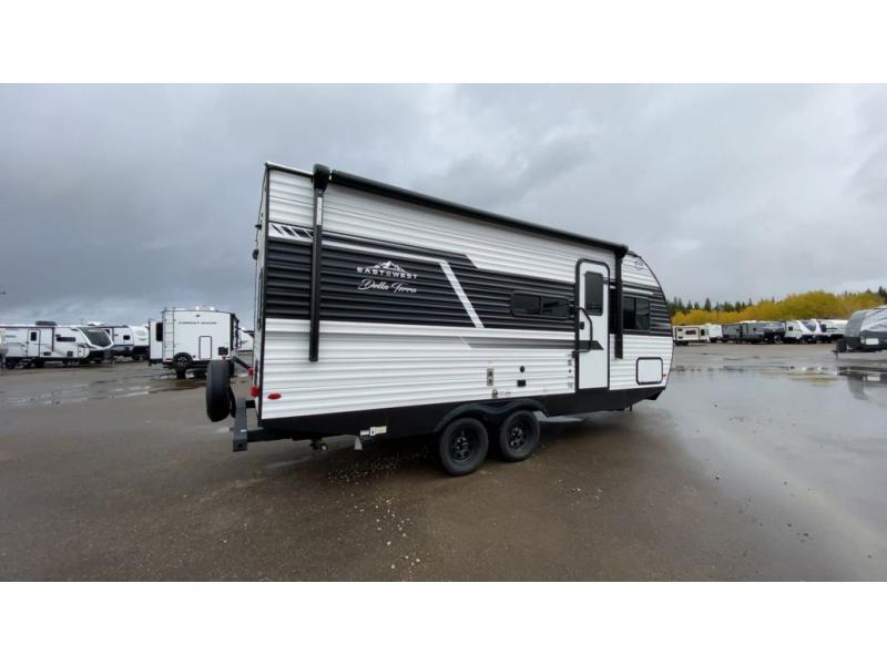 With any Della Terra LE travel trailer by EAST TO WEST, you will enjoy lightweight towing thanks to the single axle, along with many interior comforts. Each model is 8' wide with a 6' 9" interior ceiling height so you can walk around freely. There are seamless countertops also, along with motion sensor lights, a shower surround, and a USB charging station to keep your electronics ready to go. Outside, you'll find solar prep and ladder prep, an outside shower with hot and cold water, and a power awning with an LED light that will provide you with an inviting space outdoors.